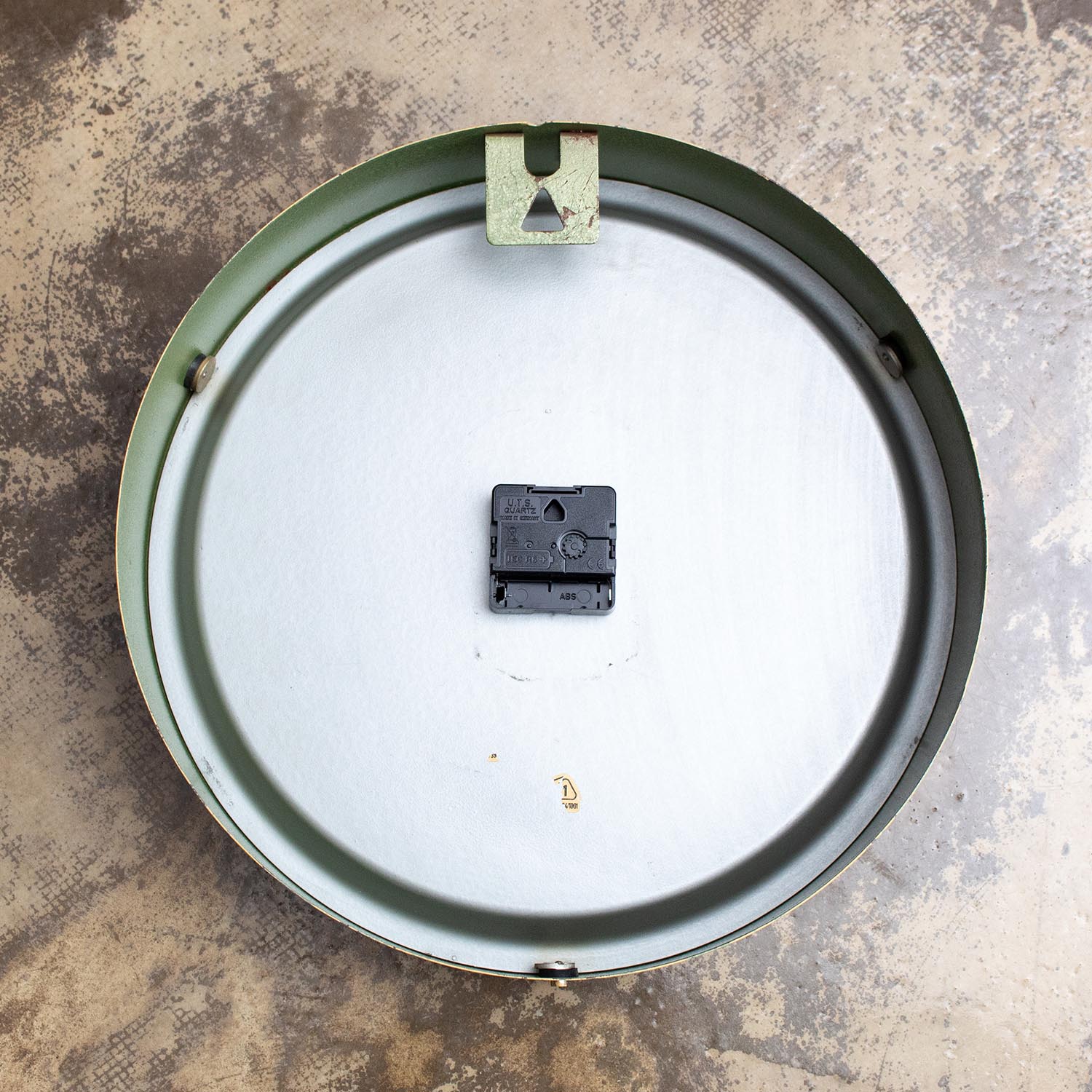 Diese alte Wanduhr war einst eine so genannte Nebenuhr und leistete ihren exakt getakteten Dienst in Fabriken, Industriebetrieben und Bahnhofshallen. Ursprünglich konnte diese Uhr (auch Slave Clock genannt) nur elektronisch mit einer Mutteruhr betrieben werden. Dies hatte den Zweck, dass wirklich jede Uhr in einer Fabrik auf die Sekunde genau gleich lief. Die vintage Wanduhr könnte deshalb in ihrem urspünglichen Zustand nicht mehr betrieben werden. Wir von JØLG haben sie deshalb mit einem hochwertigen Quarz-Uhrwerk umgebaut; dadurch erhält sie ein zweites Leben und kann nun mit einer normalen AA-Batterie betrieben werden. Ähnlich unserem Motto beim Restaurieren alter Industrielampen, heißt es auch hier: Alte Uhr – neue Technik!