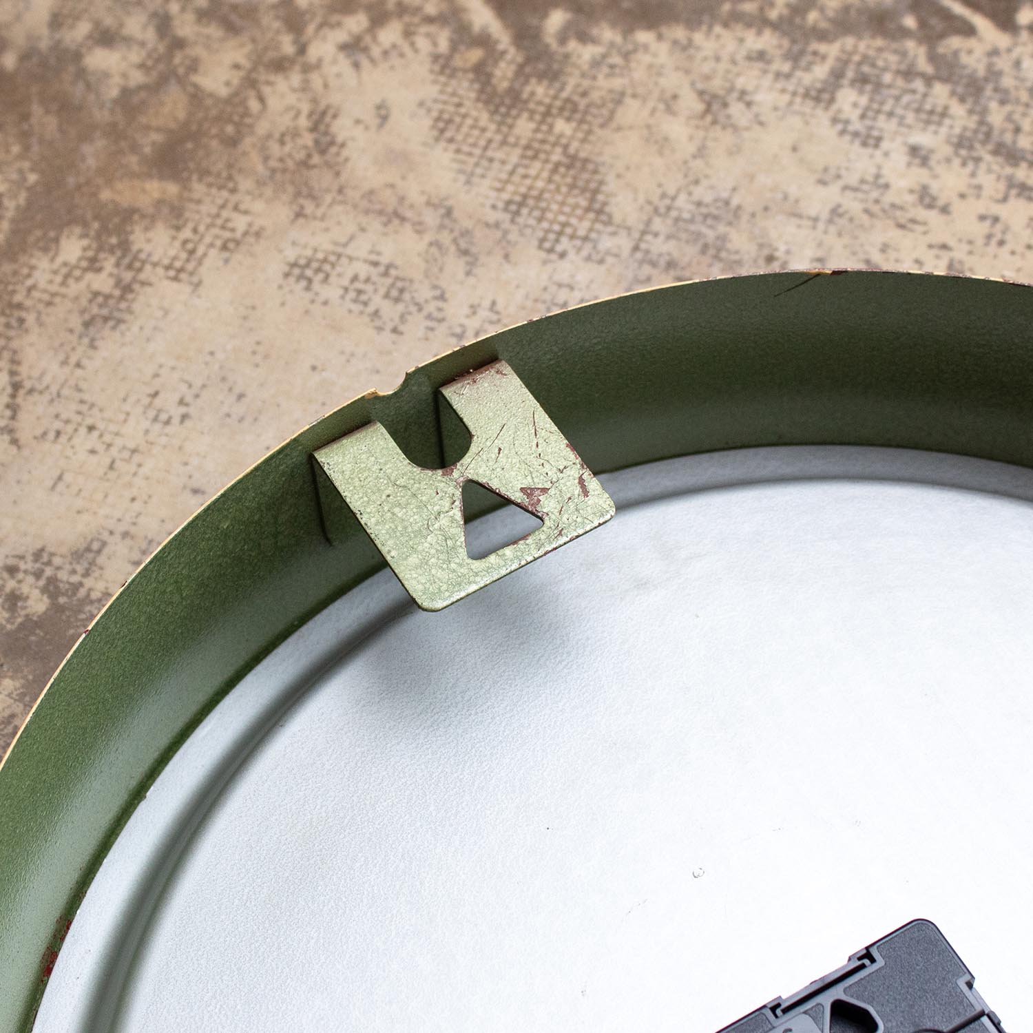 Diese alte Wanduhr war einst eine so genannte Nebenuhr und leistete ihren exakt getakteten Dienst in Fabriken, Industriebetrieben und Bahnhofshallen. Ursprünglich konnte diese Uhr (auch Slave Clock genannt) nur elektronisch mit einer Mutteruhr betrieben werden. Dies hatte den Zweck, dass wirklich jede Uhr in einer Fabrik auf die Sekunde genau gleich lief. Die vintage Wanduhr könnte deshalb in ihrem urspünglichen Zustand nicht mehr betrieben werden. Wir von JØLG haben sie deshalb mit einem Quarz-Uhrwerk umgebaut; dadurch erhält sie ein zweites Leben und kann nun mit einer normalen AA-Batterie betrieben werden. Ähnlich unserem Motto beim Restaurieren alter Industrielampen, heißt es auch hier: Alte Uhr – neue Technik! Deine einzigartige Industrie-Wanduhr: Patina: Sichtabre Spuren der Zeit. Sie wurde einst von irgendjemandem in einem traumhaften Grün gestrichen. Sie muss um 12:46 Uhr stehen geblieben sein, da die Zeiger um diese Uhrzeit von der Sonneneinstrahlung auf dem Ziffernblatt einen Abdruck hinterlassen haben. Material: Metall lackiert Farbe: Reseda/Olivgrün, Ziffernblatt Cremeweiß Hersteller: TCW, vermutlich Time Clock Wizard Uhrwerk: Umbau auf UTS Quarz Uhrwerk (ehemals Junghans, sehr leise), Betrieb mit einer AA-Batterie 1,5 V (nicht im Lieferumfang enthalten). Maße: Ø 32 cm, Tiefe ca. 7,5 cm Viel Freude mit deiner Fabrikuhr wünscht dir dein Team von JØLG. Da es sich bei den Industrieuhren um gebrauchte Antiquitäten handelt, unterliegen die Produkte gem. § 25a UStG der Differenzbesteuerung. Somit ist für diesen Artikel kein gesonderter Umsatzsteuerausweis möglich.