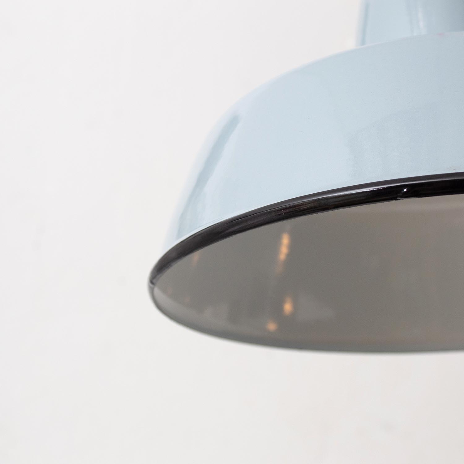 Diese Lampen wurden ursprünglich zur Beleuchtung von Werkräumen konzipiert, so sorgten Sie ursprünglich für eine gleichmäßige Ausleuchtung von Arbeitsbereichen. Durch die weiße Emaillierung im inneren der Leuchte wird dieser Effekt nochmals verstärkt. Jeder Lampenschirm ist ein Unikat und weist eine unverwechselbare Patina auf. Kühles Eisgrau trifft hier auf eine harmonische Form.