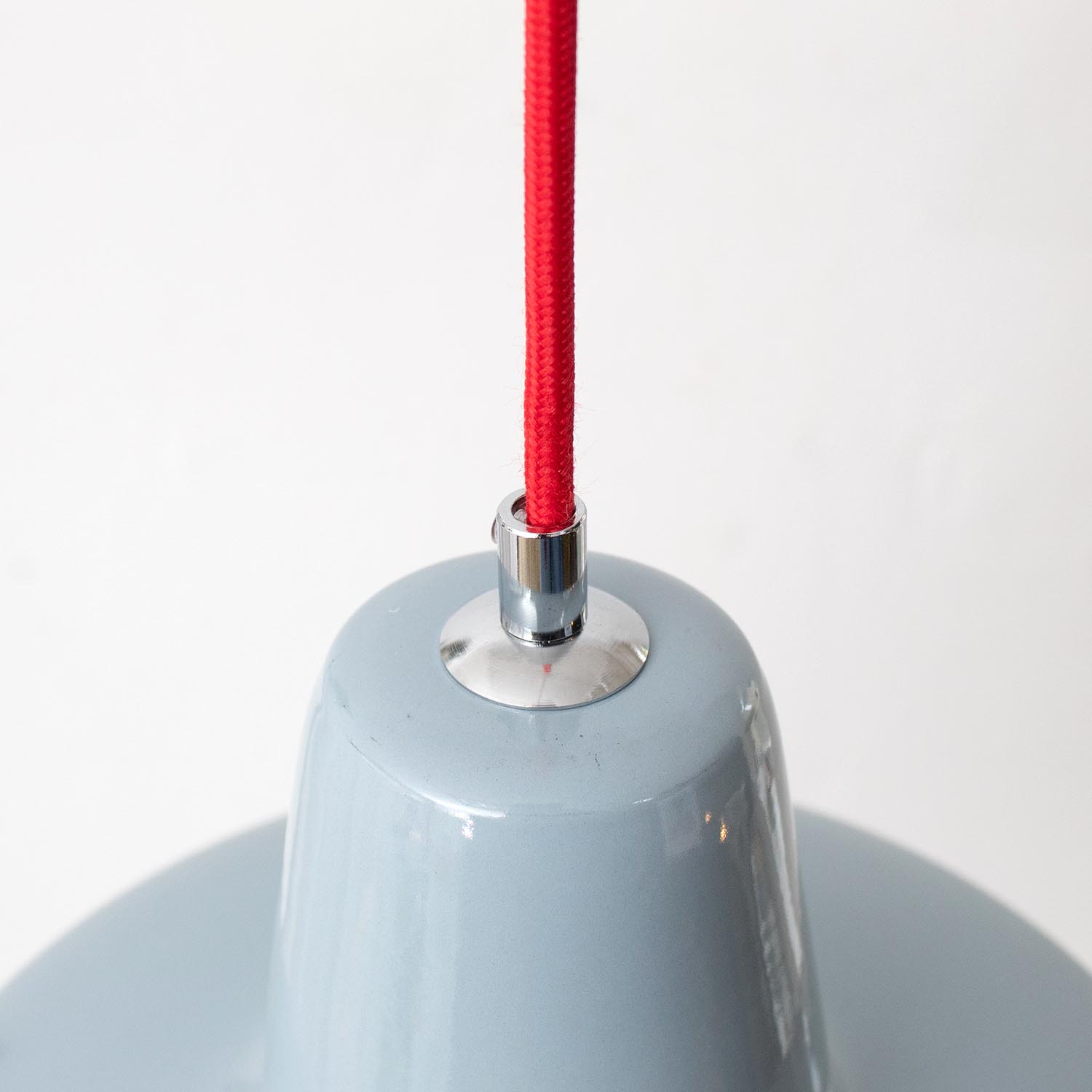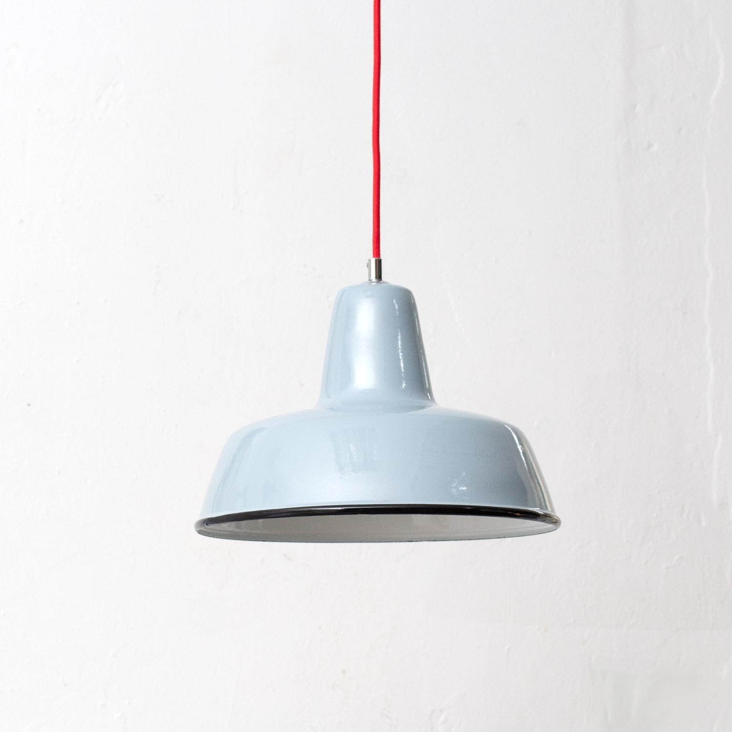 Aus alten Fabriken, Werkstätten und Scheunen in Frankreich und ganz Europa geborgen, bringt jede JØLG-Industrieleuchte ihre eigene Geschichte mit in deine vier Wände. Jeder Lampenschirm ist ein Unikat und weist eine unverwechselbare Patina auf. Patina: Sichtbare Spuren der Zeit Material: Emailliertes Metall Farbe: Außen kühles Hellgrau, Innen Weiß Herkunft/Alter: ZAOS Polen, ca. 1950 - 1960 Aufhängung: Direkt am Kabel Maße: Ø 32 cm, Höhe 21 cm zzgl. ca 3 cm Aufhängung Fassung: E27-Fassung** Textilkabel: Länge und Farbe nach deinen Wünschen. Im Grundpreis sind 1,2 Meter Textilkabel enthalten. Was haben wir mit deiner Lampe gemacht?Die Lampenschirme werden sorgfältig gereinigt, dabei wird die Patina so gut es geht erhalten. Anschließend werden die Leuchten komplett neu elektrifiziert, so dass sie den aktuellen Sicherheitsstandards entsprechen.Dein individuelles Licht mit GeschichteUm die Industrielampe zum individuellen Designstück zu machen, kannst du sie mit einem bunten Textilkabel nach deinen Vorstellungen gestalten. Wähle einfach ein Kabel aus und bestimme zusätzlich die ideale Länge des Kabels anhand deiner Gegebenheiten vor Ort. Im Grundpreis sind 1.2 m Kabel enthalten. Bei der Auswahl kannst du zwischen Längen bis 5 m wählen - auf direkte Nachfrage können wir auch ein deutlich längeres Kabel anbringen. Die Lampe richtig installierenUm die Elektroinstallation an der Decke zu verdecken kannst du entweder einen weißen oder schwarzen Baldachin aus Hartplastik (Ø 65 mm – Höhe 67 mm) wählen - dieser ist im Preis enthalten. Weitere Baldachine (z. B. Porzellan- oder Abzweig-Baldachine) sind im Shop verfügbar. In unserem Magazin findest du eine reihe hilfreicher Tipps, auch gerade dann wenn der Stromanschluss nicht an der Stelle ist, an dem die Lampe hängen soll.Wie kommt deine Lampe zu dir?Deine restaurierte JØLG Leuchte kommt fertig angeschlossen, nach deinen individuellen Vorgaben und inkl. einer Anleitung mit Tipps & Tricks, sicher und umweltfreundlich verpackt zu dir nach Hause. Wir versenden ausschließlich mit DHL GoGreen. Im Lieferumfang sind keine Leuchtmittel enthalten. Im Shop findest du aber eine passende Auswahl an LED-Leuchtmitteln. Achte hierbei auf die passende Größe des Lampensockels (E14 oder E27).Viel Freude und Inspiration beim Auswählen und Zusammenstellen deiner Lampe wünscht dir dein Team von JØLG.*Da es sich bei den Industrieleuchten um gebrauchte Antiquitäten handelt, unterliegen die Produkte gem. § 25a UStG der Differenzbesteuerung. Somit ist für diese Artikel kein gesonderter Umsatzsteuerausweis möglich.**Die Leuchte ist geeignet für Leuchtmittel aller Energieklassen. Glühlampen und Halogenlampen bis 60 Watt.
