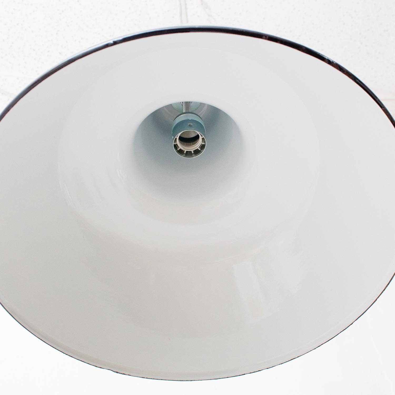 Diese Lampen wurden ursprünglich zur Beleuchtung von Montagehallen und Werkstätten konzipiert, so sorgten Sie ursprünglich für eine gleichmäßige Ausleuchtung von Arbeistbereichen. Durch die weiße Emaillierung im inneren der Leuchte wird dieser Effekt nochmals verstärkt. Jeder Lampenschirm ist ein Unikat und weist eine unverwechselbare Patina auf. Patina: Sichtbare Spuren der Zeit Material: Emailliertes Metall, Kopf aus Eisen Farbe: Außen Weiß, Innen Weiß Fundort/Herkunft: Ungarn, ca. 1950 Aufhängung: An einer Rundstahlkette Maße: Ø 36,5 cm, Höhe 23 cm zzgl. 3 cm Aufhängung Fassung: E27-Fassung** Textilkabel | Kette: Länge und Kabelfarbe nach deinen Wünschen. Im Grundpreis sind 1,0 Meter Rundstahlkette und 1,2 Meter Textilkabel enthalten. Was haben wir mit deiner Lampe gemacht?Die Lampenschirme werden sorgfältig gereinigt, dabei wird die Patina so gut es geht erhalten. Anschließend werden die Leuchten komplett neu elektrifiziert, so dass sie den aktuellen Sicherheitsstandards entsprechen.Dein individuelles Licht mit GeschichteUm die Industrielampe zum individuellen Designstück zu machen, kannst du sie mit einem bunten Textilkabel nach deinen Vorstellungen gestalten. Wähle einfach ein Kabel aus und bestimme zusätzlich die ideale Länge des Kabels anhand deiner Gegebenheiten vor Ort. Im Grundpreis sind 1.2 m Kabel enthalten. Bei der Auswahl kannst du zwischen Längen bis 5 m wählen - auf direkte Nachfrage können wir auch ein deutlich längeres Kabel anbringen. Die Lampe richtig installierenUm die Elektroinstallation an der Decke zu verdecken kannst du entweder einen weißen oder schwarzen Baldachin aus Hartplastik (Ø 65 mm – Höhe 67 mm) wählen - dieser ist im Preis enthalten. Weitere Baldachine (z. B. Porzellan- oder Abzweig-Baldachine) sind im Shop verfügbar. In unserem Magazin findest du eine reihe hilfreicher Tipps, auch gerade dann wenn der Stromanschluss nicht an der Stelle ist, an dem die Lampe hängen soll.Wie kommt deine Lampe zu dir?Deine restaurierte JØLG Leuchte kommt fertig angeschlossen, nach deinen individuellen Vorgaben und inkl. einer Anleitung mit Tipps & Tricks, sicher und umweltfreundlich verpackt zu dir nach Hause. Wir versenden ausschließlich mit DHL GoGreen. Im Lieferumfang sind keine Leuchtmittel enthalten. Im Shop findest du aber eine passende Auswahl an LED-Leuchtmitteln. Achte hierbei auf die passende Größe des Lampensockels (E14 oder E27).Viel Freude und Inspiration beim Auswählen und Zusammenstellen deiner Lampe wünscht dir dein Team von JØLG.*Da es sich bei den Industrieleuchten um gebrauchte Antiquitäten handelt, unterliegen die Produkte gem. § 25a UStG der Differenzbesteuerung. Somit ist für diese Artikel kein gesonderter Umsatzsteuerausweis möglich.**Die Leuchte ist geeignet für Leuchtmittel aller Energieklassen. Glühlampen und Halogenlampen bis 60 Watt.