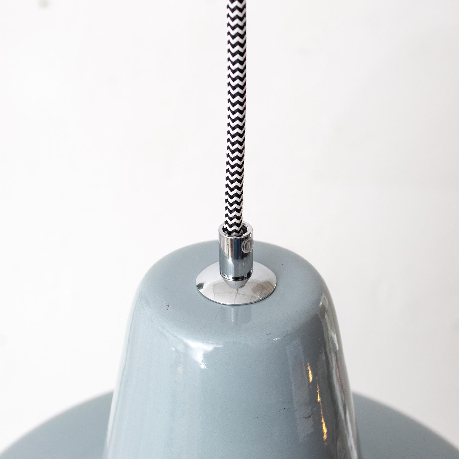 Aus alten Fabriken, Werkstätten und Scheunen in Frankreich und ganz Europa geborgen, bringt jede JØLG-Industrieleuchte ihre eigene Geschichte mit in deine vier Wände. Jeder Lampenschirm ist ein Unikat und weist eine unverwechselbare Patina auf. Patina: Sichtbare Spuren der Zeit Material: Emailliertes Metall Farbe: Außen kühles Hellgrau, Innen Weiß Herkunft/Alter: ZAOS Polen, ca. 1950 - 1960 Aufhängung: Direkt am Kabel Maße: Ø 32 cm, Höhe 21 cm zzgl. ca 3 cm Aufhängung Fassung: E27-Fassung** Textilkabel: Länge und Farbe nach deinen Wünschen. Im Grundpreis sind 1,2 Meter Textilkabel enthalten. Was haben wir mit deiner Lampe gemacht?Die Lampenschirme werden sorgfältig gereinigt, dabei wird die Patina so gut es geht erhalten. Anschließend werden die Leuchten komplett neu elektrifiziert, so dass sie den aktuellen Sicherheitsstandards entsprechen.Dein individuelles Licht mit GeschichteUm die Industrielampe zum individuellen Designstück zu machen, kannst du sie mit einem bunten Textilkabel nach deinen Vorstellungen gestalten. Wähle einfach ein Kabel aus und bestimme zusätzlich die ideale Länge des Kabels anhand deiner Gegebenheiten vor Ort. Im Grundpreis sind 1.2 m Kabel enthalten. Bei der Auswahl kannst du zwischen Längen bis 5 m wählen - auf direkte Nachfrage können wir auch ein deutlich längeres Kabel anbringen. Die Lampe richtig installierenUm die Elektroinstallation an der Decke zu verdecken kannst du entweder einen weißen oder schwarzen Baldachin aus Hartplastik (Ø 65 mm – Höhe 67 mm) wählen - dieser ist im Preis enthalten. Weitere Baldachine (z. B. Porzellan- oder Abzweig-Baldachine) sind im Shop verfügbar. In unserem Magazin findest du eine reihe hilfreicher Tipps, auch gerade dann wenn der Stromanschluss nicht an der Stelle ist, an dem die Lampe hängen soll.Wie kommt deine Lampe zu dir?Deine restaurierte JØLG Leuchte kommt fertig angeschlossen, nach deinen individuellen Vorgaben und inkl. einer Anleitung mit Tipps & Tricks, sicher und umweltfreundlich verpackt zu dir nach Hause. Wir versenden ausschließlich mit DHL GoGreen. Im Lieferumfang sind keine Leuchtmittel enthalten. Im Shop findest du aber eine passende Auswahl an LED-Leuchtmitteln. Achte hierbei auf die passende Größe des Lampensockels (E14 oder E27).Viel Freude und Inspiration beim Auswählen und Zusammenstellen deiner Lampe wünscht dir dein Team von JØLG.*Da es sich bei den Industrieleuchten um gebrauchte Antiquitäten handelt, unterliegen die Produkte gem. § 25a UStG der Differenzbesteuerung. Somit ist für diese Artikel kein gesonderter Umsatzsteuerausweis möglich.**Die Leuchte ist geeignet für Leuchtmittel aller Energieklassen. Glühlampen und Halogenlampen bis 60 Watt.