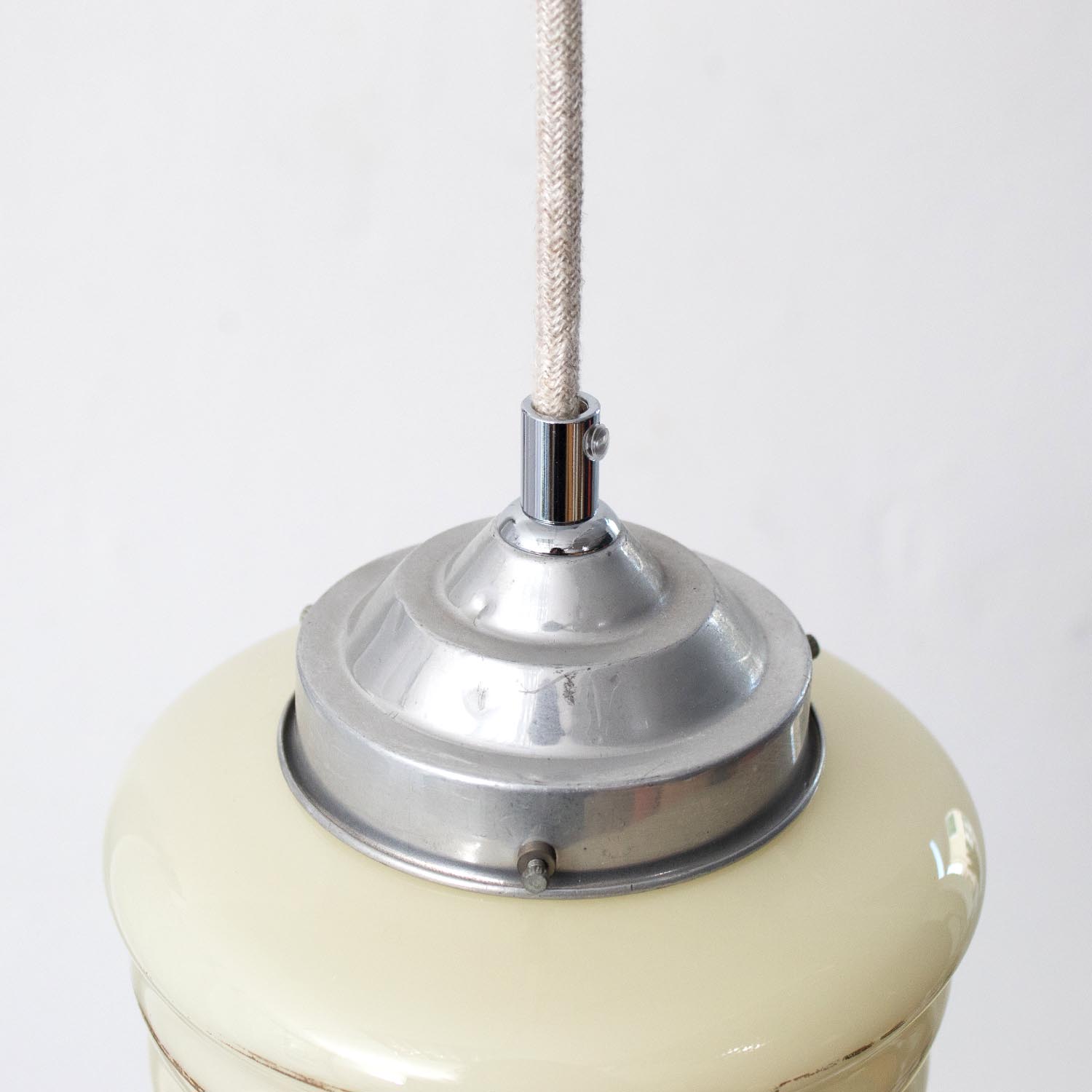 Diese sachlichen Opalglas-Kugelleuchten stammen aus alten französischen Wohnhäusern. Opalglas (auch Kryolithglas genannt) sieht aus wie milchiges oder satiniertes Glas, mit dem Unterschied, dass Opalglas mehr Glanz hat. Opalglas ist ein lichtdurchlässiges, aber nicht durchsichtiges Glas. Das durchscheinende Licht ist sanft und blendet nicht. Mit Opalglas versehene Leuchten wurden bis ca. 1920 nur im industriellen Bereich eingesetzt. 1923 entwarfen die beiden Produktdesigner Wilhelm Wagenfeld und Carl Jakob Jucker in der Metallwerkstatt des Weimarer Bauhaus die erste Leuchte, die durch das verwendete Opalglas gestreutes Licht auch in den Wohnraum brachte. Die „Bauhaus-Leuchte“ ist heute besser bekannt als „Wagenfeld-Leuchte“ und zählt zu den Designklassikern des 20. Jahrhunderts Seit diesem Zeitpunkt hat sich opales Glas – vor allem im späten Art déco - über viele Epochen und Stile hinweg bis heute als modernes und vielseitiges Glas im Leuchtendesign etabliert. Patina: Wenige Spuren der Zeit Material: Opalglas Farbe: Weiß Aufhängung: Direkt am Kabel Fundort: Frankreich, von ca. 1930-1950 Maße: Ø 20 cm, Höhe mit Kappe 23 cm zzgl. ca. 2 cm Fassung Fassung: E27-Fassung** Textilkabel: Länge und Farbe nach deinen Wünschen. Im Grundpreis sind 1,2 Meter Textilkabel enthalten. Was haben wir mit deiner Lampe gemacht?Die Lampenschirme werden sorgfältig gereinigt, dabei wird die Patina so gut es geht erhalten. Anschließend werden die Leuchten komplett neu elektrifiziert, so dass sie den aktuellen Sicherheitsstandards entsprechen.Dein individuelles Licht mit GeschichteUm die Industrielampe zum individuellen Designstück zu machen, kannst du sie mit einem bunten Textilkabel nach deinen Vorstellungen gestalten. Wähle einfach ein Kabel aus und bestimme zusätzlich die ideale Länge des Kabels anhand deiner Gegebenheiten vor Ort. Im Grundpreis sind 1.2 m Kabel enthalten. Bei der Auswahl kannst du zwischen Längen bis 5 m wählen - auf direkte Nachfrage können wir auch ein deutlich längeres Kabel anbringen. Die Lampe richtig installierenUm die Elektroinstallation an der Decke zu verdecken kannst du entweder einen weißen oder schwarzen Baldachin aus Hartplastik (Ø 65 mm – Höhe 67 mm) wählen - dieser ist im Preis enthalten. Weitere Baldachine (z. B. Porzellan- oder Abzweig-Baldachine) sind im Shop verfügbar. In unserem Magazin findest du eine reihe hilfreicher Tipps, auch gerade dann wenn der Stromanschluss nicht an der Stelle ist, an dem die Lampe hängen soll.Wie kommt deine Lampe zu dir?Deine restaurierte JØLG Leuchte kommt fertig angeschlossen, nach deinen individuellen Vorgaben und inkl. einer Anleitung mit Tipps & Tricks, sicher und umweltfreundlich verpackt zu dir nach Hause. Wir versenden ausschließlich mit DHL GoGreen. Im Lieferumfang sind keine Leuchtmittel enthalten. Im Shop findest du aber eine passende Auswahl an LED-Leuchtmitteln. Achte hierbei auf die passende Größe des Lampensockels (E14 oder E27).Viel Freude und Inspiration beim Auswählen und Zusammenstellen deiner Lampe wünscht dir dein Team von JØLG.*Da es sich bei den Industrieleuchten um gebrauchte Antiquitäten handelt, unterliegen die Produkte gem. § 25a UStG der Differenzbesteuerung. Somit ist für diese Artikel kein gesonderter Umsatzsteuerausweis möglich.**Die Leuchte ist geeignet für Leuchtmittel aller Energieklassen. Glühlampen und Halogenlampen bis 60 Watt.
