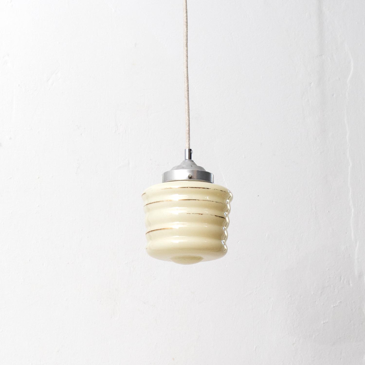 Diese zierliche Schönheit stammt aus einem alten französischen Jugendstilhaus. Liebevoll restauriert schmücken diese Vintage-Lampen jetzt Küchen und Esszimmer, Flure und Wohnzimmer, Kinder- und Arbeitszimmer. Patina: Wenige Spuren der Zeit Material: Glas mit geografischem Muster, 1920er JahreHerkunft/Fundort: Frankreich, ca. 1910 Aufhängung: Direkt am Kabel Maße: Ø 22 cm, Höhe 26 cm zzgl. ca 2 cm Fassung Fassung: E27-Fassung** Textilkabel: Länge und Farbe nach deinen Wünschen. Im Grundpreis sind 1,2 Meter Textilkabel enthalten. Was haben wir mit deiner Lampe gemacht?Die Lampenschirme werden sorgfältig gereinigt, dabei wird die Patina so gut es geht erhalten. Anschließend werden die Leuchten komplett neu elektrifiziert, so dass sie den aktuellen Sicherheitsstandards entsprechen.Dein individuelles Licht mit GeschichteUm die Industrielampe zum individuellen Designstück zu machen, kannst du sie mit einem bunten Textilkabel nach deinen Vorstellungen gestalten. Wähle einfach ein Kabel aus und bestimme zusätzlich die ideale Länge des Kabels anhand deiner Gegebenheiten vor Ort. Im Grundpreis sind 1.2 m Kabel enthalten. Bei der Auswahl kannst du zwischen Längen bis 5 m wählen - auf direkte Nachfrage können wir auch ein deutlich längeres Kabel anbringen. Die Lampe richtig installierenUm die Elektroinstallation an der Decke zu verdecken kannst du entweder einen weißen oder schwarzen Baldachin aus Hartplastik (Ø 65 mm – Höhe 67 mm) wählen - dieser ist im Preis enthalten. Weitere Baldachine (z. B. Porzellan- oder Abzweig-Baldachine) sind im Shop verfügbar. In unserem Magazin findest du eine reihe hilfreicher Tipps, auch gerade dann wenn der Stromanschluss nicht an der Stelle ist, an dem die Lampe hängen soll.Wie kommt deine Lampe zu dir?Deine restaurierte JØLG Leuchte kommt fertig angeschlossen, nach deinen individuellen Vorgaben und inkl. einer Anleitung mit Tipps & Tricks, sicher und umweltfreundlich verpackt zu dir nach Hause. Wir versenden ausschließlich mit DHL GoGreen. Im Lieferumfang sind keine Leuchtmittel enthalten. Im Shop findest du aber eine passende Auswahl an LED-Leuchtmitteln. Achte hierbei auf die passende Größe des Lampensockels (E14 oder E27).Viel Freude und Inspiration beim Auswählen und Zusammenstellen deiner Lampe wünscht dir dein Team von JØLG.*Da es sich bei den Industrieleuchten um gebrauchte Antiquitäten handelt, unterliegen die Produkte gem. § 25a UStG der Differenzbesteuerung. Somit ist für diese Artikel kein gesonderter Umsatzsteuerausweis möglich.**Die Leuchte ist geeignet für Leuchtmittel aller Energieklassen. Glühlampen und Halogenlampen bis 60 Watt.