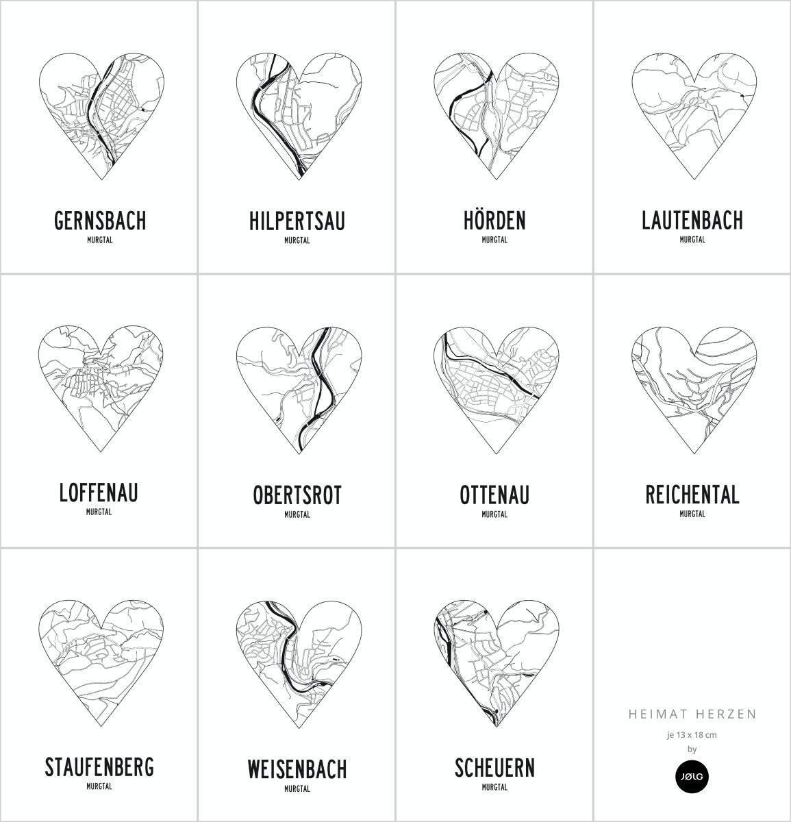 Heimat ist dort, wo das Herz zur Ruhe kommt Unsere HeimatHerzen sind eine grafische Liebeserklärung an die Gernsbacher Stadtteile und einige der angrenzenden Orte. Heimatliebe ganz ohne Kitsch - dafür mit klaren Linien und monochromer Farbgebung. Der Print macht sich gut als Geschenkkarte aber auch in deiner Gallery Wall ist er ein schöner Blickfang! Format 13 x 18 cm Wertig gedruckte Postkarte auf 300g Bilderdruck matt Gedruckt in Deutschland