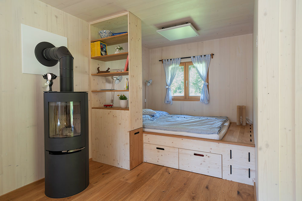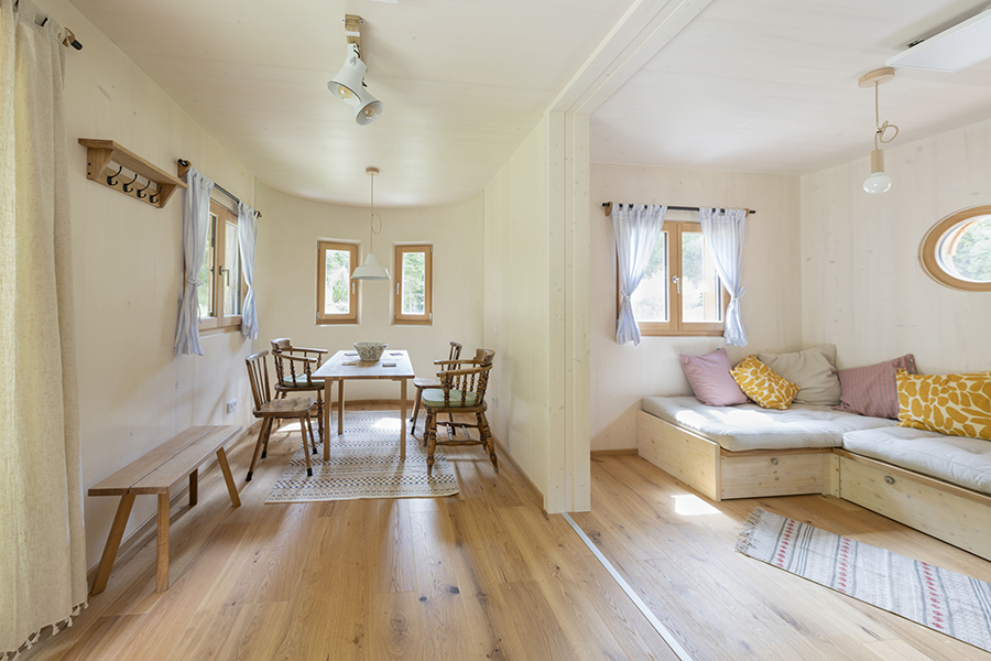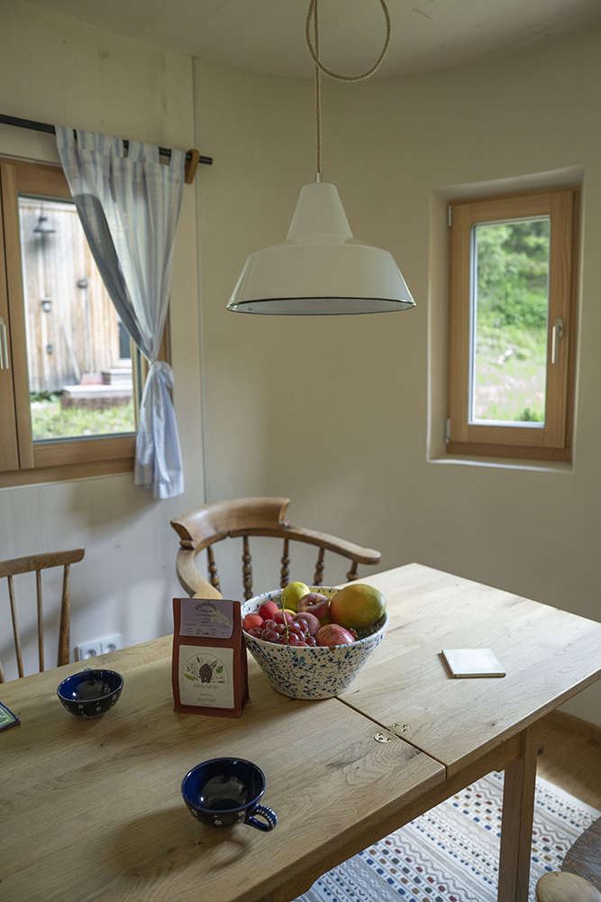 - Produkte: Weiße Poulsen Emailleleuchte über dem Esstisch, weiße Wandleuchten aus Emaille am Bett