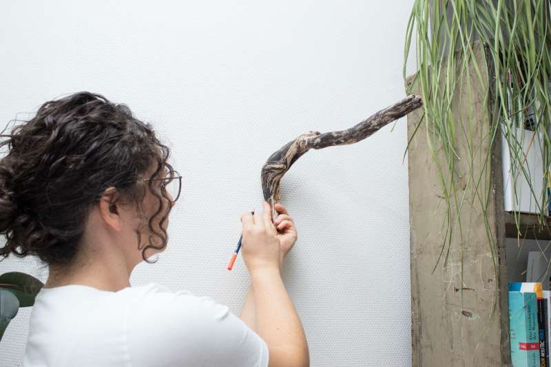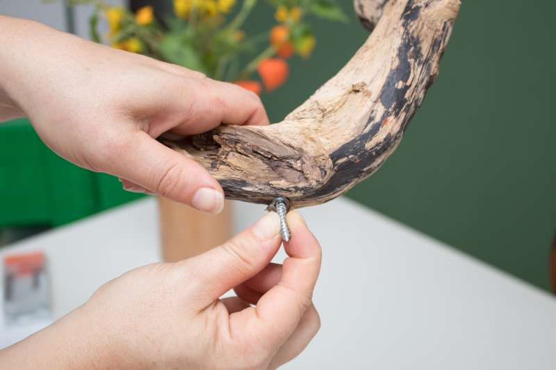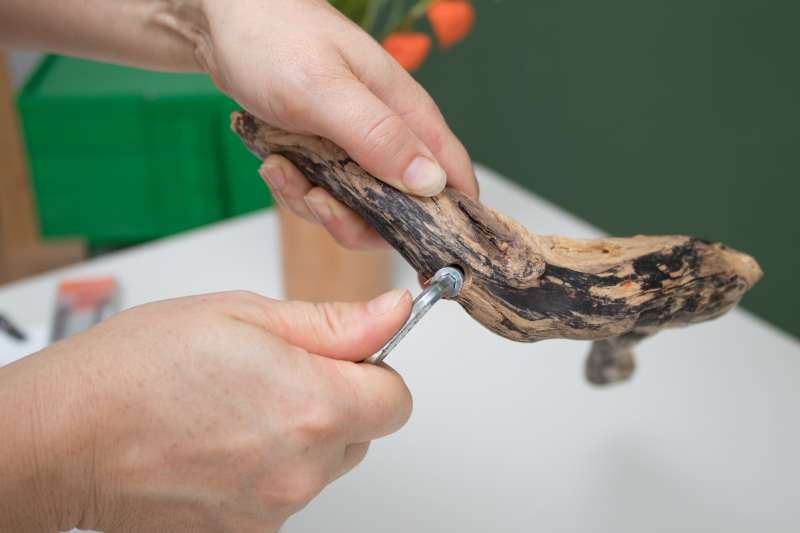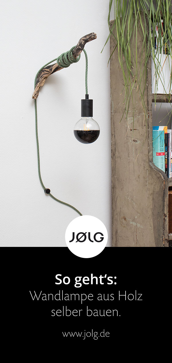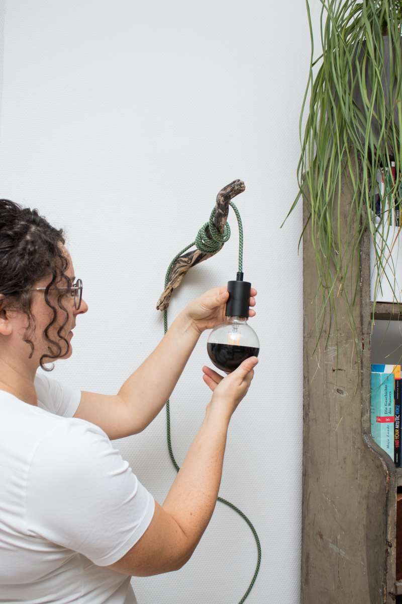 Nun musst du nur noch dein Holzstück mit der Stockschraube in die Wand schrauben und kannst dann deine Lampe um das Holz wickeln.