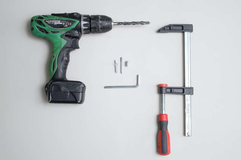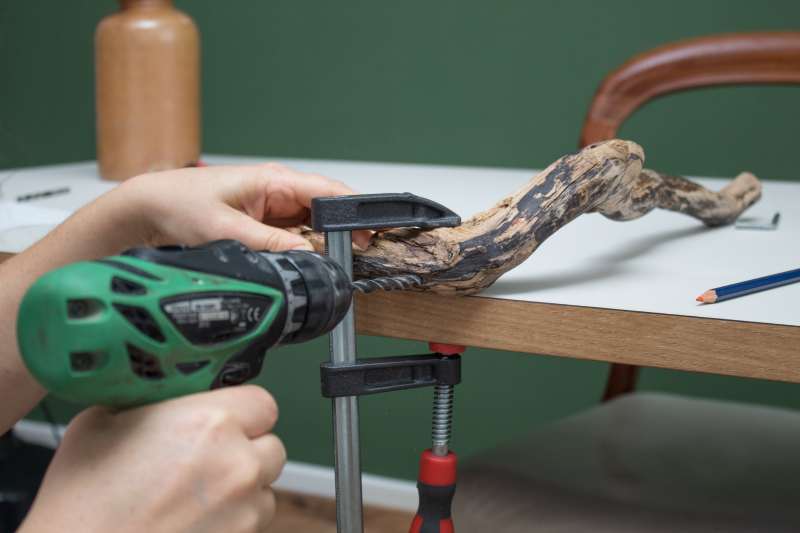 Befestige das Holzstück mit einer Schraubzwinge an der Arbeitsplatte, damit es beim Bohren nicht verrutscht. Bohre nun mit dem Holzbohrer (Größe 8) ein Loch in die zuvor markierte Stelle. Das Loch sollte so tief sein, wie die Schraubmuffe. Achte darauf, dass du den Akkuschrauber so gerade wie möglich hältst, damit das Loch nicht schräg ins Holz gebohrt wird. Andernfalls steht die Wandhalterung später schräg von der Wand ab.
