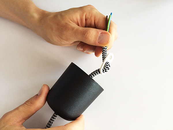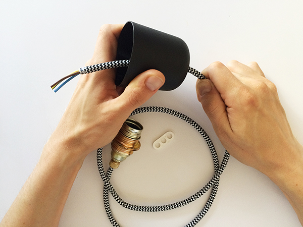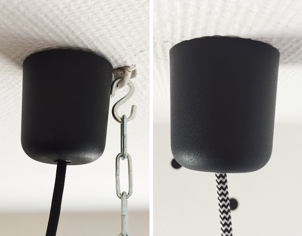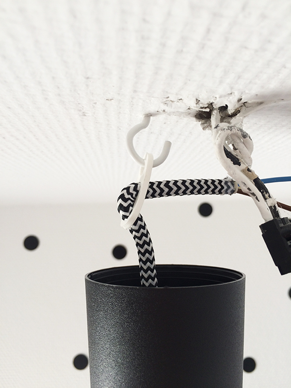 5. Nachdem eure Industrielampe am Stromanschluss angeschlossen wurde (bitte vom Elektro-Fachmann), kann der Baldachin am Kabel hochgeschoben werden. Durch den Gegenzug des befestigten Kabels an dem Haken, hält der Baldachin sauber und glatt an der Decke.