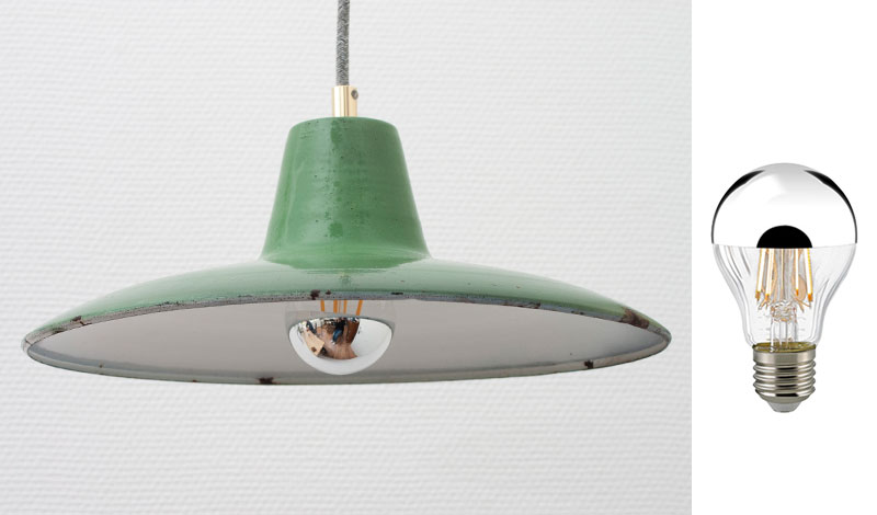 Durch den Kopfspiegel wird das Licht lediglich seitlich in den Lampenschirm reflektiert und strahlt nicht direkt nach unten ab. Da die alten Industrielampen innen weiß emailliert sind, wird das Licht wunderbar reflektiert und ergibt eine helle, weiche und sehr harmonische Lichtatmosphäre.