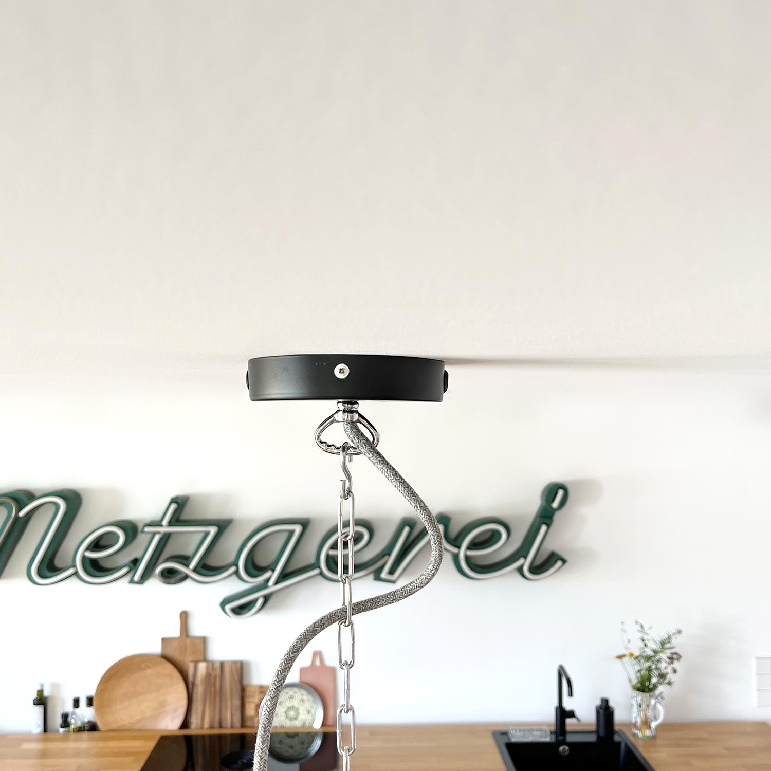 Da jede Decke eine andere Beschaffenheit hat, informiert euch bitte im Vorfeld welche Dübel ihr verwenden müsst. Das auf dem Bild dargestellte Textilkabel und die Kette ist im Lieferumfang nicht enthalten.