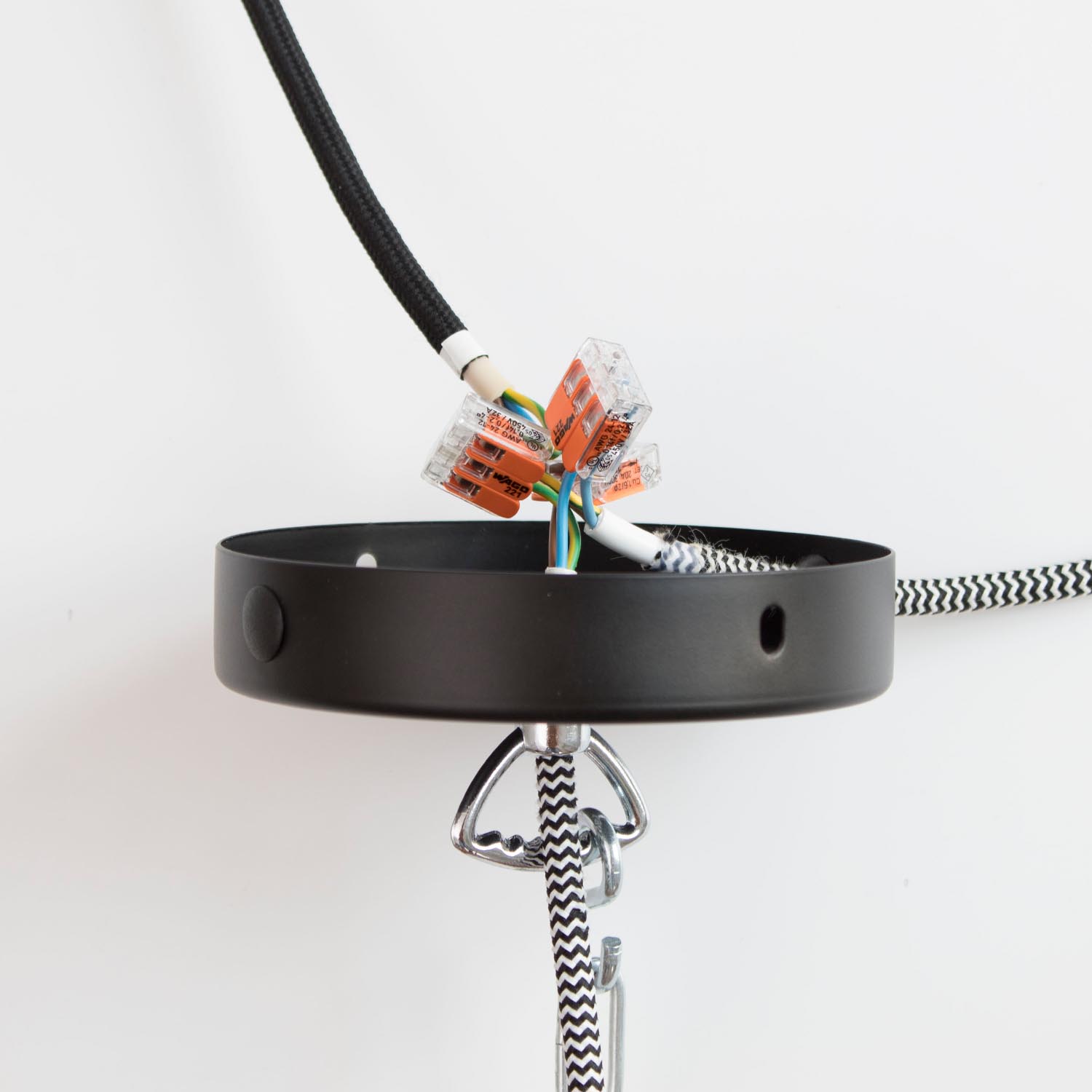 Die Distanzaufhängung kommt dann zum Einsatz, wenn sich der Stromanschluss nicht direkt über deiner Lampe befindet. Mit der so genannten Affenschaukel lässt sich das Kabel an die gewünschte Position im Raum umlenken – ganz unabhängig davon, wo sich der Stromanschluss an der Decke befindet. In der Deckenbefestigung ist eine kleine Schraube um das Kabel zu fixieren, damit es gesichert ist und nicht weiterrutschen kann. Farbe: Weiß oder Schwarz Material: Kunststoff mit Schraub-Zugentlastung Lieferumfang: Distanzaufhängung inkl. passender Schraube und Dübel Maße: Höhe 4 cm, Ø 2 cm - für Kabel bis Ø 8 mm (alle unsere Textilkabel passen) Achtung: Nur für Lampen verwenden, die direkt am Kabel aufgehängt werden können. Maximale Traglast 1,5 kg. Die Distanzaufhängung ist geeignet für alle Textilkabel, die bei unseren JØLG Industrielampen verwendet werden. Jede Decke/Wand hat eine andere Beschaffenheit. Bitte informiere dich deshalb im Fachhandel oder Baumarkt, welche Dübel für deine Decke/Wand geeignet sind. In unserem Magazin findest du viele hilfreiche Tipps, wenn der Stromanschluss nicht dort ist, wo die Lampe abhängen soll, oder wenn du deine Leichtquelle über die Steckdose beziehen möchtest.