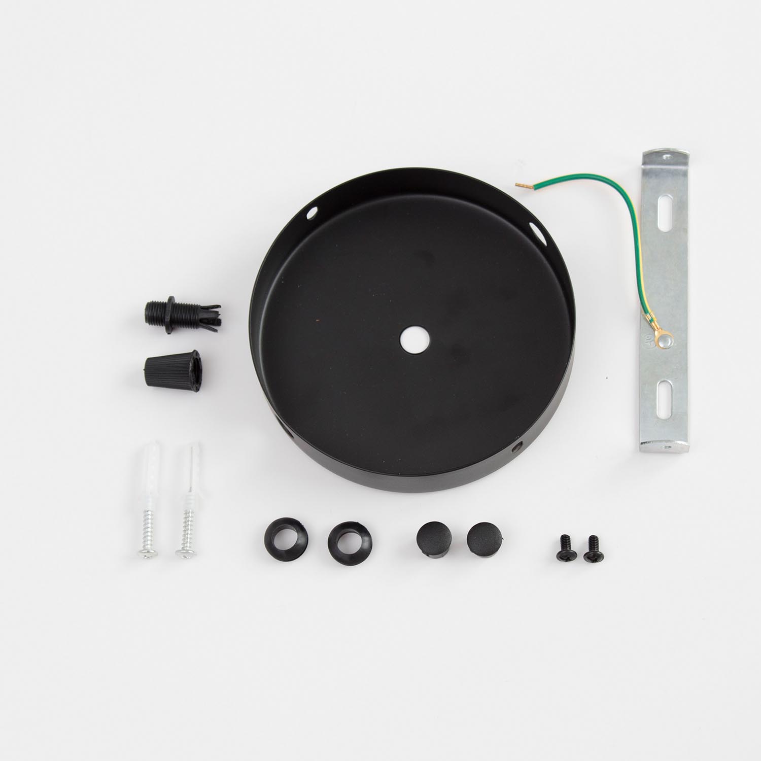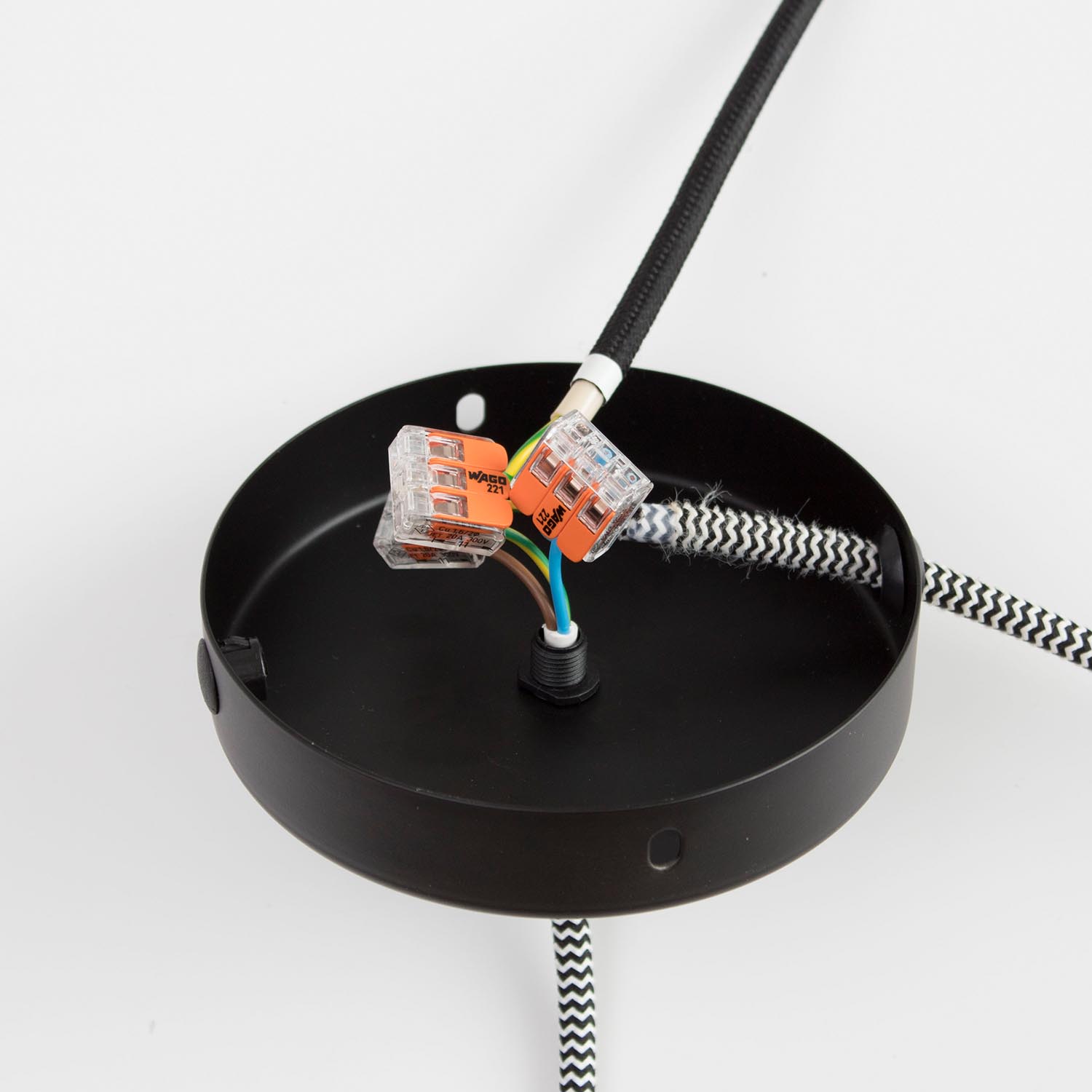 Für alle Installationen, bei denen sich der Stromanschluss nicht direkt über eurer Industrielampe befindet, eignet sich dieser Abzweigbaldachin aus Metall mit vier möglichen seitlichen Ausgängen. Er verdeckt den Stromanschluss; das Textilkabel wird dabei seitlich aus dem Baldachin herausgeführt (Affenschaukel). Der Abzweigbaldachin kann je nach Bedarf an bis zu vier Stellen geöffnet werden, z. B. wenn mehrere Lampen an einen Stromanschluss angeschlossen werden sollen. Alle nicht genutzten Seitenlöcher können mittels der mitgelieferten Abdeckkappen verschlossen werden. Farbe: Schwarz Lieferumfang: Baldachin, Befestigungswinkel inkl. Schrauben und Dübel, 4 Abdeckkappen, 4 Gummiringe zum Schutz der Kabel Maße: Durchmesser 120 mm, Höhe 25 mm Jede Decke/Wand hat eine andere Beschaffenheit. Bitte informiere dich deshalb im Fachhandel oder Baumarkt, welche Dübel für deine Decke/Wand geeignet sind. Das auf dem Bild dargestellte Textilkabel ist im Lieferumfang nicht enthalten.In unserem Magazin findet ihr hilfreiche Tipps zur Installation.