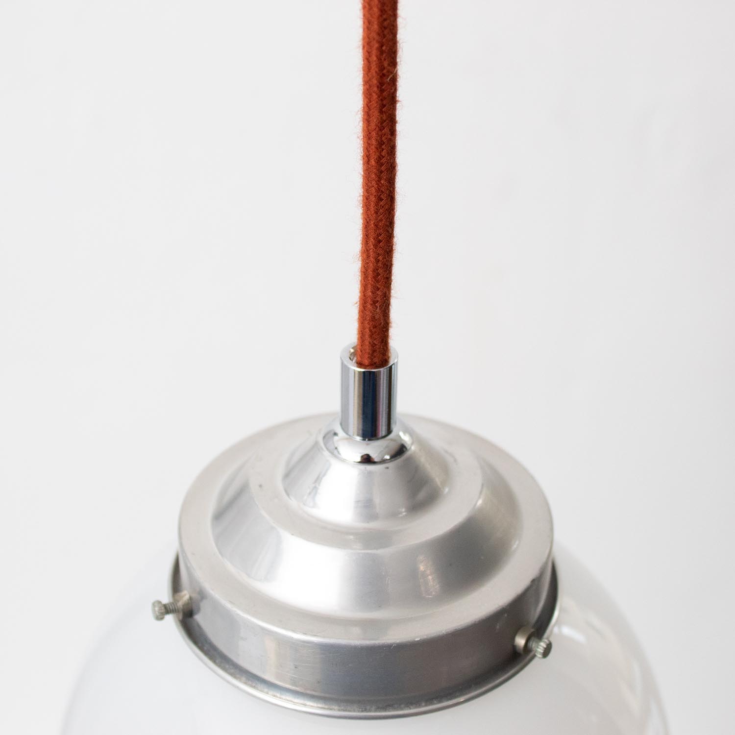 Kleine Opalglasleuchte für stilvolles Akzentlicht.Opalglas (auch Kryolithglas genannt) sieht aus wie milchiges oder satiniertes Glas, mit dem Unterschied, dass Opalglas mehr Glanz hat. Opalglas ist ein lichtdurchlässiges, aber nicht durchsichtiges Glas. Das durchscheinende Licht ist sanft und blendet nicht. Opalglas erreicht somit eine gleichmäßigere Lichtbrechung/Streuung als bei der Verwendung von normalem Glas. Mit Opalglas versehene Leuchten wurden bis ca. 1920 nur im industriellen Bereich eingesetzt. 1923 entwarfen die beiden Produktdesigner Wilhelm Wagenfeld und Carl Jakob Jucker in der Metallwerkstatt des Weimarer Bauhaus die erste Leuchte, die durch das verwendete Opalglas gestreutes Licht auch in den Wohnraum brachte. Die „Bauhaus-Leuchte“ ist heute besser bekannt als „Wagenfeld-Leuchte“ und zählt zu den Designklassikern des 20. Jahrhunderts. Seit diesem Zeitpunkt hat sich opales Glas – vor allem im späten Art déco - über viele Epochen und Stile hinweg bis heute als modernes und vielseitiges Glas im Leuchtendesign etabliert. Patina: Wenige Spuren der Zeit Material: Opalglas Farbe: Weiß Aufhängung: Direkt am Kabel Maße: Ø 14 cm, Höhe mit Kappe 17 cm zzgl. ca 2 cm Fassung Fassung: E27-Fassung** Textilkabel: Länge und Farbe nach deinen Wünschen. Im Grundpreis sind 1,2 Meter Textilkabel enthalten. Was haben wir mit deiner Lampe gemacht?Die Lampenschirme werden sorgfältig gereinigt, dabei wird die Patina so gut es geht erhalten. Anschließend werden die Leuchten komplett neu elektrifiziert, so dass sie den aktuellen Sicherheitsstandards entsprechen.Dein individuelles Licht mit GeschichteUm die Industrielampe zum individuellen Designstück zu machen, kannst du sie mit einem bunten Textilkabel nach deinen Vorstellungen gestalten. Wähle einfach ein Kabel aus und bestimme zusätzlich die ideale Länge des Kabels anhand deiner Gegebenheiten vor Ort. Im Grundpreis sind 1.2 m Kabel enthalten. Bei der Auswahl kannst du zwischen Längen bis 5 m wählen - auf direkte Nachfrage können wir auch ein deutlich längeres Kabel anbringen. Die Lampe richtig installierenUm die Elektroinstallation an der Decke zu verdecken kannst du entweder einen weißen oder schwarzen Baldachin aus Hartplastik (Ø 65 mm – Höhe 67 mm) wählen - dieser ist im Preis enthalten. Weitere Baldachine (z. B. Porzellan- oder Abzweig-Baldachine) sind im Shop verfügbar. In unserem Magazin findest du eine reihe hilfreicher Tipps, auch gerade dann wenn der Stromanschluss nicht an der Stelle ist, an dem die Lampe hängen soll.Wie kommt deine Lampe zu dir?Deine restaurierte JØLG Leuchte kommt fertig angeschlossen, nach deinen individuellen Vorgaben und inkl. einer Anleitung mit Tipps & Tricks, sicher und umweltfreundlich verpackt zu dir nach Hause. Wir versenden ausschließlich mit DHL GoGreen. Im Lieferumfang sind keine Leuchtmittel enthalten. Im Shop findest du aber eine passende Auswahl an LED-Leuchtmitteln. Achte hierbei auf die passende Größe des Lampensockels (E14 oder E27).Viel Freude und Inspiration beim Auswählen und Zusammenstellen deiner Lampe wünscht dir dein Team von JØLG.*Da es sich bei den Industrieleuchten um gebrauchte Antiquitäten handelt, unterliegen die Produkte gem. § 25a UStG der Differenzbesteuerung. Somit ist für diese Artikel kein gesonderter Umsatzsteuerausweis möglich.**Die Leuchte ist geeignet für Leuchtmittel aller Energieklassen. Glühlampen und Halogenlampen bis 60 Watt.
