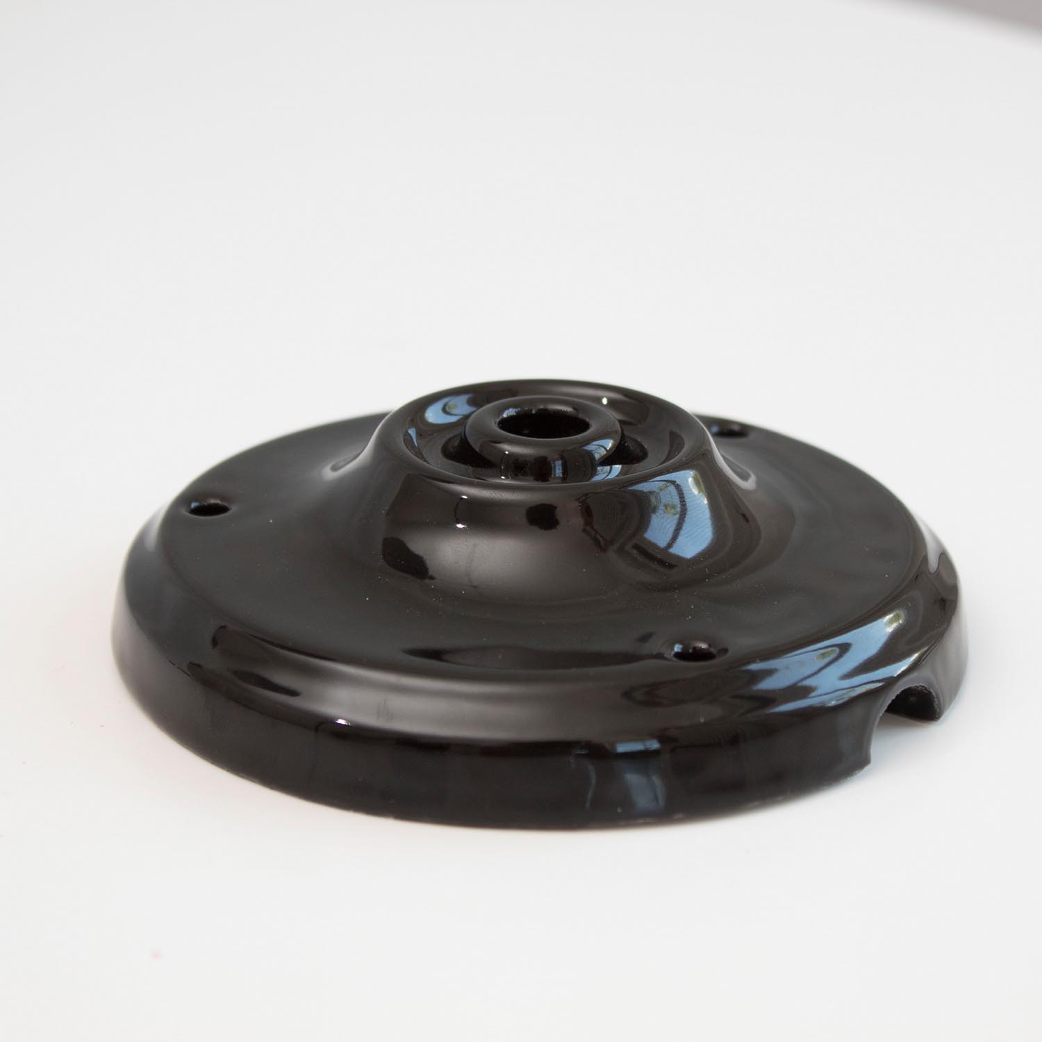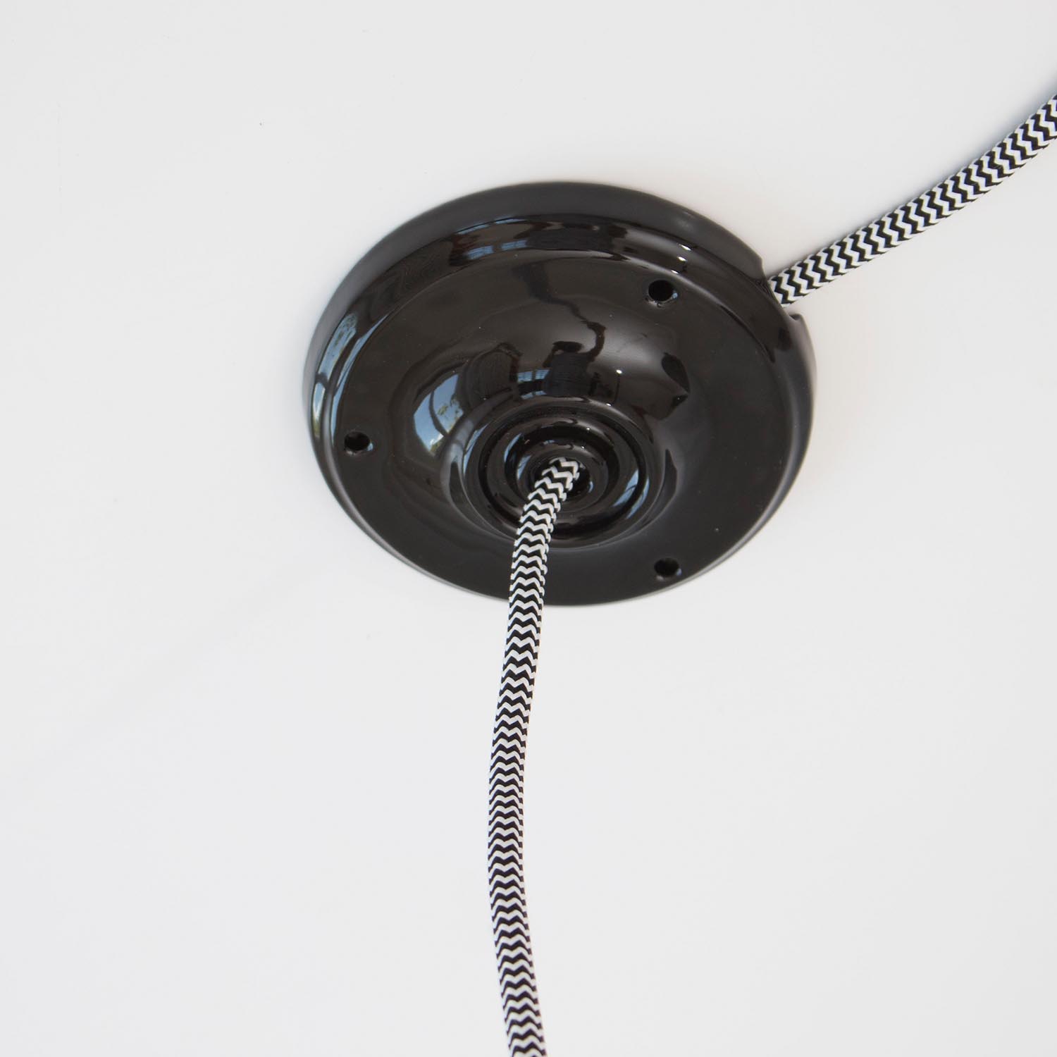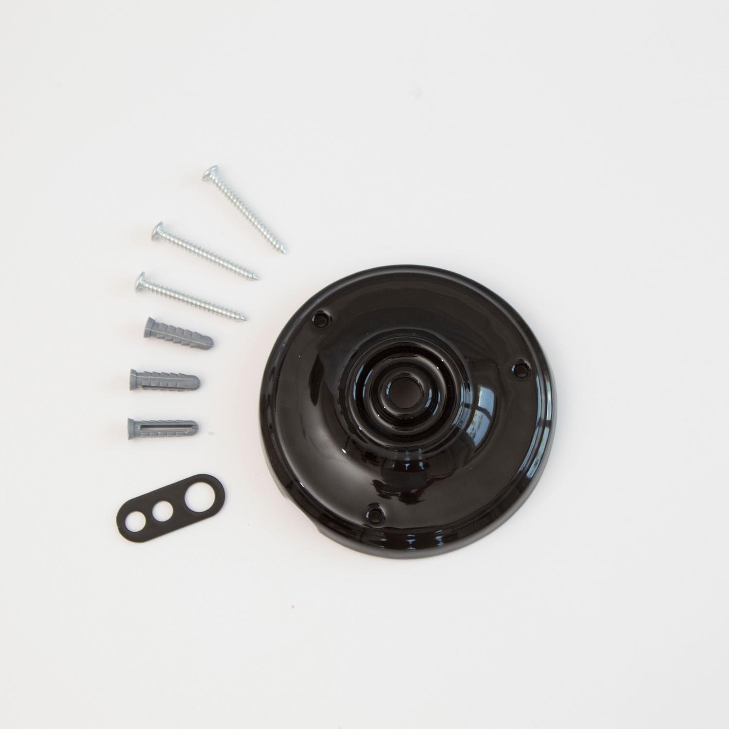 Stilechter vintage Deckenbaldachin aus glasiertem Porzellan/Keramik in schwarz Die stilvolle Ergänzung für eure alte Industrieleuchte. Der Baldachin aus Porzellan verdeckt die unschönen Kabelanschlüsse an der Decke und passt durch seine zeitlose Form und das elegante Material perfekt zum rauen Charme der alten Fabriklampen. Die Abdeckkappe ist geeignet für alle JØLG-Leuchten, die an einer Kette aufgehängt werden müssen. Farbe: Schwarz Inkl. 3 Befestigungsschrauben, 3 Dübel und 3-Loch-Scheibe Inkl. Befestigungsset für die Aufhängung einer Lampe mit Rundstahlkette Die Baldachine haben zwei seitliche Auslässe Maße: Durchmesser 105 mm, Mittelloch 10 mm, Tiefe innen 20 mm Gewicht der Leuchte bis max. 4 kg Da jede Decke eine andere Beschaffenheit hat, informiert euch bitte im Vorfeld welche Dübel ihr verwenden müsst. Wir empfehlen die Schrauben von Hand und nicht mit einem Akkuschrauber festzudrehen, um zu große Spannungen am Porzellan zu vermeiden. Der Baldachin wird fetig montiert geliefert. Das auf dem Bild dargestellte Textilkabel und die Kette ist im Lieferumfang nicht enthalten.In unserem Magazin findest du weitere hilfreiche Tipps zur Installation.