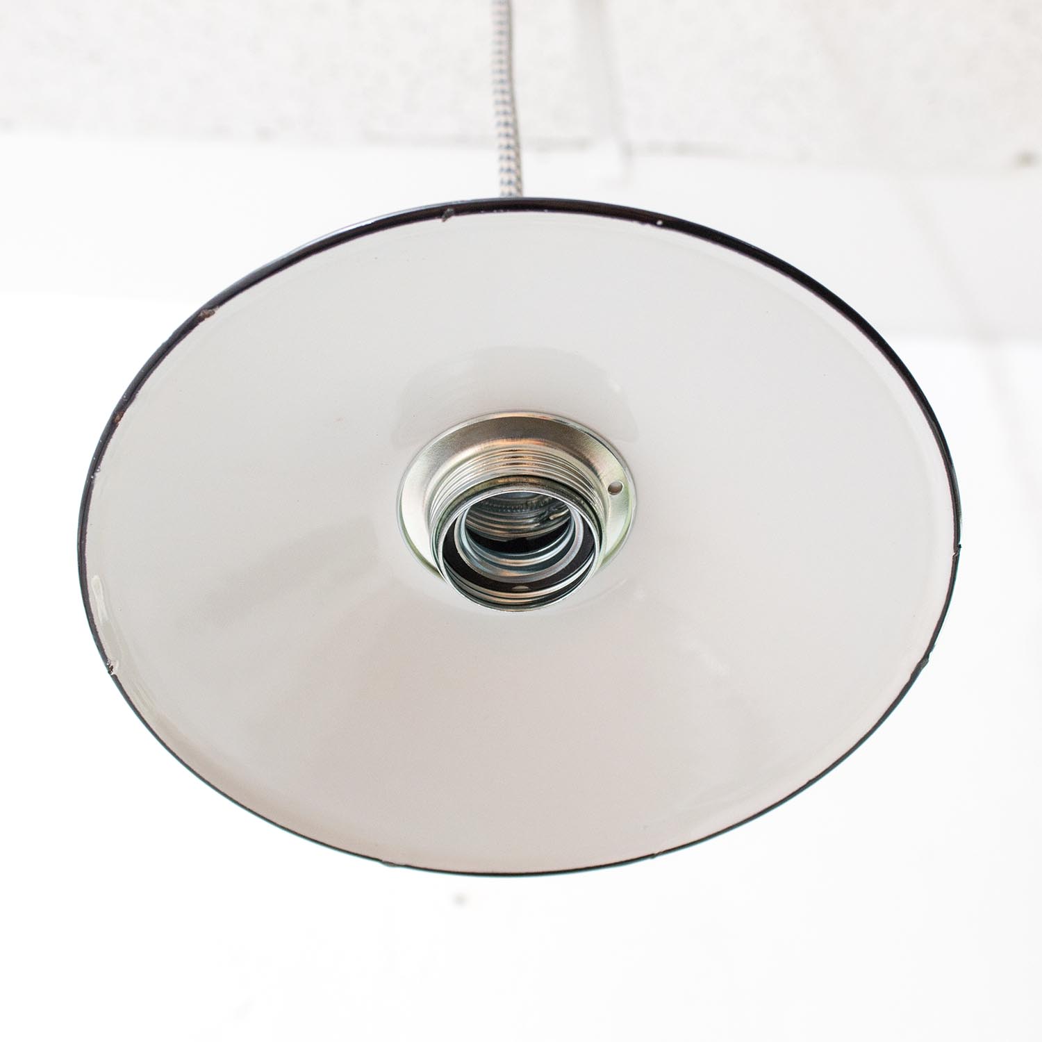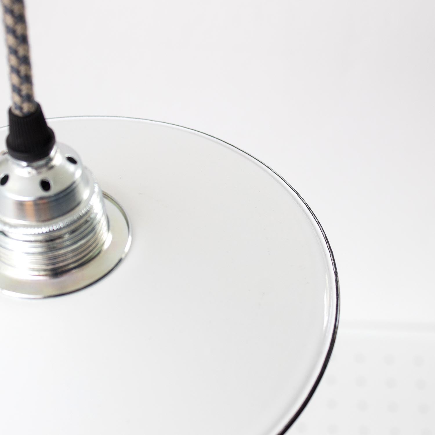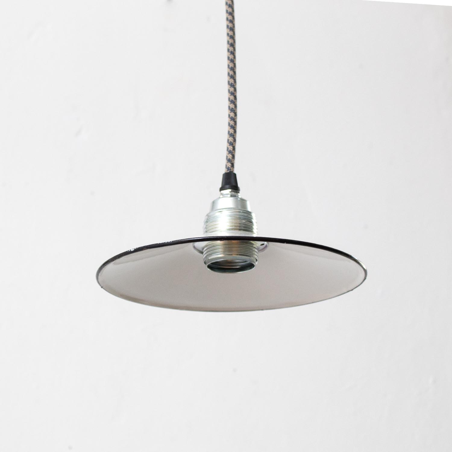 Klein und fein: Diese zierlichen Schönheiten stammen, wie all unsere JØLG-Industrieleuchten, aus Fabriken und Werkstätten in ganz Europa. Liebevoll restauriert schmücken diese Vintage-Lampen jetzt Küchen und Esszimmer, Flure und Wohnzimmer, Kinder- und Arbeitszimmer. So eine kleine Fabrikleuchte macht sich besonders gut als Spot oder Akzentlicht, auch ideal über der Kochinsel, an der Bar oder der Theke. Patina: Wenige Spuren der Zeit Material: Emailliertes Metall Farbe: Außen Weiß, Innen Weiß Aufhängung: Direkt am Kabel Maße: Ø 18 cm, Höhe 19 cm zzgl. ca 2 cm Fassung Fassung: E27-Fassung** Textilkabel: Länge und Farbe nach deinen Wünschen. Im Grundpreis sind 1,2 Meter Textilkabel enthalten. Was haben wir mit deiner Lampe gemacht?Die Lampenschirme werden sorgfältig gereinigt, dabei wird die Patina so gut es geht erhalten. Anschließend werden die Leuchten komplett neu elektrifiziert, so dass sie den aktuellen Sicherheitsstandards entsprechen.Dein individuelles Licht mit GeschichteUm die Industrielampe zum individuellen Designstück zu machen, kannst du sie mit einem bunten Textilkabel nach deinen Vorstellungen gestalten. Wähle einfach ein Kabel aus und bestimme zusätzlich die ideale Länge des Kabels anhand deiner Gegebenheiten vor Ort. Im Grundpreis sind 1.2 m Kabel enthalten. Bei der Auswahl kannst du zwischen Längen bis 5 m wählen - auf direkte Nachfrage können wir auch ein deutlich längeres Kabel anbringen. Die Lampe richtig installierenUm die Elektroinstallation an der Decke zu verdecken kannst du entweder einen weißen oder schwarzen Baldachin aus Hartplastik (Ø 65 mm – Höhe 67 mm) wählen - dieser ist im Preis enthalten. Weitere Baldachine (z. B. Porzellan- oder Abzweig-Baldachine) sind im Shop verfügbar. In unserem Magazin findest du eine reihe hilfreicher Tipps, auch gerade dann wenn der Stromanschluss nicht an der Stelle ist, an dem die Lampe hängen soll.Wie kommt deine Lampe zu dir?Deine restaurierte JØLG Leuchte kommt fertig angeschlossen, nach deinen individuellen Vorgaben und inkl. einer Anleitung mit Tipps & Tricks, sicher und umweltfreundlich verpackt zu dir nach Hause. Wir versenden ausschließlich mit DHL GoGreen. Im Lieferumfang sind keine Leuchtmittel enthalten. Im Shop findest du aber eine passende Auswahl an LED-Leuchtmitteln. Achte hierbei auf die passende Größe des Lampensockels (E14 oder E27).Viel Freude und Inspiration beim Auswählen und Zusammenstellen deiner Lampe wünscht dir dein Team von JØLG.**Die Leuchte ist geeignet für Leuchtmittel aller Energieklassen. Glühlampen und Halogenlampen bis 60 Watt.