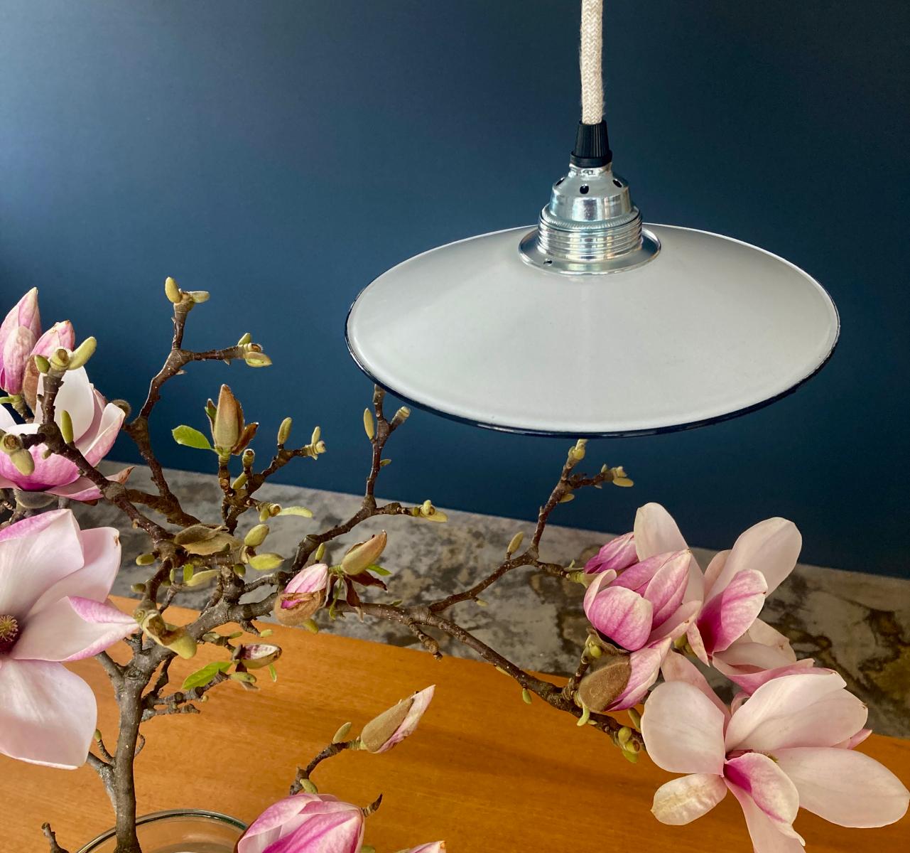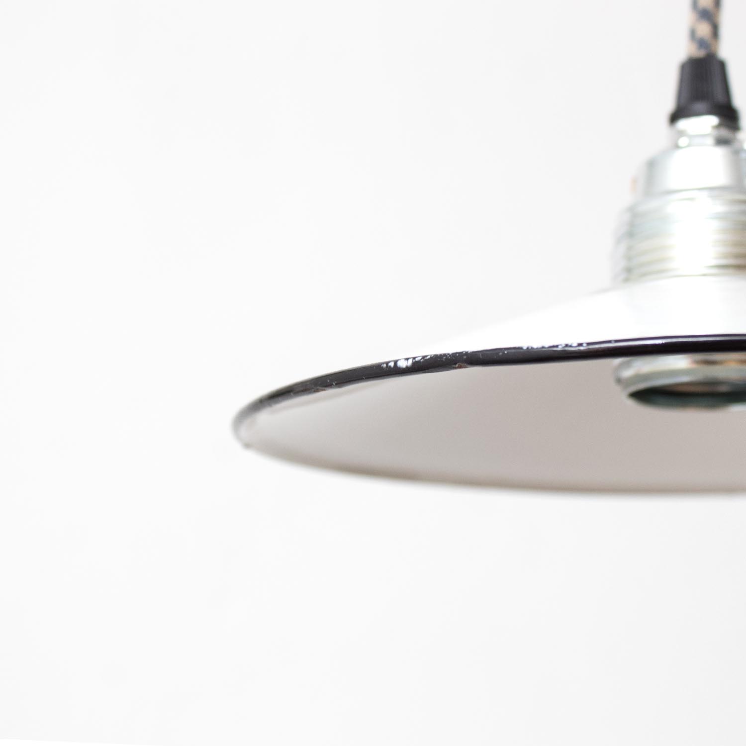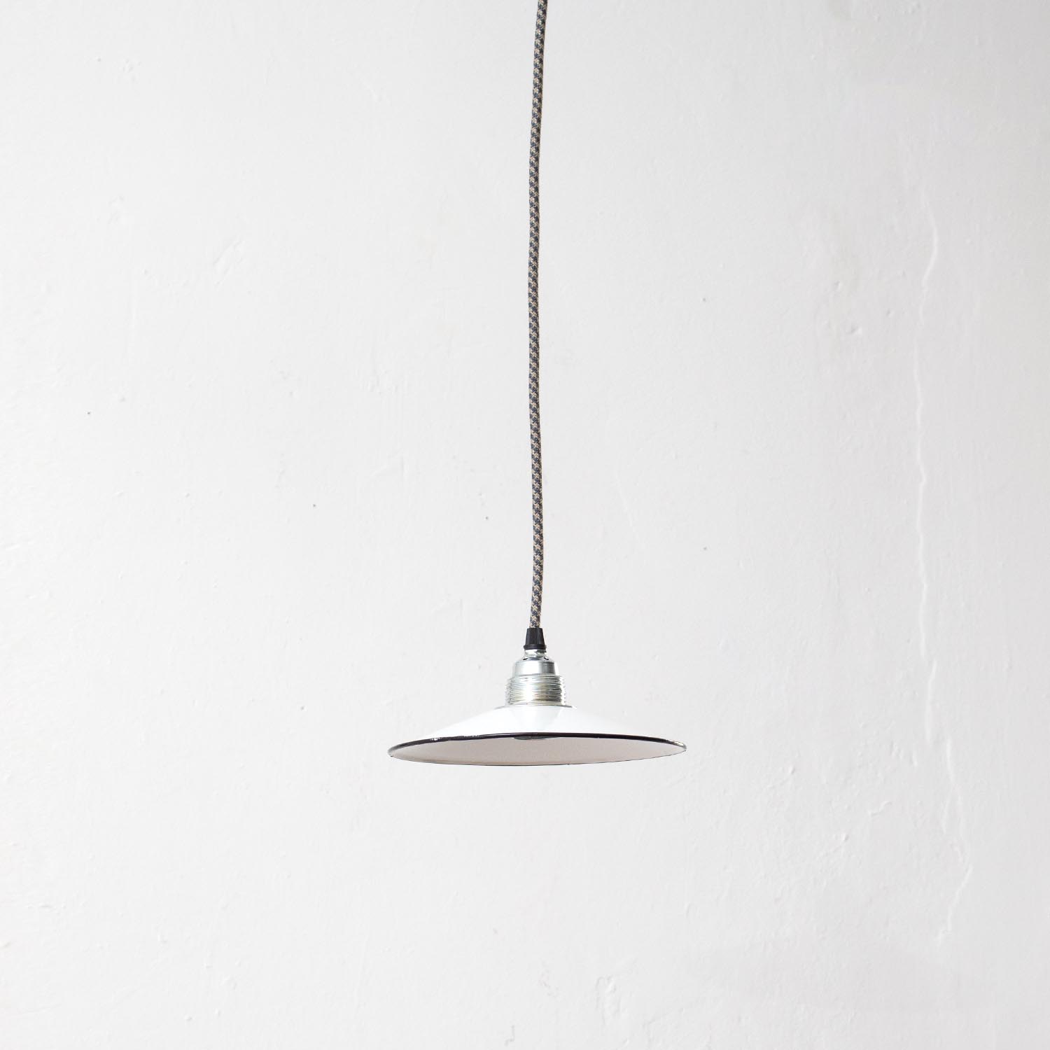 Klein und fein: Diese zierlichen Schönheiten stammen, wie all unsere JØLG-Industrieleuchten, aus Fabriken und Werkstätten in ganz Europa. Liebevoll restauriert schmücken diese Vintage-Lampen jetzt Küchen und Esszimmer, Flure und Wohnzimmer, Kinder- und Arbeitszimmer. So eine kleine Fabrikleuchte macht sich besonders gut als Spot oder Akzentlicht, auch ideal über der Kochinsel, an der Bar oder der Theke. Patina: Wenige Spuren der Zeit Material: Emailliertes Metall Farbe: Außen Weiß, Innen Weiß Aufhängung: Direkt am Kabel Maße: Ø 18 cm, Höhe 19 cm zzgl. ca 2 cm Fassung Fassung: E27-Fassung** Textilkabel: Länge und Farbe nach deinen Wünschen. Im Grundpreis sind 1,2 Meter Textilkabel enthalten. Was haben wir mit deiner Lampe gemacht?Die Lampenschirme werden sorgfältig gereinigt, dabei wird die Patina so gut es geht erhalten. Anschließend werden die Leuchten komplett neu elektrifiziert, so dass sie den aktuellen Sicherheitsstandards entsprechen.Dein individuelles Licht mit GeschichteUm die Industrielampe zum individuellen Designstück zu machen, kannst du sie mit einem bunten Textilkabel nach deinen Vorstellungen gestalten. Wähle einfach ein Kabel aus und bestimme zusätzlich die ideale Länge des Kabels anhand deiner Gegebenheiten vor Ort. Im Grundpreis sind 1.2 m Kabel enthalten. Bei der Auswahl kannst du zwischen Längen bis 5 m wählen - auf direkte Nachfrage können wir auch ein deutlich längeres Kabel anbringen. Die Lampe richtig installierenUm die Elektroinstallation an der Decke zu verdecken kannst du entweder einen weißen oder schwarzen Baldachin aus Hartplastik (Ø 65 mm – Höhe 67 mm) wählen - dieser ist im Preis enthalten. Weitere Baldachine (z. B. Porzellan- oder Abzweig-Baldachine) sind im Shop verfügbar. In unserem Magazin findest du eine reihe hilfreicher Tipps, auch gerade dann wenn der Stromanschluss nicht an der Stelle ist, an dem die Lampe hängen soll.Wie kommt deine Lampe zu dir?Deine restaurierte JØLG Leuchte kommt fertig angeschlossen, nach deinen individuellen Vorgaben und inkl. einer Anleitung mit Tipps & Tricks, sicher und umweltfreundlich verpackt zu dir nach Hause. Wir versenden ausschließlich mit DHL GoGreen. Im Lieferumfang sind keine Leuchtmittel enthalten. Im Shop findest du aber eine passende Auswahl an LED-Leuchtmitteln. Achte hierbei auf die passende Größe des Lampensockels (E14 oder E27).Viel Freude und Inspiration beim Auswählen und Zusammenstellen deiner Lampe wünscht dir dein Team von JØLG.**Die Leuchte ist geeignet für Leuchtmittel aller Energieklassen. Glühlampen und Halogenlampen bis 60 Watt.