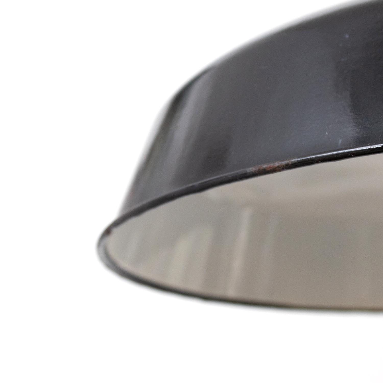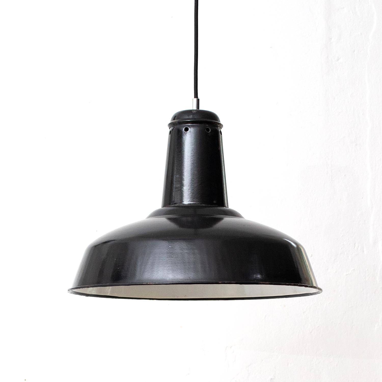 Diese Lampen wurden ursprünglich zur Beleuchtung von Montagehallen und Werkstätten konzipiert, so sorgten Sie ursprünglich für eine gleichmäßige Ausleuchtung von Arbeistbereichen. Durch die weiße Emaillierung im inneren der Leuchte wird dieser Effekt nochmals verstärkt. Jeder Lampenschirm ist ein Unikat und weist eine unverwechselbare Patina auf. Das Design der Leuchte orientierte sich einst eher an der Funktion, so überzeugen die Lampen von großer Sachlichkeit und zeitloser Ästhetik. Patina: Sichtbare Spuren der Zeit Material: Emailliertes Metall Farbe: Außen Schwarz, Innen Weiß Herkunft/Alter: Original Ebolicht (Erkennbar an dem kleinen Ring am Lampenschaft), Deutschland, ca. 1920 - 1940 Aufhängung: Direkt am Kabel Maße: Ø 40 cm, Höhe 32 cm zzgl. ca 3 cm Fassung Fassung: E27-Fassung**Textilkabel: Länge und Farbe nach deinen Wünschen. Im Grundpreis sind 1,2 Meter Textilkabel enthalten. Was haben wir mit deiner Lampe gemacht?Die Lampenschirme werden sorgfältig gereinigt, dabei wird die Patina so gut es geht erhalten. Anschließend werden die Leuchten komplett neu elektrifiziert, so dass sie den aktuellen Sicherheitsstandards entsprechen.Dein individuelles Licht mit GeschichteUm die Industrielampe zum individuellen Designstück zu machen, kannst du sie mit einem bunten Textilkabel nach deinen Vorstellungen gestalten. Wähle einfach ein Kabel aus und bestimme zusätzlich die ideale Länge des Kabels anhand deiner Gegebenheiten vor Ort. Im Grundpreis sind 1.2 m Kabel enthalten. Bei der Auswahl kannst du zwischen Längen bis 5 m wählen - auf direkte Nachfrage können wir auch ein deutlich längeres Kabel anbringen. Die Lampe richtig installierenUm die Elektroinstallation an der Decke zu verdecken kannst du entweder einen weißen oder schwarzen Baldachin aus Hartplastik (Ø 65 mm – Höhe 67 mm) wählen - dieser ist im Preis enthalten. Weitere Baldachine (z. B. Porzellan- oder Abzweig-Baldachine) sind im Shop verfügbar. In unserem Magazin findest du eine reihe hilfreicher Tipps, auch gerade dann wenn der Stromanschluss nicht an der Stelle ist, an dem die Lampe hängen soll.Wie kommt deine Lampe zu dir?Deine restaurierte JØLG Leuchte kommt fertig angeschlossen, nach deinen individuellen Vorgaben und inkl. einer Anleitung mit Tipps & Tricks, sicher und umweltfreundlich verpackt zu dir nach Hause. Wir versenden ausschließlich mit DHL GoGreen. Im Lieferumfang sind keine Leuchtmittel enthalten. Im Shop findest du aber eine passende Auswahl an LED-Leuchtmitteln. Achte hierbei auf die passende Größe des Lampensockels (E14 oder E27).Viel Freude und Inspiration beim Auswählen und Zusammenstellen deiner Lampe wünscht dir dein Team von JØLG.*Da es sich bei den Industrieleuchten um gebrauchte Antiquitäten handelt, unterliegen die Produkte gem. § 25a UStG der Differenzbesteuerung. Somit ist für diese Artikel kein gesonderter Umsatzsteuerausweis möglich.**Die Leuchte ist geeignet für Leuchtmittel aller Energieklassen. Glühlampen und Halogenlampen bis 60 Watt.