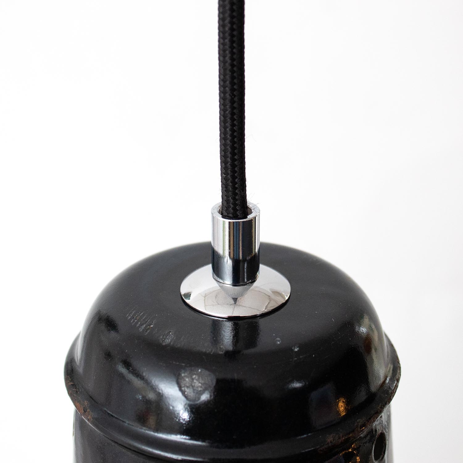 Diese Lampen wurden ursprünglich zur Beleuchtung von Montagehallen und Werkstätten konzipiert, so sorgten Sie einst für eine gleichmäßige Ausleuchtung von Arbeitsbereichen. Durch die weiße Emaillierung im inneren der Leuchte wird dieser Effekt nochmals verstärkt. Jeder Lampenschirm ist ein Unikat und weist eine unverwechselbare Patina auf. Patina: Sichtbare Spuren der Zeit Material: Emailliertes Metall, Hut aus lackiertem Metall Farbe: Außen Schwarz, Innen Weiß Herkunft/Alter: Frankreich, ca. 1920 - 1930 Aufhängung: Direkt am Kabel Maße: Ø 34 cm, Höhe 22 cm zzgl. ca 3 cm Fassung Fassung: E27-Fassung** Textilkabel: Länge und Farbe nach deinen Wünschen. Im Grundpreis sind 1,2 Meter Textilkabel enthalten. Was haben wir mit deiner Lampe gemacht?Die Lampenschirme werden sorgfältig gereinigt, dabei wird die Patina so gut es geht erhalten. Anschließend werden die Leuchten komplett neu elektrifiziert, so dass sie den aktuellen Sicherheitsstandards entsprechen.Dein individuelles Licht mit GeschichteUm die Industrielampe zum individuellen Designstück zu machen, kannst du sie mit einem bunten Textilkabel nach deinen Vorstellungen gestalten. Wähle einfach ein Kabel aus und bestimme zusätzlich die ideale Länge des Kabels anhand deiner Gegebenheiten vor Ort. Im Grundpreis sind 1.2 m Kabel enthalten. Bei der Auswahl kannst du zwischen Längen bis 5 m wählen - auf direkte Nachfrage können wir auch ein deutlich längeres Kabel anbringen. Die Lampe richtig installierenUm die Elektroinstallation an der Decke zu verdecken kannst du entweder einen weißen oder schwarzen Baldachin aus Hartplastik (Ø 65 mm – Höhe 67 mm) wählen - dieser ist im Preis enthalten. Weitere Baldachine (z. B. Porzellan- oder Abzweig-Baldachine) sind im Shop verfügbar. In unserem Magazin findest du eine reihe hilfreicher Tipps, auch gerade dann wenn der Stromanschluss nicht an der Stelle ist, an dem die Lampe hängen soll.Wie kommt deine Lampe zu dir?Deine restaurierte JØLG Leuchte kommt fertig angeschlossen, nach deinen individuellen Vorgaben und inkl. einer Anleitung mit Tipps & Tricks, sicher und umweltfreundlich verpackt zu dir nach Hause. Wir versenden ausschließlich mit DHL GoGreen. Im Lieferumfang sind keine Leuchtmittel enthalten. Im Shop findest du aber eine passende Auswahl an LED-Leuchtmitteln. Achte hierbei auf die passende Größe des Lampensockels (E14 oder E27).Viel Freude und Inspiration beim Auswählen und Zusammenstellen deiner Lampe wünscht dir dein Team von JØLG.*Da es sich bei den Industrieleuchten um gebrauchte Antiquitäten handelt, unterliegen die Produkte gem. § 25a UStG der Differenzbesteuerung. Somit ist für diese Artikel kein gesonderter Umsatzsteuerausweis möglich.**Die Leuchte ist geeignet für Leuchtmittel aller Energieklassen. Glühlampen und Halogenlampen bis 60 Watt.