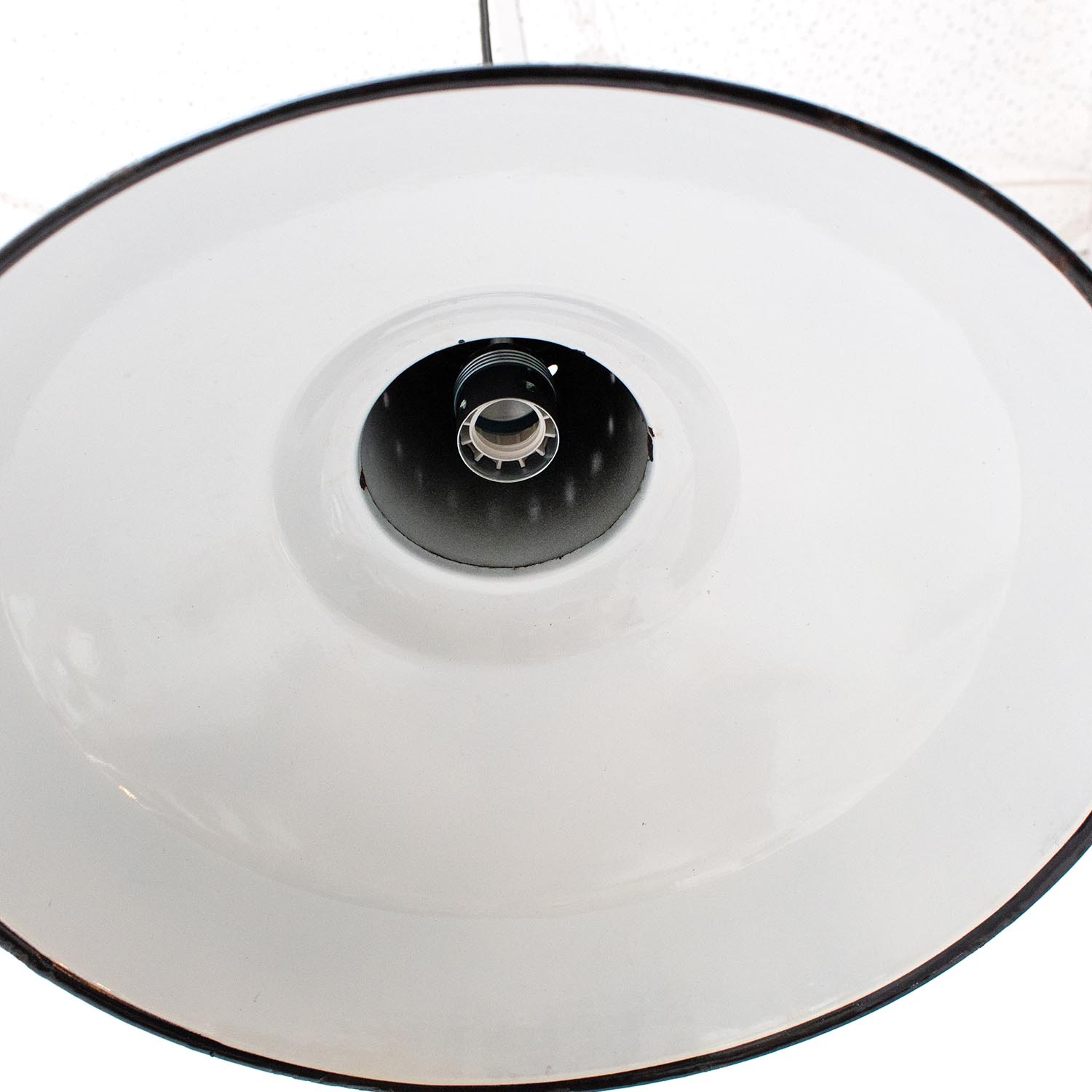 Diese Lampen wurden ursprünglich zur Beleuchtung von Montagehallen und Werkstätten konzipiert, so sorgten Sie ursprünglich für eine gleichmäßige Ausleuchtung von Arbeitsbereichen. Durch die weiße Emaillierung im inneren der Leuchte wird dieser Effekt nochmals verstärkt. Jeder Lampenschirm ist ein Unikat und weist eine unverwechselbare Patina auf.Patina: Sichtbare Spuren der ZeitMaterial: Emailliertes Metall Farbe: Außen Schwarz-Weiß gesprenkelt, Innen Weiß Herkunft/Alter: Frankreich, ca. 1930-1940Aufhängung: Direkt am KabelMaße: Ø 40 cm, Höhe 33 cm zzgl. ca. 2 cm Aufhängung Fassung: E27-Fassung** Textilkabel: Länge und Kabelfarbe nach deinen Wünschen. Im Grundpreis sind 1,2 Meter Textilkabel enthalten. Was haben wir mit deiner Lampe gemacht?Die Lampenschirme werden sorgfältig gereinigt, dabei wird die Patina so gut es geht erhalten. Anschließend werden die Leuchten komplett neu elektrifiziert, so dass sie den aktuellen Sicherheitsstandards entsprechen.Dein individuelles Licht mit GeschichteUm die Industrielampe zum individuellen Designstück zu machen, kannst du sie mit einem bunten Textilkabel nach deinen Vorstellungen gestalten. Wähle einfach ein Kabel aus und bestimme zusätzlich die ideale Länge des Kabels anhand deiner Gegebenheiten vor Ort. Im Grundpreis sind 1.2 m Kabel enthalten. Bei der Auswahl kannst du zwischen Längen bis 5 m wählen - auf direkte Nachfrage können wir auch ein deutlich längeres Kabel anbringen. Die Lampe richtig installierenUm die Elektroinstallation an der Decke zu verdecken kannst du entweder einen weißen oder schwarzen Baldachin aus Hartplastik (Ø 65 mm – Höhe 67 mm) wählen - dieser ist im Preis enthalten. Weitere Baldachine (z. B. Porzellan- oder Abzweig-Baldachine) sind im Shop verfügbar. In unserem Magazin findest du eine reihe hilfreicher Tipps, auch gerade dann wenn der Stromanschluss nicht an der Stelle ist, an dem die Lampe hängen soll.Wie kommt deine Lampe zu dir?Deine restaurierte JØLG Leuchte kommt fertig angeschlossen, nach deinen individuellen Vorgaben und inkl. einer Anleitung mit Tipps & Tricks, sicher und umweltfreundlich verpackt zu dir nach Hause. Wir versenden ausschließlich mit DHL GoGreen. Im Lieferumfang sind keine Leuchtmittel enthalten. Im Shop findest du aber eine passende Auswahl an LED-Leuchtmitteln. Achte hierbei auf die passende Größe des Lampensockels (E14 oder E27).Viel Freude und Inspiration beim Auswählen und Zusammenstellen deiner Lampe wünscht dir dein Team von JØLG.*Da es sich bei den Industrieleuchten um gebrauchte Antiquitäten handelt, unterliegen die Produkte gem. § 25a UStG der Differenzbesteuerung. Somit ist für diese Artikel kein gesonderter Umsatzsteuerausweis möglich.**Die Leuchte ist geeignet für Leuchtmittel aller Energieklassen. Glühlampen und Halogenlampen bis 60 Watt.
