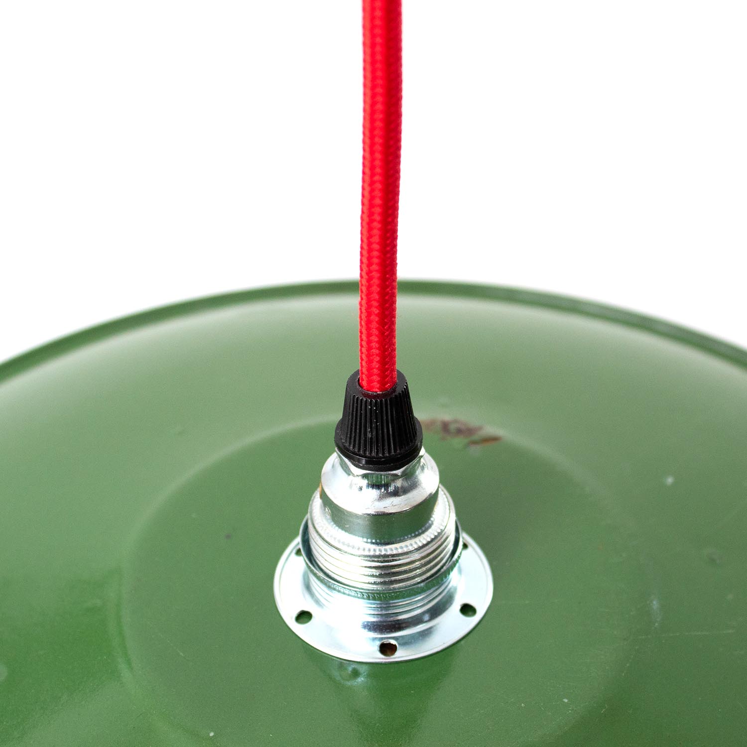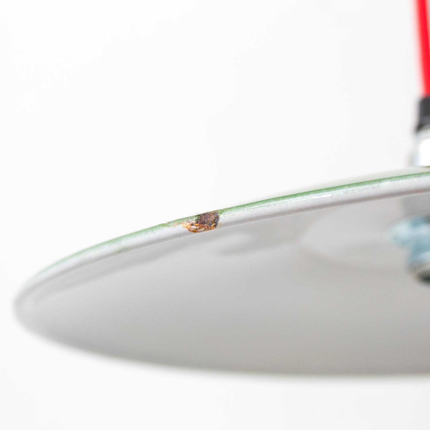 Patina: Leichte Spuren der Zeit Material: Emailliertes Metall Farbe: Außen Grün, Innen WeißHerkunft: Frankreich, ca. 1920-1940 Aufhängung: Direkt am Kabel Maße: Ø 19 cm, Höhe 13 cm zzgl. ca. 5 cm Fassung Fassung: E14-Fassung** Textilkabel: Länge und Farbe nach deinen Wünschen. Im Grundpreis sind 1,2 Meter Textilkabel enthalten.Was haben wir mit deiner Lampe gemacht?Die Lampenschirme werden sorgfältig gereinigt, dabei wird die Patina so gut es geht erhalten. Anschließend werden die Leuchten komplett neu elektrifiziert, so dass sie den aktuellen Sicherheitsstandards entsprechen.Dein individuelles Licht mit GeschichteUm die Industrielampe zum individuellen Designstück zu machen, kannst du sie mit einem bunten Textilkabel nach deinen Vorstellungen gestalten. Wähle einfach ein Kabel aus und bestimme zusätzlich die ideale Länge des Kabels anhand deiner Gegebenheiten vor Ort. Im Grundpreis sind 1.2 m Kabel enthalten. Bei der Auswahl kannst du zwischen Längen bis 5 m wählen - auf direkte Nachfrage können wir auch ein deutlich längeres Kabel anbringen. Die Lampe richtig installierenUm die Elektroinstallation an der Decke zu verdecken kannst du entweder einen weißen oder schwarzen Baldachin aus Hartplastik (Ø 65 mm – Höhe 67 mm) wählen - dieser ist im Preis enthalten. Weitere Baldachine (z. B. Porzellan- oder Abzweig-Baldachine) sind im Shop verfügbar. In unserem Magazin findest du eine reihe hilfreicher Tipps, auch gerade dann wenn der Stromanschluss nicht an der Stelle ist, an dem die Lampe hängen soll.Wie kommt deine Lampe zu dir?Deine restaurierte JØLG Leuchte kommt fertig angeschlossen, nach deinen individuellen Vorgaben und inkl. einer Anleitung mit Tipps & Tricks, sicher und umweltfreundlich verpackt zu dir nach Hause. Wir versenden ausschließlich mit DHL GoGreen. Im Lieferumfang sind keine Leuchtmittel enthalten. Im Shop findest du aber eine passende Auswahl an LED-Leuchtmitteln. Achte hierbei auf die passende Größe des Lampensockels (E14 oder E27).Viel Freude und Inspiration beim Auswählen und Zusammenstellen deiner Lampe wünscht dir dein Team von JØLG.*Da es sich bei den Industrieleuchten um gebrauchte Antiquitäten handelt, unterliegen die Produkte gem. § 25a UStG der Differenzbesteuerung. Somit ist für diese Artikel kein gesonderter Umsatzsteuerausweis möglich.**Die Leuchte ist geeignet für Leuchtmittel aller Energieklassen. Glühlampen und Halogenlampen bis 60 Watt.