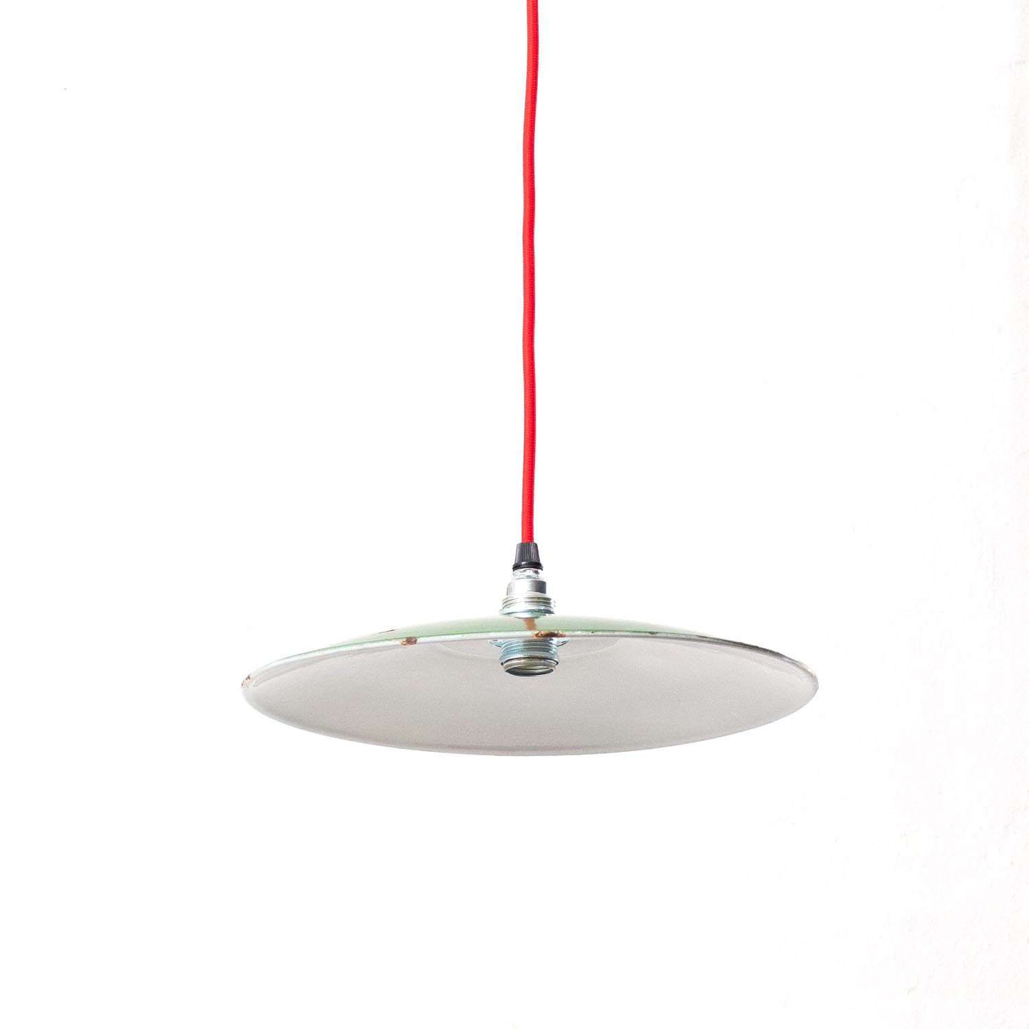 Aus alten Fabriken, Werkstätten und Scheunen in Frankreich und ganz Europa geborgen, bringt jede JØLG-Industrieleuchte ihre eigene Geschichte mit in deine vier Wände. Jeder Lampenschirm ist ein Unikat und weist eine unverwechselbare Patina auf. Formschöne, ganz klassische französische emaillierte Hängelampe mit zauberhafter Patina. Patina: Deutliche Spuren der Zeit, alle Roststellen sind konserviert, so das nicht mehr weiter rosten kann. Material: Emailliertes Metall Farbe: Außen Grün, Innen Weiß Herkunft/Alter: Frankreich, ca. 1940 - 1960 Aufhängung: Direkt am Kabel Maße: Ø 36 cm, Höhe 21 cm zzgl. ca 3 cm Aufhängung Fassung: E27-Fassung** Textilkabel: Länge und Farbe nach deinen Wünschen. Im Grundpreis sind 1,2 Meter Textilkabel enthalten. Was haben wir mit deiner Lampe gemacht?Die Lampenschirme werden sorgfältig gereinigt, dabei wird die Patina so gut es geht erhalten. Anschließend werden die Leuchten komplett neu elektrifiziert, so dass sie den aktuellen Sicherheitsstandards entsprechen.Dein individuelles Licht mit GeschichteUm die Industrielampe zum individuellen Designstück zu machen, kannst du sie mit einem bunten Textilkabel nach deinen Vorstellungen gestalten. Wähle einfach ein Kabel aus und bestimme zusätzlich die ideale Länge des Kabels anhand deiner Gegebenheiten vor Ort. Im Grundpreis sind 1.2 m Kabel enthalten. Bei der Auswahl kannst du zwischen Längen bis 5 m wählen - auf direkte Nachfrage können wir auch ein deutlich längeres Kabel anbringen. Die Lampe richtig installierenUm die Elektroinstallation an der Decke zu verdecken kannst du entweder einen weißen oder schwarzen Baldachin aus Hartplastik (Ø 65 mm – Höhe 67 mm) wählen - dieser ist im Preis enthalten. Weitere Baldachine (z. B. Porzellan- oder Abzweig-Baldachine) sind im Shop verfügbar. In unserem Magazin findest du eine reihe hilfreicher Tipps, auch gerade dann wenn der Stromanschluss nicht an der Stelle ist, an dem die Lampe hängen soll.Wie kommt deine Lampe zu dir?Deine restaurierte JØLG Leuchte kommt fertig angeschlossen, nach deinen individuellen Vorgaben und inkl. einer Anleitung mit Tipps & Tricks, sicher und umweltfreundlich verpackt zu dir nach Hause. Wir versenden ausschließlich mit DHL GoGreen. Im Lieferumfang sind keine Leuchtmittel enthalten. Im Shop findest du aber eine passende Auswahl an LED-Leuchtmitteln. Achte hierbei auf die passende Größe des Lampensockels (E14 oder E27).Viel Freude und Inspiration beim Auswählen und Zusammenstellen deiner Lampe wünscht dir dein Team von JØLG.*Da es sich bei den Industrieleuchten um gebrauchte Antiquitäten handelt, unterliegen die Produkte gem. § 25a UStG der Differenzbesteuerung. Somit ist für diese Artikel kein gesonderter Umsatzsteuerausweis möglich.**Die Leuchte ist geeignet für Leuchtmittel aller Energieklassen. Glühlampen und Halogenlampen bis 60 Watt.