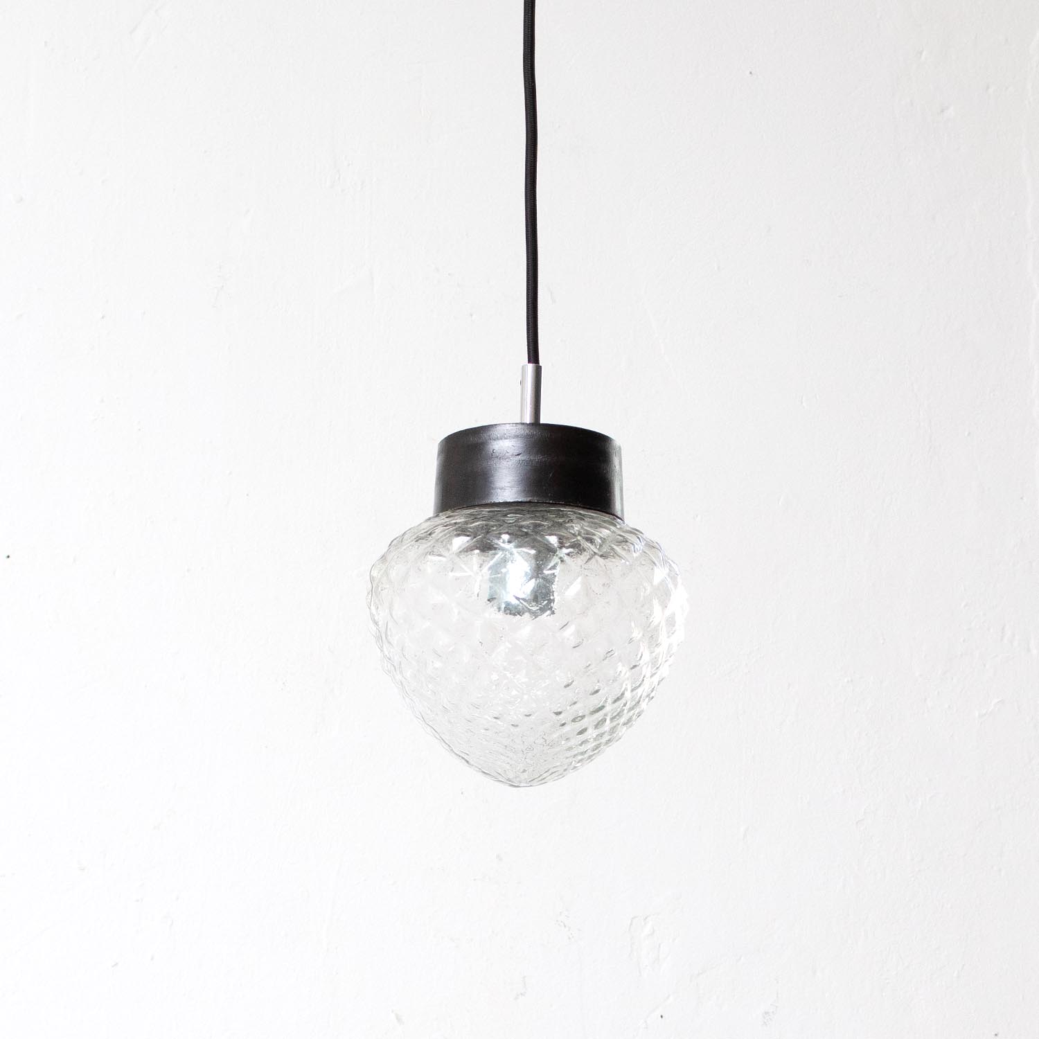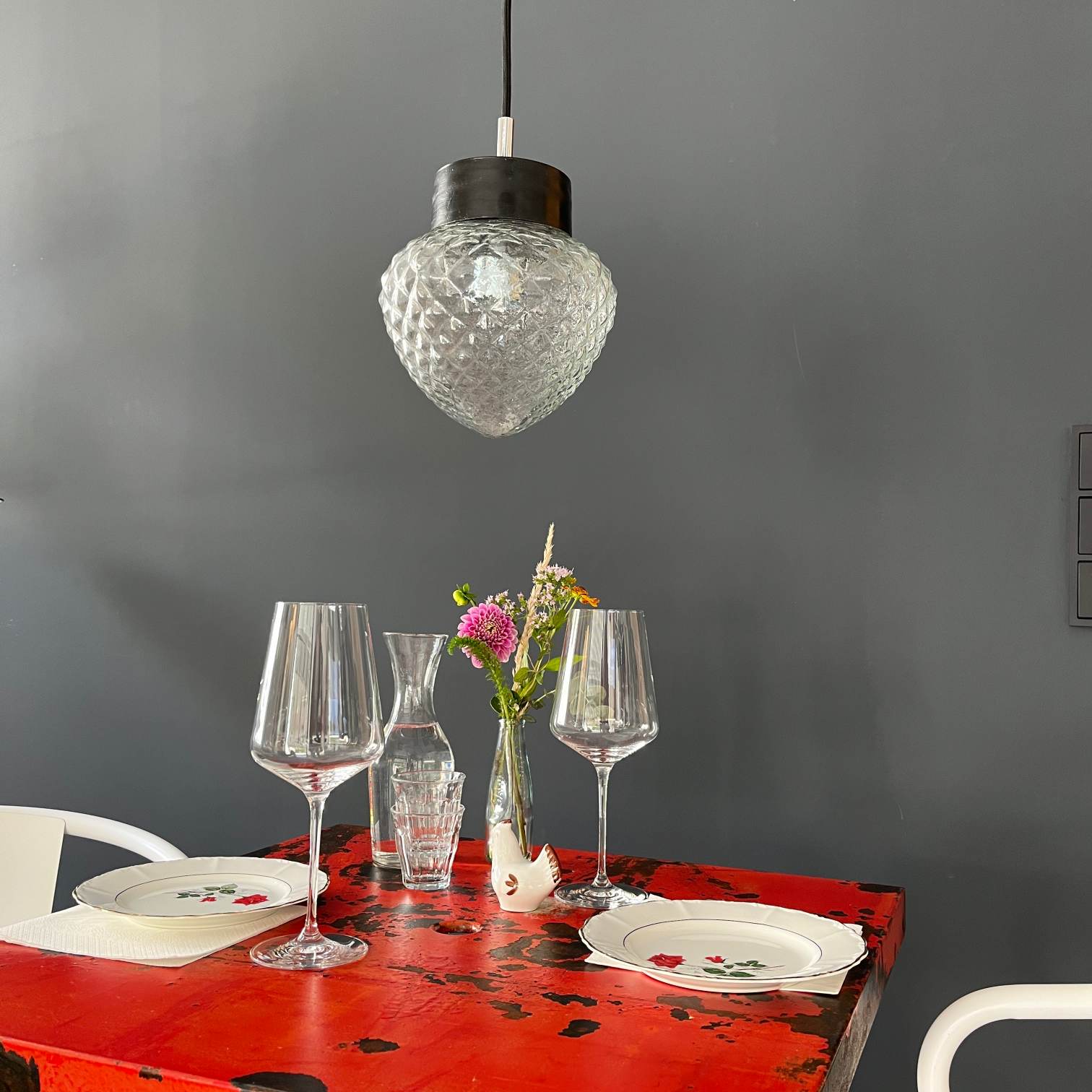 Diese einzigartige Hängelampe stammt aus einer ukrainischen Fabrik und war dort in den Fluren als Wandlampe montiert. Wir haben sie als Hängelampe umgebaut. Sie erinnert uns an eine Artischocke (oder doch lieber ein Diamant?) und haben sie daher so getauft. Mit dem Halter aus Bakelit und dem geschliffenen Glas ein echter Blickfang.