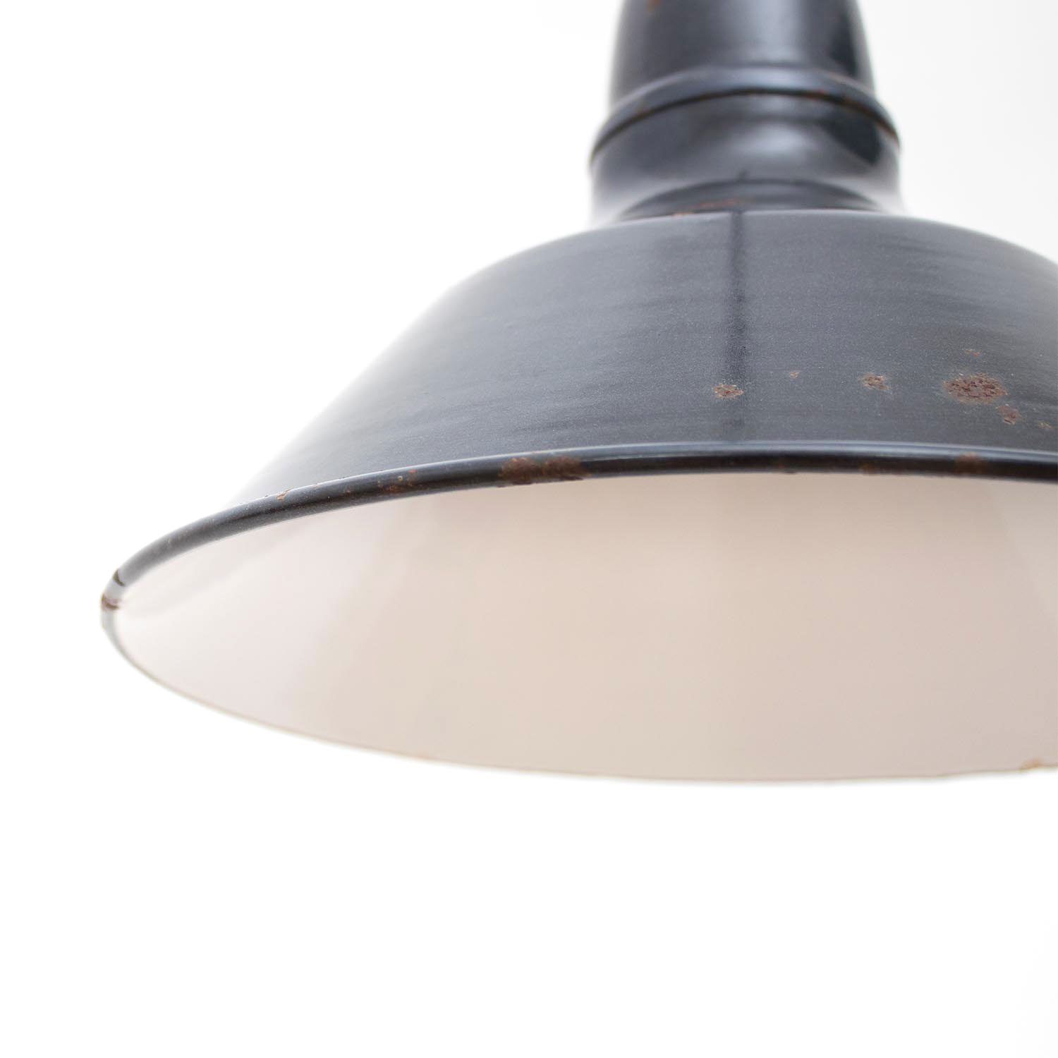 Aus alten Fabriken, Werkstätten und Scheunen in Frankreich und ganz Europa geborgen, bringt jede JØLG-Industrieleuchte ihre eigene Geschichte mit in deine vier Wände. Jeder Lampenschirm ist ein Unikat und weist eine unverwechselbare Patina auf. Deine einzigartige Industrie-Hängelampe hat viel zu erzählen - jetzt liegt es an dir, wie die Geschichte weitergeht! Patina: Sichtbare Spuren der Zeit Material: Emailliertes Metall Farbe: Außen Schwarz, Innen Weiß Aufhängung: Direkt am Kabel Maße: Ø 34 cm, Höhe 22 cm zzgl. ca 4 cm Aufhängung Fassung: E27-Fassung** Textilkabel: Länge und Kabelfarbe nach deinen Wünschen. Im Grundpreis sind 1,2 Meter Textilkabel enthalten. Was haben wir mit deiner Lampe gemacht?Die Lampenschirme werden sorgfältig gereinigt, dabei wird die Patina so gut es geht erhalten. Anschließend werden die Leuchten komplett neu elektrifiziert, so dass sie den aktuellen Sicherheitsstandards entsprechen.Dein individuelles Licht mit GeschichteUm die Industrielampe zum individuellen Designstück zu machen, kannst du sie mit einem bunten Textilkabel nach deinen Vorstellungen gestalten. Wähle einfach ein Kabel aus und bestimme zusätzlich die ideale Länge des Kabels anhand deiner Gegebenheiten vor Ort. Im Grundpreis sind 1.2 m Kabel enthalten. Bei der Auswahl kannst du zwischen Längen bis 5 m wählen - auf direkte Nachfrage können wir auch ein deutlich längeres Kabel anbringen. Die Lampe richtig installierenUm die Elektroinstallation an der Decke zu verdecken kannst du entweder einen weißen oder schwarzen Baldachin aus Hartplastik (Ø 65 mm – Höhe 67 mm) wählen - dieser ist im Preis enthalten. Weitere Baldachine (z. B. Porzellan- oder Abzweig-Baldachine) sind im Shop verfügbar. In unserem Magazin findest du eine reihe hilfreicher Tipps, auch gerade dann wenn der Stromanschluss nicht an der Stelle ist, an dem die Lampe hängen soll.Wie kommt deine Lampe zu dir?Deine restaurierte JØLG Leuchte kommt fertig angeschlossen, nach deinen individuellen Vorgaben und inkl. einer Anleitung mit Tipps & Tricks, sicher und umweltfreundlich verpackt zu dir nach Hause. Wir versenden ausschließlich mit DHL GoGreen. Im Lieferumfang sind keine Leuchtmittel enthalten. Im Shop findest du aber eine passende Auswahl an LED-Leuchtmitteln. Achte hierbei auf die passende Größe des Lampensockels (E14 oder E27).Viel Freude und Inspiration beim Auswählen und Zusammenstellen deiner Lampe wünscht dir dein Team von JØLG.*Da es sich bei den Industrieleuchten um gebrauchte Antiquitäten handelt, unterliegen die Produkte gem. § 25a UStG der Differenzbesteuerung. Somit ist für diese Artikel kein gesonderter Umsatzsteuerausweis möglich.**Die Leuchte ist geeignet für Leuchtmittel aller Energieklassen. Glühlampen und Halogenlampen bis 60 Watt.