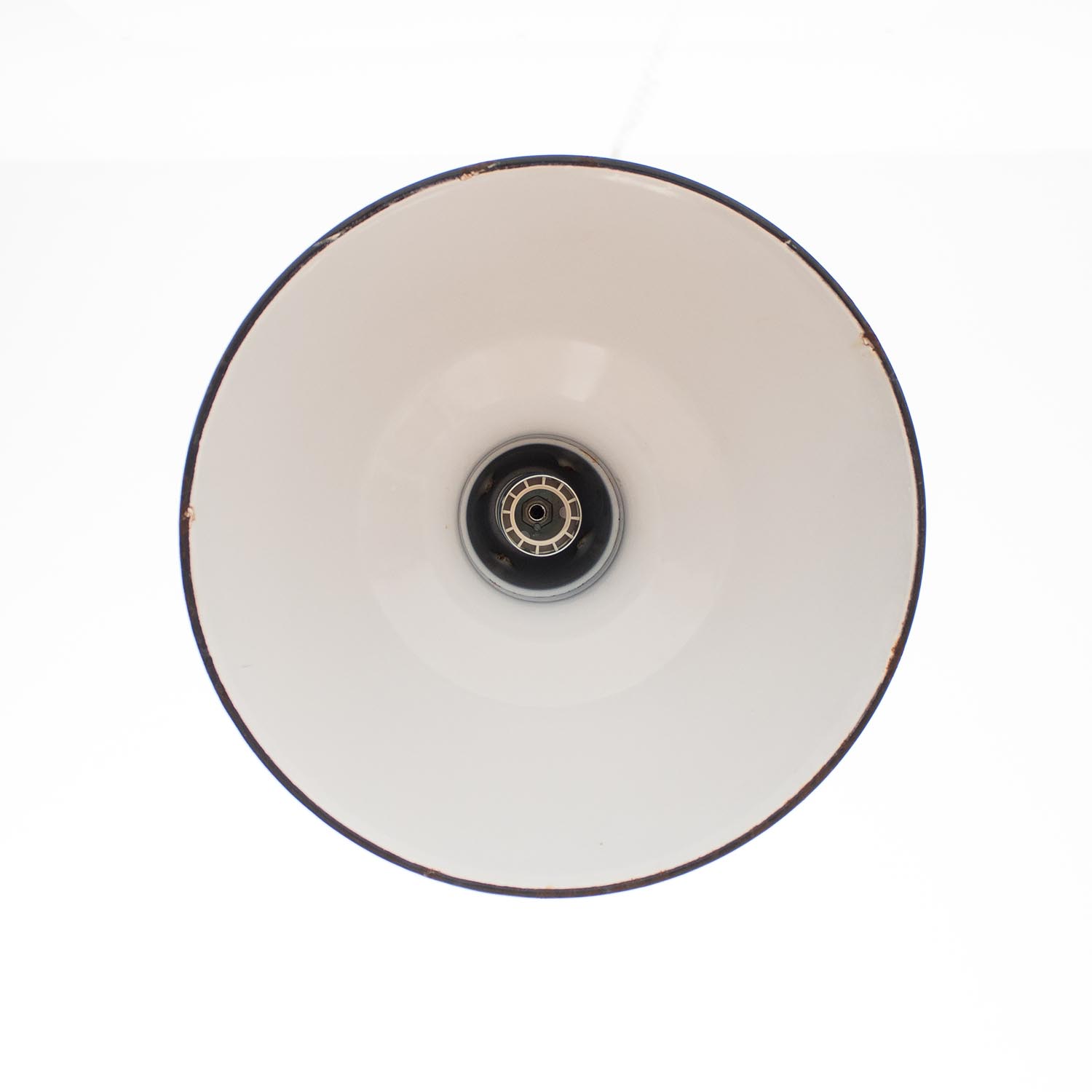 Diese Lampen wurden ursprünglich zur Beleuchtung von Montagehallen und Werkstätten konzipiert, so sorgten Sie ursprünglich für eine gleichmäßige Ausleuchtung von Arbeistbereichen. Durch die weiße Emaillierung im inneren der Leuchte wird dieser Effekt nochmals verstärkt. Patina: Sichtbare Spuren der Zeit Material: Emailliertes Metall Farbe: Außen Schwarz, Innen Weiß Herkunft/Alter: Original Ebolicht (Erkennbar an dem kleinen Ring am Lampenschaft), Deutschland, ca. 1920 - 1940 Aufhängung: Direkt am Kabel Maße: Ø 35 cm, Höhe 24 cm zzgl. ca 3 cm Fassung Fassung: E27-Fassung** Textilkabel: Länge und Farbe nach deinen Wünschen. Im Grundpreis sind 1,2 Meter Textilkabel enthalten. Was haben wir mit deiner Lampe gemacht?Die Lampenschirme werden sorgfältig gereinigt, dabei wird die Patina so gut es geht erhalten. Anschließend werden die Leuchten komplett neu elektrifiziert, so dass sie den aktuellen Sicherheitsstandards entsprechen.Dein individuelles Licht mit GeschichteUm die Industrielampe zum individuellen Designstück zu machen, kannst du sie mit einem bunten Textilkabel nach deinen Vorstellungen gestalten. Wähle einfach ein Kabel aus und bestimme zusätzlich die ideale Länge des Kabels anhand deiner Gegebenheiten vor Ort. Im Grundpreis sind 1.2 m Kabel enthalten. Bei der Auswahl kannst du zwischen Längen bis 5 m wählen - auf direkte Nachfrage können wir auch ein deutlich längeres Kabel anbringen. Die Lampe richtig installierenUm die Elektroinstallation an der Decke zu verdecken kannst du entweder einen weißen oder schwarzen Baldachin aus Hartplastik (Ø 65 mm – Höhe 67 mm) wählen - dieser ist im Preis enthalten. Weitere Baldachine (z. B. Porzellan- oder Abzweig-Baldachine) sind im Shop verfügbar. In unserem Magazin findest du eine reihe hilfreicher Tipps, auch gerade dann wenn der Stromanschluss nicht an der Stelle ist, an dem die Lampe hängen soll.Wie kommt deine Lampe zu dir?Deine restaurierte JØLG Leuchte kommt fertig angeschlossen, nach deinen individuellen Vorgaben und inkl. einer Anleitung mit Tipps & Tricks, sicher und umweltfreundlich verpackt zu dir nach Hause. Wir versenden ausschließlich mit DHL GoGreen. Im Lieferumfang sind keine Leuchtmittel enthalten. Im Shop findest du aber eine passende Auswahl an LED-Leuchtmitteln. Achte hierbei auf die passende Größe des Lampensockels (E14 oder E27).Viel Freude und Inspiration beim Auswählen und Zusammenstellen deiner Lampe wünscht dir dein Team von JØLG.*Da es sich bei den Industrieleuchten um gebrauchte Antiquitäten handelt, unterliegen die Produkte gem. § 25a UStG der Differenzbesteuerung. Somit ist für diese Artikel kein gesonderter Umsatzsteuerausweis möglich.**Die Leuchte ist geeignet für Leuchtmittel aller Energieklassen. Glühlampen und Halogenlampen bis 60 Watt.