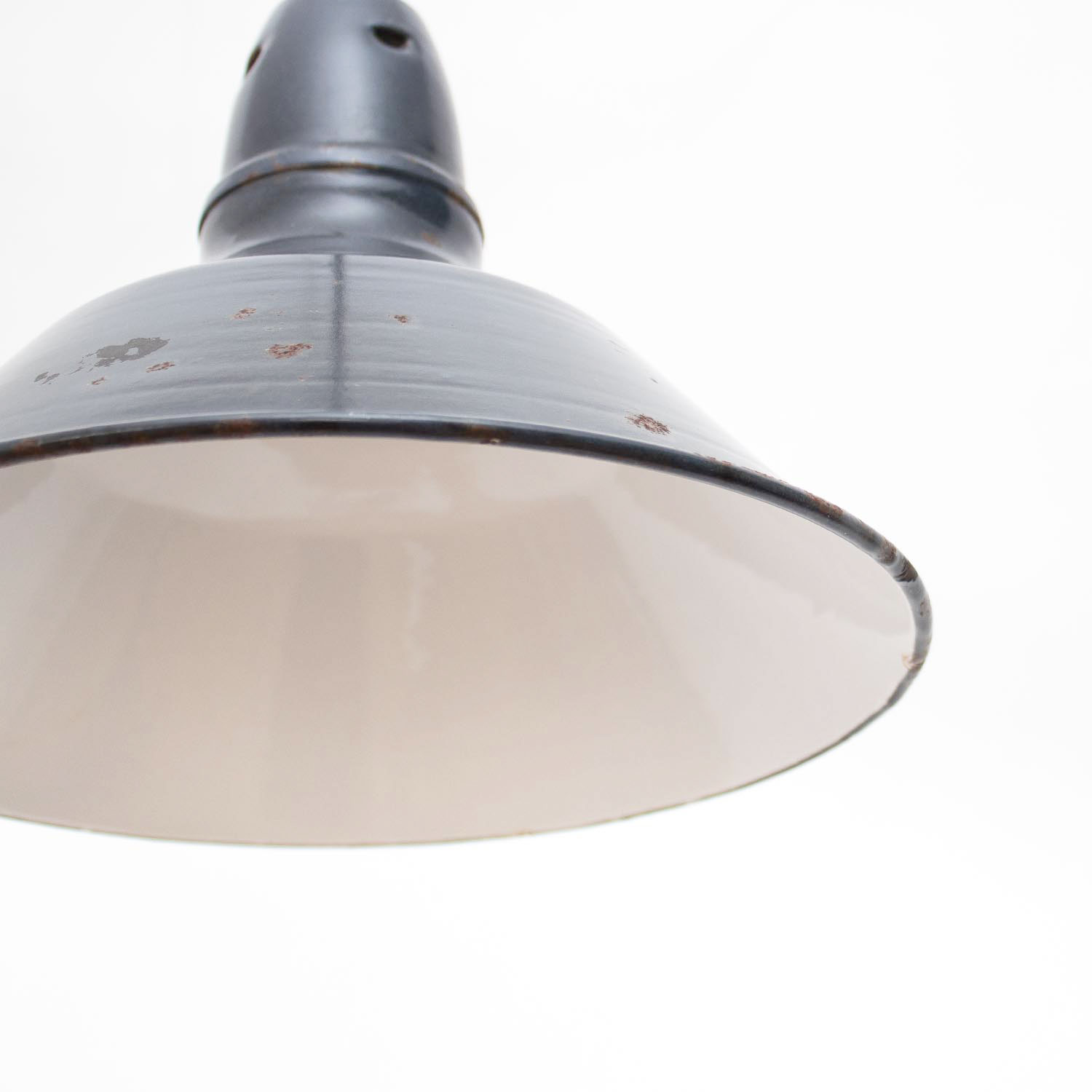 Diese Lampen wurden ursprünglich zur Beleuchtung von Montagehallen und Werkstätten konzipiert, so sorgten Sie ursprünglich für eine gleichmäßige Ausleuchtung von Arbeitsbereichen. Durch die weiße Emaillierung im inneren der Leuchte wird dieser Effekt nochmals verstärkt. Jeder Lampenschirm ist ein Unikat und weist eine unverwechselbare Patina auf.Patina: Sichtbare Spuren der ZeitMaterial: Emailliertes Metall Farbe: Außen Schwarz-Weiß gesprenkelt, Innen Weiß Herkunft/Alter: Frankreich, ca. 1930-1940Aufhängung: Direkt am KabelMaße: Ø 40 cm, Höhe 33 cm zzgl. ca. 2 cm Aufhängung Fassung: E27-Fassung** Textilkabel: Länge und Kabelfarbe nach deinen Wünschen. Im Grundpreis sind 1,2 Meter Textilkabel enthalten. Was haben wir mit deiner Lampe gemacht?Die Lampenschirme werden sorgfältig gereinigt, dabei wird die Patina so gut es geht erhalten. Anschließend werden die Leuchten komplett neu elektrifiziert, so dass sie den aktuellen Sicherheitsstandards entsprechen.Dein individuelles Licht mit GeschichteUm die Industrielampe zum individuellen Designstück zu machen, kannst du sie mit einem bunten Textilkabel nach deinen Vorstellungen gestalten. Wähle einfach ein Kabel aus und bestimme zusätzlich die ideale Länge des Kabels anhand deiner Gegebenheiten vor Ort. Im Grundpreis sind 1.2 m Kabel enthalten. Bei der Auswahl kannst du zwischen Längen bis 5 m wählen - auf direkte Nachfrage können wir auch ein deutlich längeres Kabel anbringen. Die Lampe richtig installierenUm die Elektroinstallation an der Decke zu verdecken kannst du entweder einen weißen oder schwarzen Baldachin aus Hartplastik (Ø 65 mm – Höhe 67 mm) wählen - dieser ist im Preis enthalten. Weitere Baldachine (z. B. Porzellan- oder Abzweig-Baldachine) sind im Shop verfügbar. In unserem Magazin findest du eine reihe hilfreicher Tipps, auch gerade dann wenn der Stromanschluss nicht an der Stelle ist, an dem die Lampe hängen soll.Wie kommt deine Lampe zu dir?Deine restaurierte JØLG Leuchte kommt fertig angeschlossen, nach deinen individuellen Vorgaben und inkl. einer Anleitung mit Tipps & Tricks, sicher und umweltfreundlich verpackt zu dir nach Hause. Wir versenden ausschließlich mit DHL GoGreen. Im Lieferumfang sind keine Leuchtmittel enthalten. Im Shop findest du aber eine passende Auswahl an LED-Leuchtmitteln. Achte hierbei auf die passende Größe des Lampensockels (E14 oder E27).Viel Freude und Inspiration beim Auswählen und Zusammenstellen deiner Lampe wünscht dir dein Team von JØLG.*Da es sich bei den Industrieleuchten um gebrauchte Antiquitäten handelt, unterliegen die Produkte gem. § 25a UStG der Differenzbesteuerung. Somit ist für diese Artikel kein gesonderter Umsatzsteuerausweis möglich.**Die Leuchte ist geeignet für Leuchtmittel aller Energieklassen. Glühlampen und Halogenlampen bis 60 Watt.
