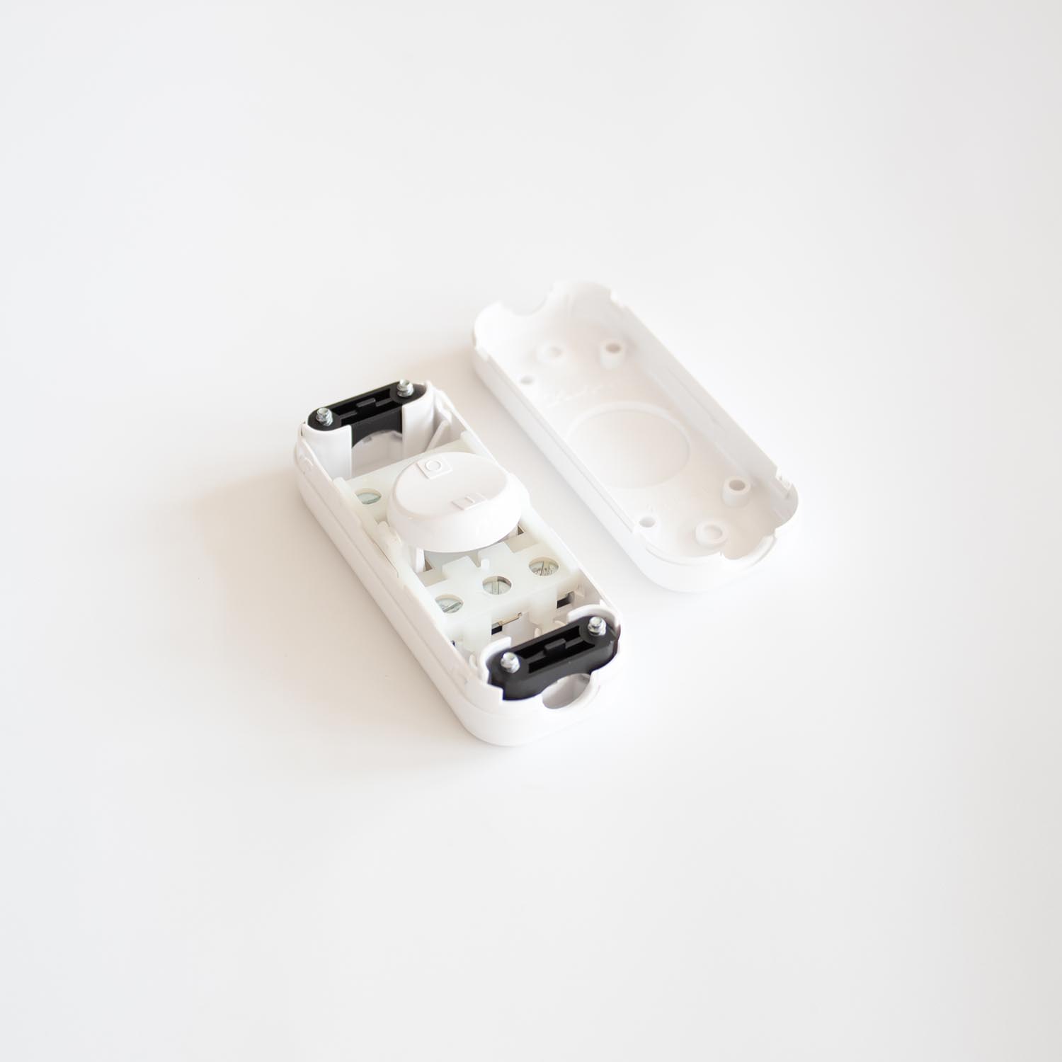 Schnur Zwischenschalter in Weiß, perfekt für die von uns angebotenen Textilkabel. Der Schalter ist ein wenig größer als herkömmliche Schalter, jedoch haben wir sehr viele Schalter getestet und dieser garantiert mit seinen PE Klemmen eine einfache Installation, gerade wenn textilummantelte Kabel genutzt werden.