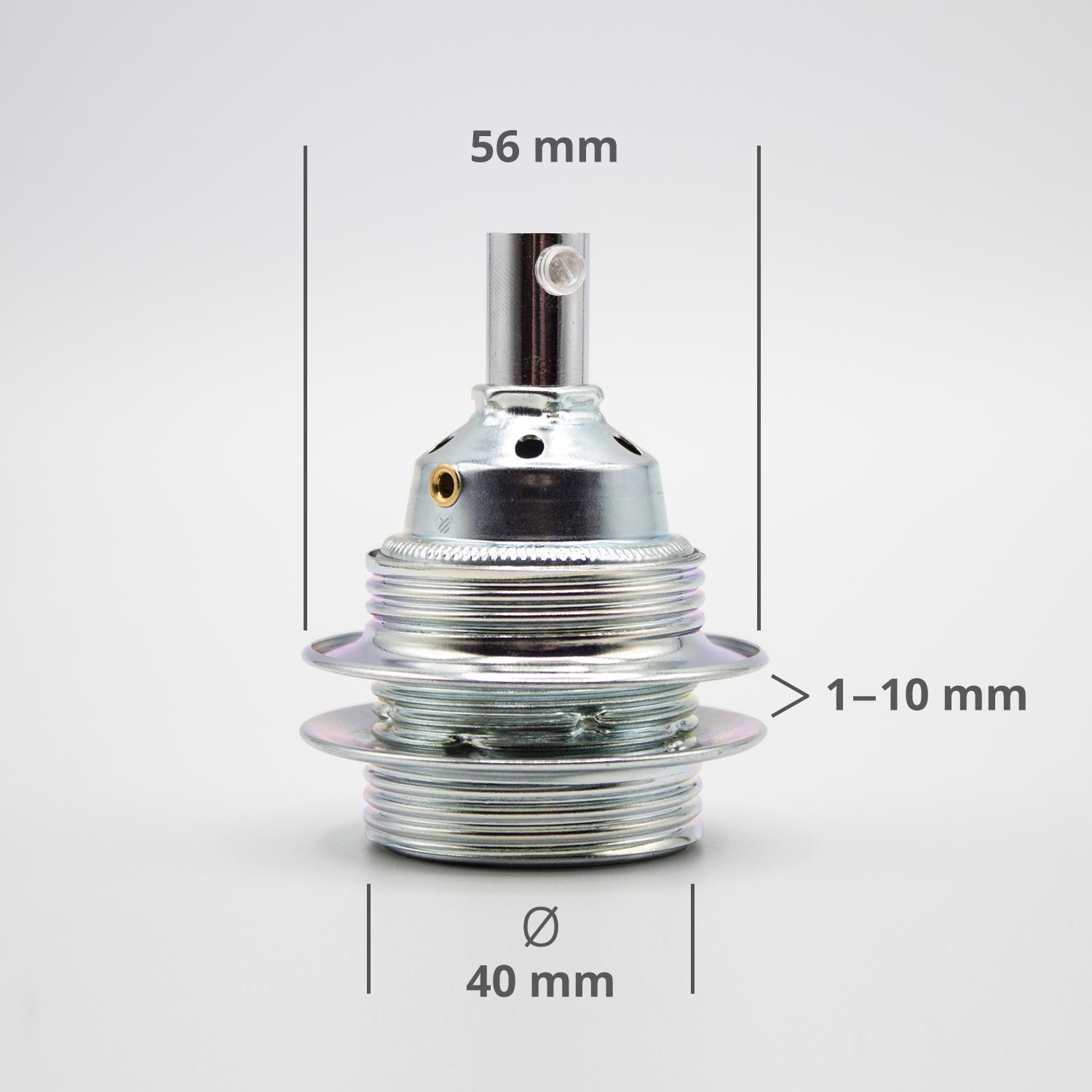 • Ø Fassung: 40 mm (das heißt beim Leuchtenbau muss euer Loch im Werkstück/Lampenschrim einen ø von 40 mm haben)