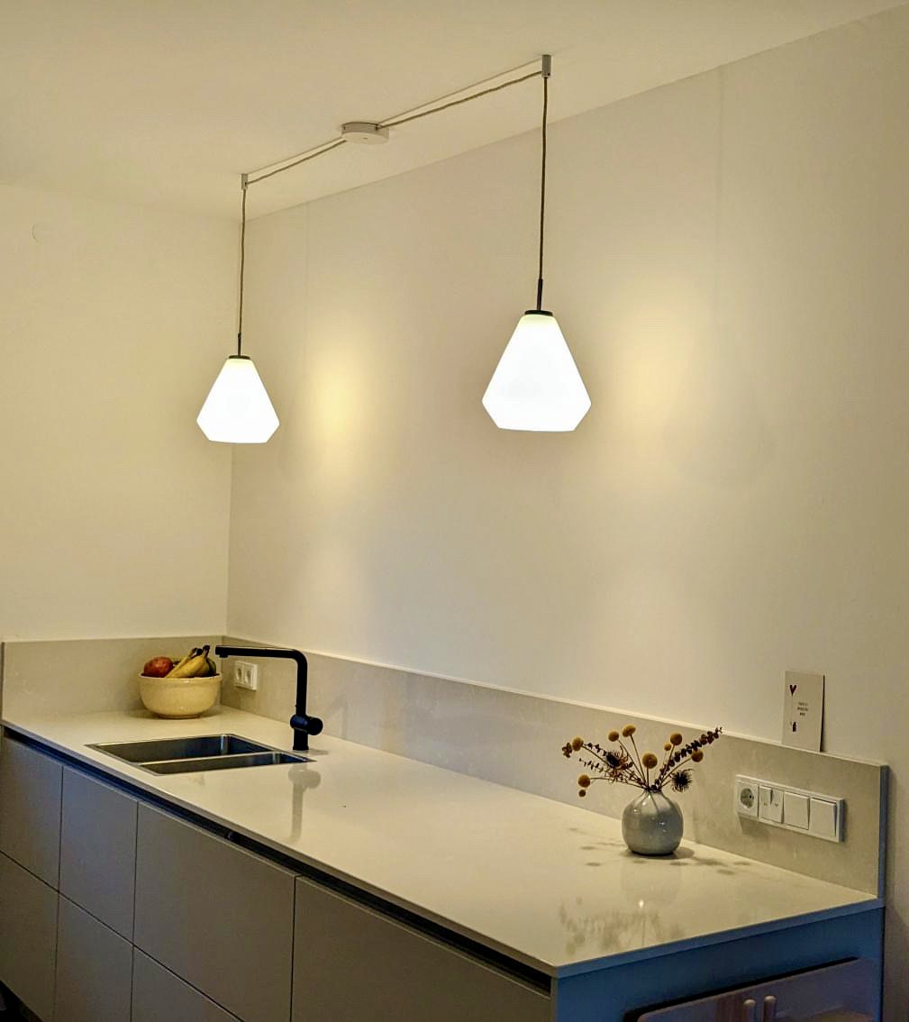Die Distanzaufhängung kommt dann zum Einsatz, wenn sich der Stromanschluss nicht direkt über deiner Lampe befindet. Mit der so genannten Affenschaukel lässt sich das Kabel an die gewünschte Position im Raum umlenken – ganz unabhängig davon, wo sich der Stromanschluss an der Decke befindet. In der Deckenbefestigung ist eine kleine Schraube um das Kabel zu fixieren, damit es gesichert ist und nicht weiterrutschen kann.