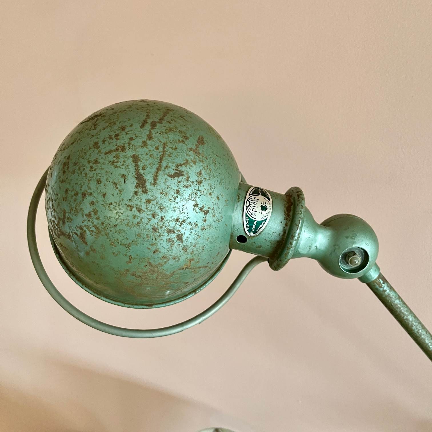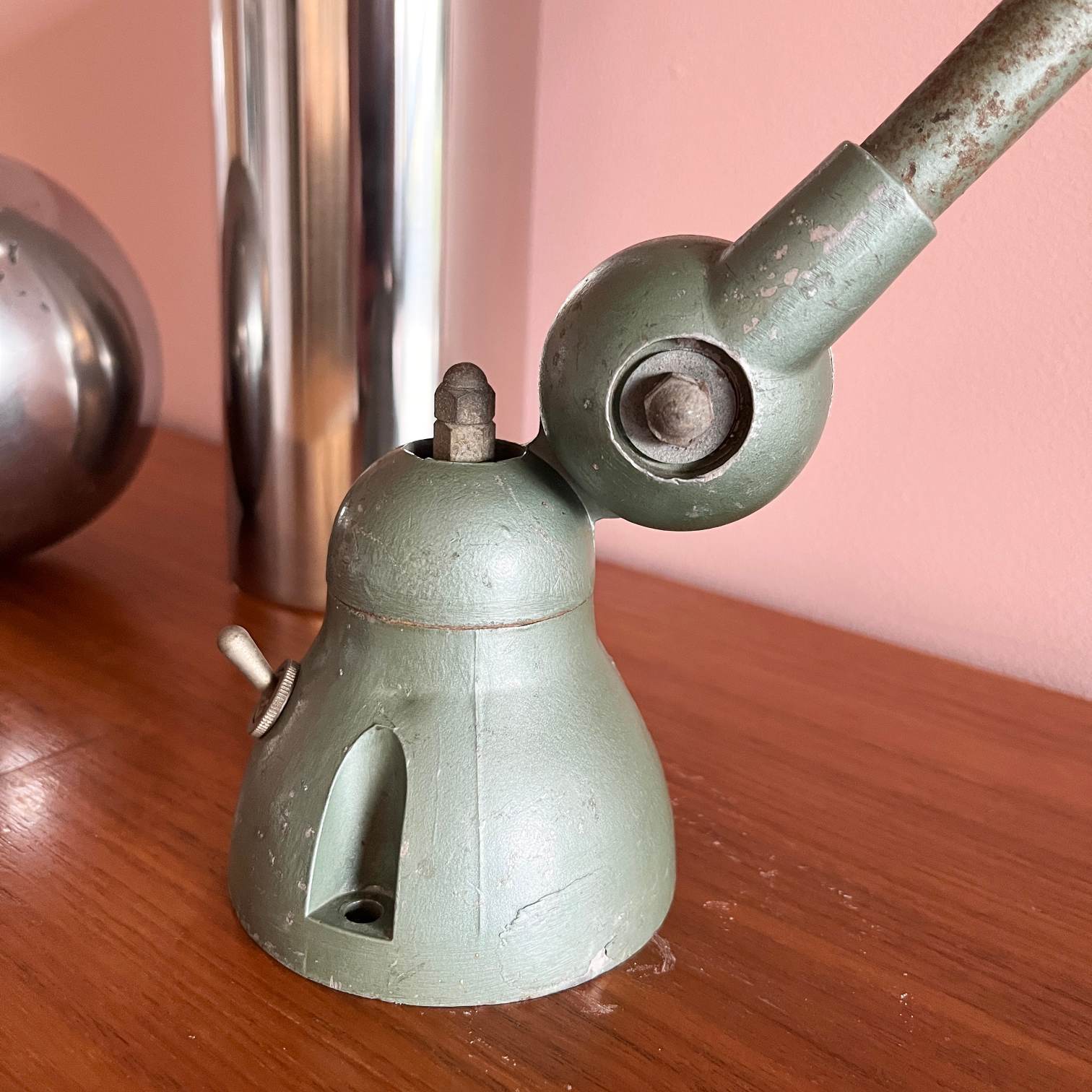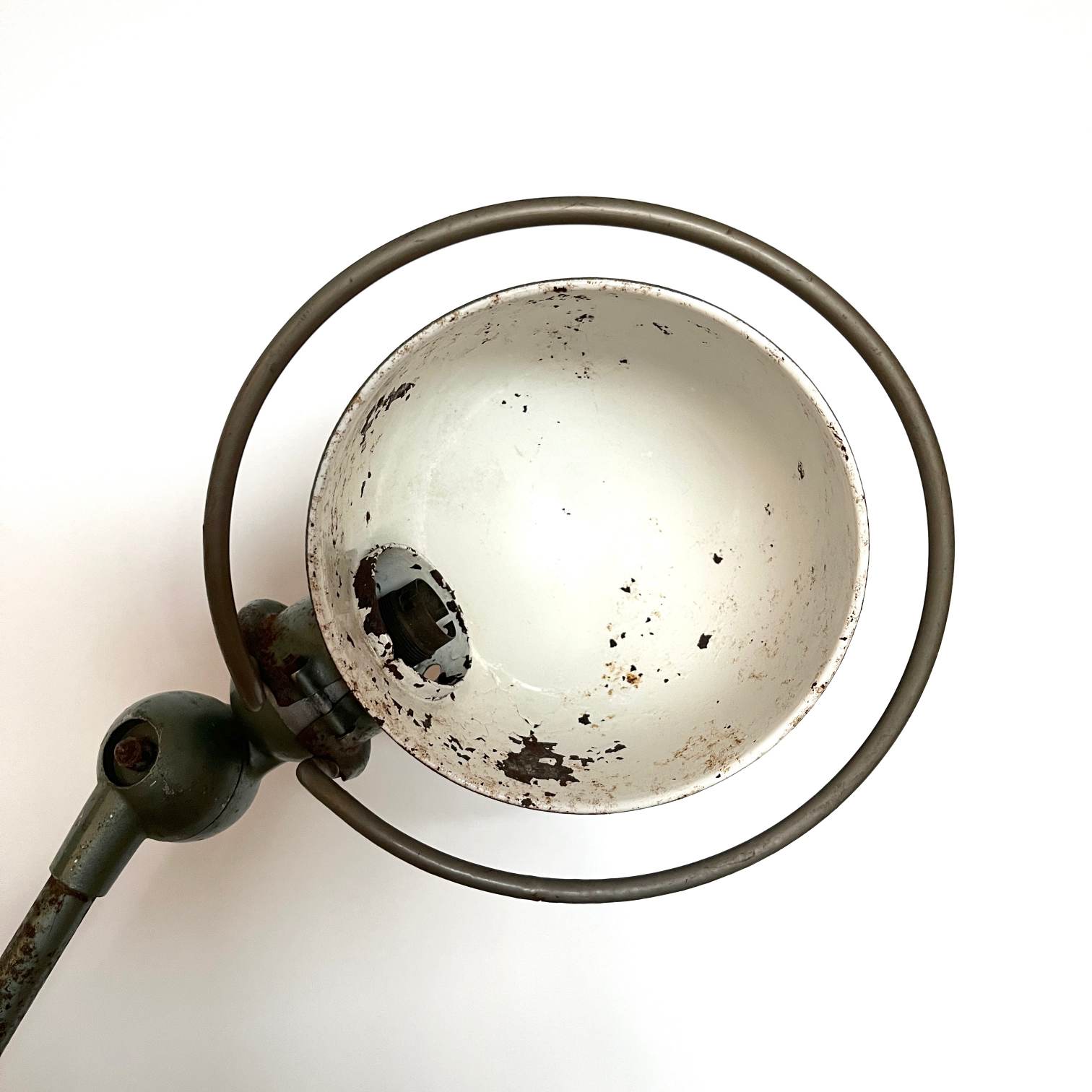 Alte original Jieldé Leuchte mit zwei Gelenkarmen: Ein wahres Kultobjekt des französischen Industrial-Designs! Gegen Ende der 1940er Jahre war Jean-Louis Domecq die Suche nach einer geeigneten Lampe für seine Werkstatt leid und er beschloss, seine eigene Lampe zu entwerfen. Sie sollte schlicht, robust und schwenkbar sein. Für eine perfekte Optik wird die gesamte Stromversorgung durch Verbindungen im Inneren der Arme und Gelenke sichergestellt und bleibt so vollständig unsichtbar. Dank der Kombination aus Gelenkarm und verstellbarem Lampenschirm lässt sich das Licht präzise an genau den richtigen Ort lenken.