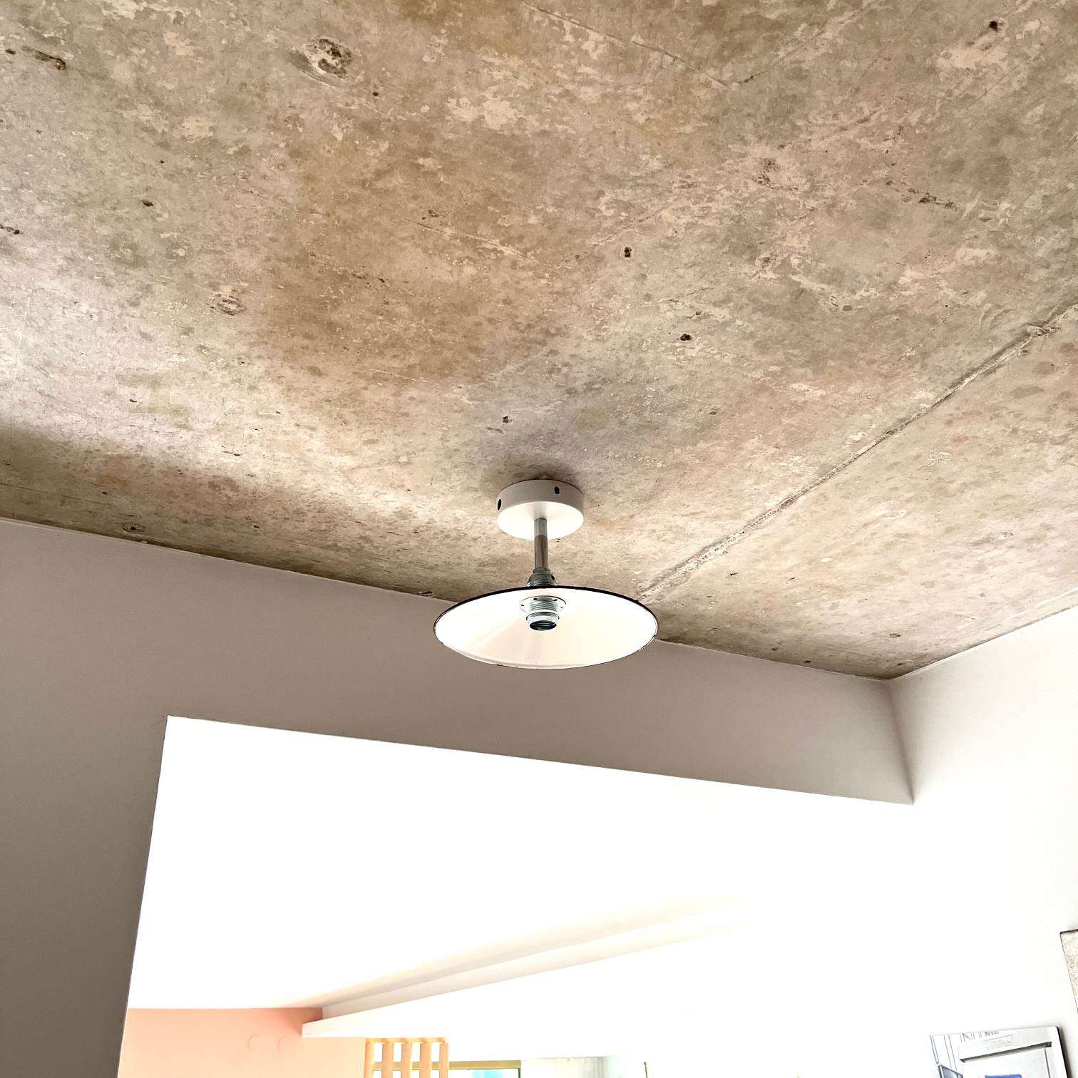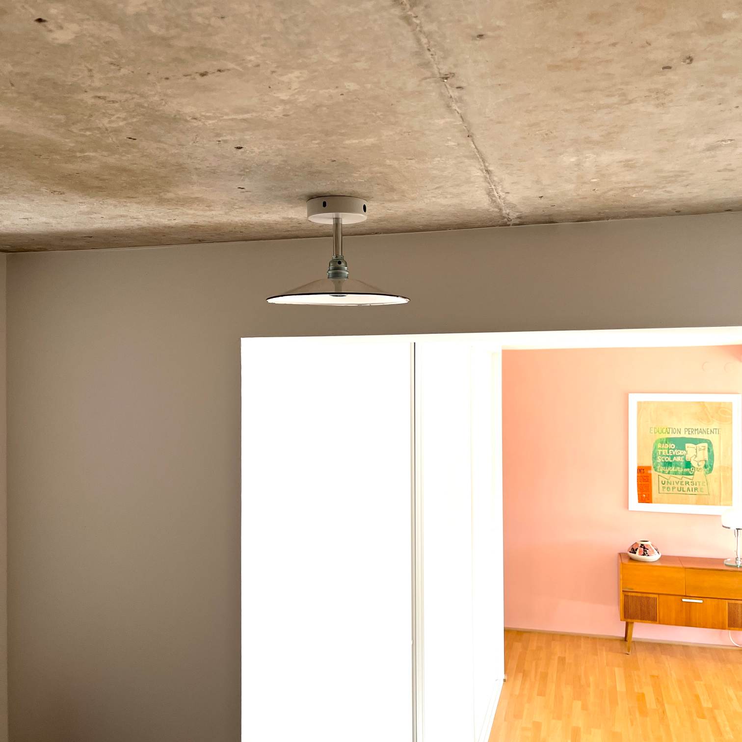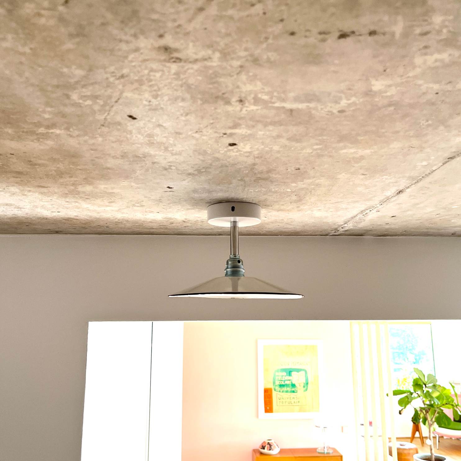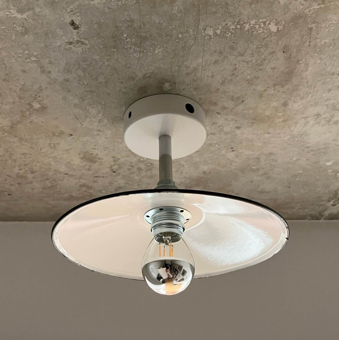 Deine einzigartige vintage Deckenleuchte ist eine sehr dezente und charmante flache Emaillelampe zur direkten Deckenmontage. Der weiße Emaille-Lampenschirm stammt aus einem alten Elektro-Lagerbestand aus Bayern, vermutlich aus den 1940er Jahren. Wir haben sie zur festen Deckenmontage mit einer verchromten Verlängerung an einen weißen Metallbaldachin montiert. Mit der festen Deckenbefestigung eignet sich die Leuchte perfekt für Flure und niedrige Räume. Auf den Fotos sind teilweise noch Seitenlöcher an dem Baldachin zu sehen. Diese können entweder mit dem gelieferten Zubehör verschlossen werden, oder sie dienen der Kabeleinführung, sollte der Lampenanschluss nicht dort sein wo die Lampe hängt oder wenn mehrere Lampen in Reihe geschaltet werden.