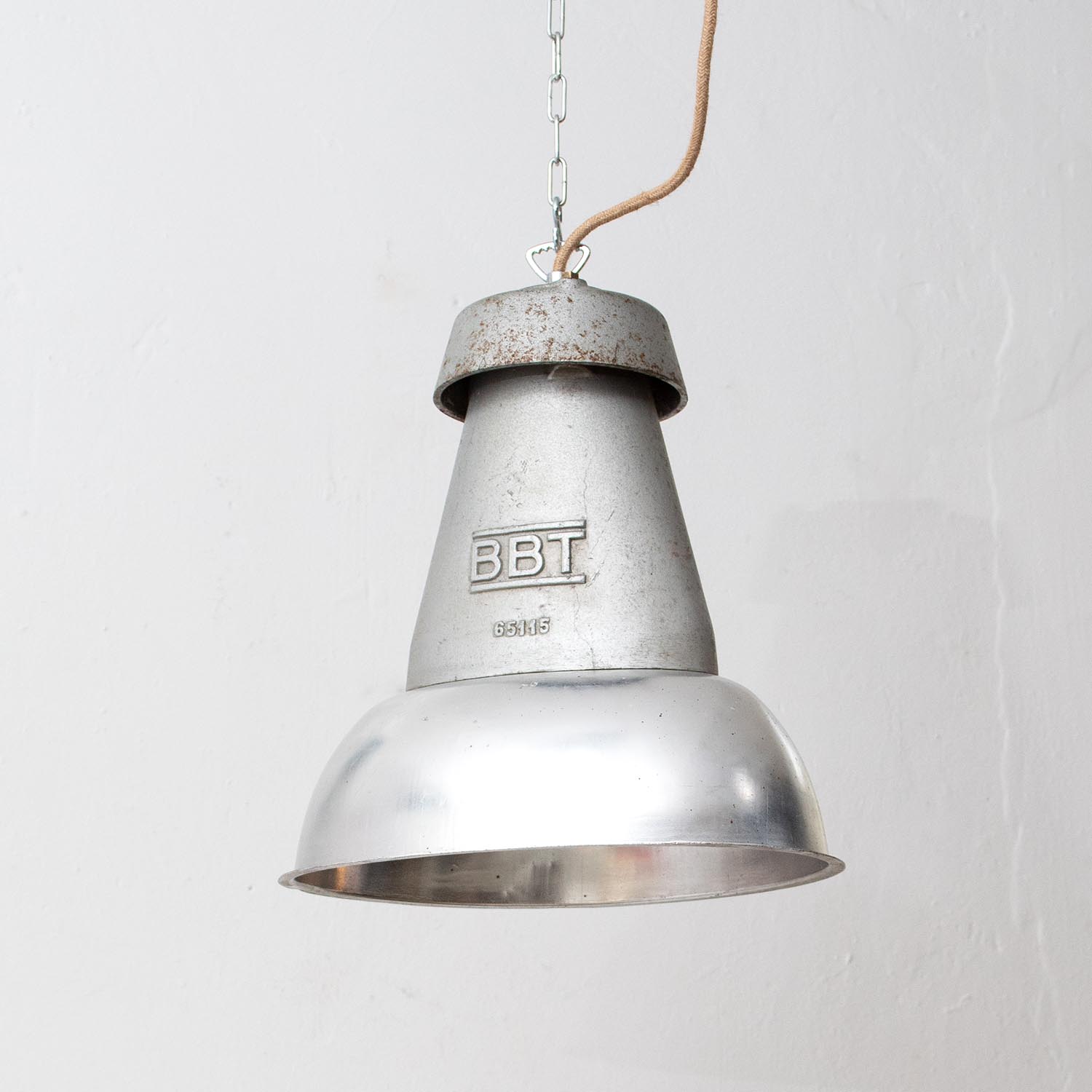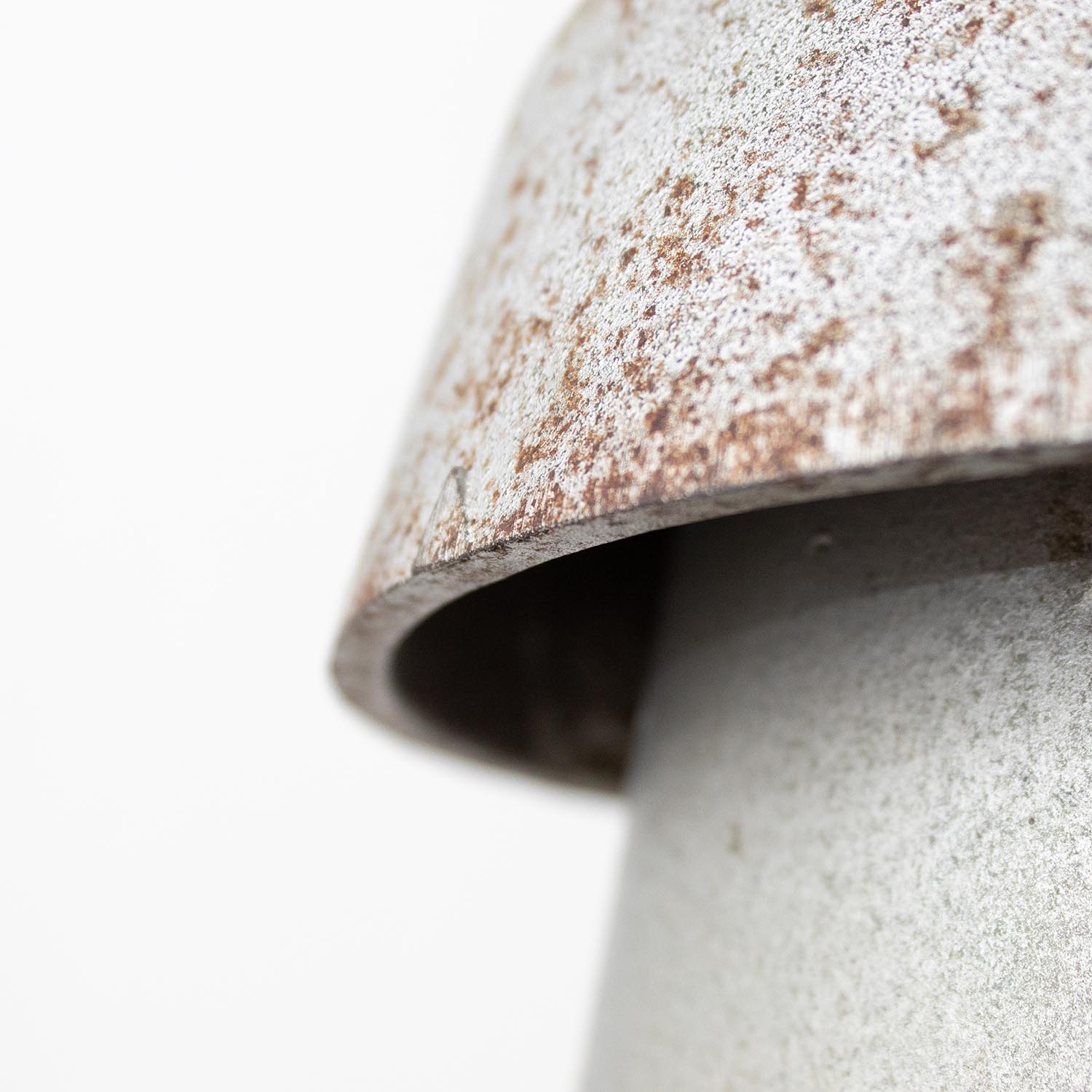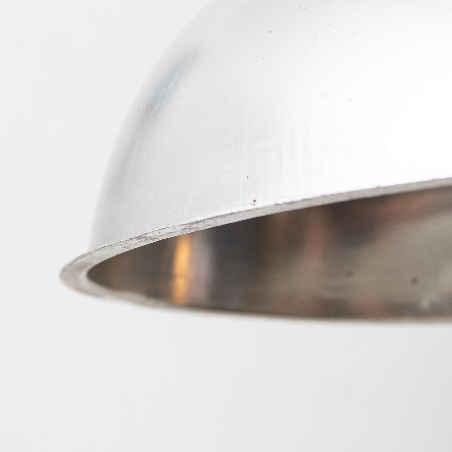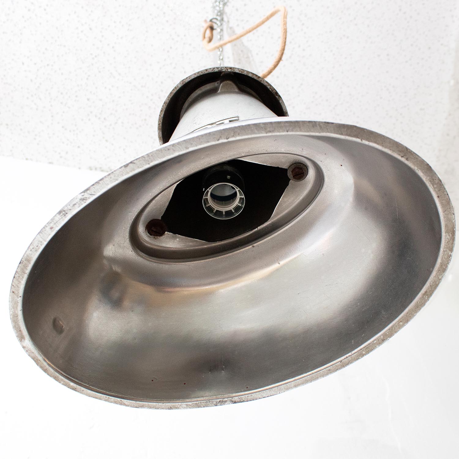 Diese Lampen wurden ursprünglich zur Beleuchtung von Montagehallen und Werkstätten konzipiert, so sorgten Sie ursprünglich für eine gleichmäßige Ausleuchtung von Arbeitsbereichen. Durch die weiße Emaillierung im inneren der Leuchte wird dieser Effekt nochmals verstärkt. Jeder Lampenschirm ist ein Unikat und weist eine unverwechselbare Patina auf.