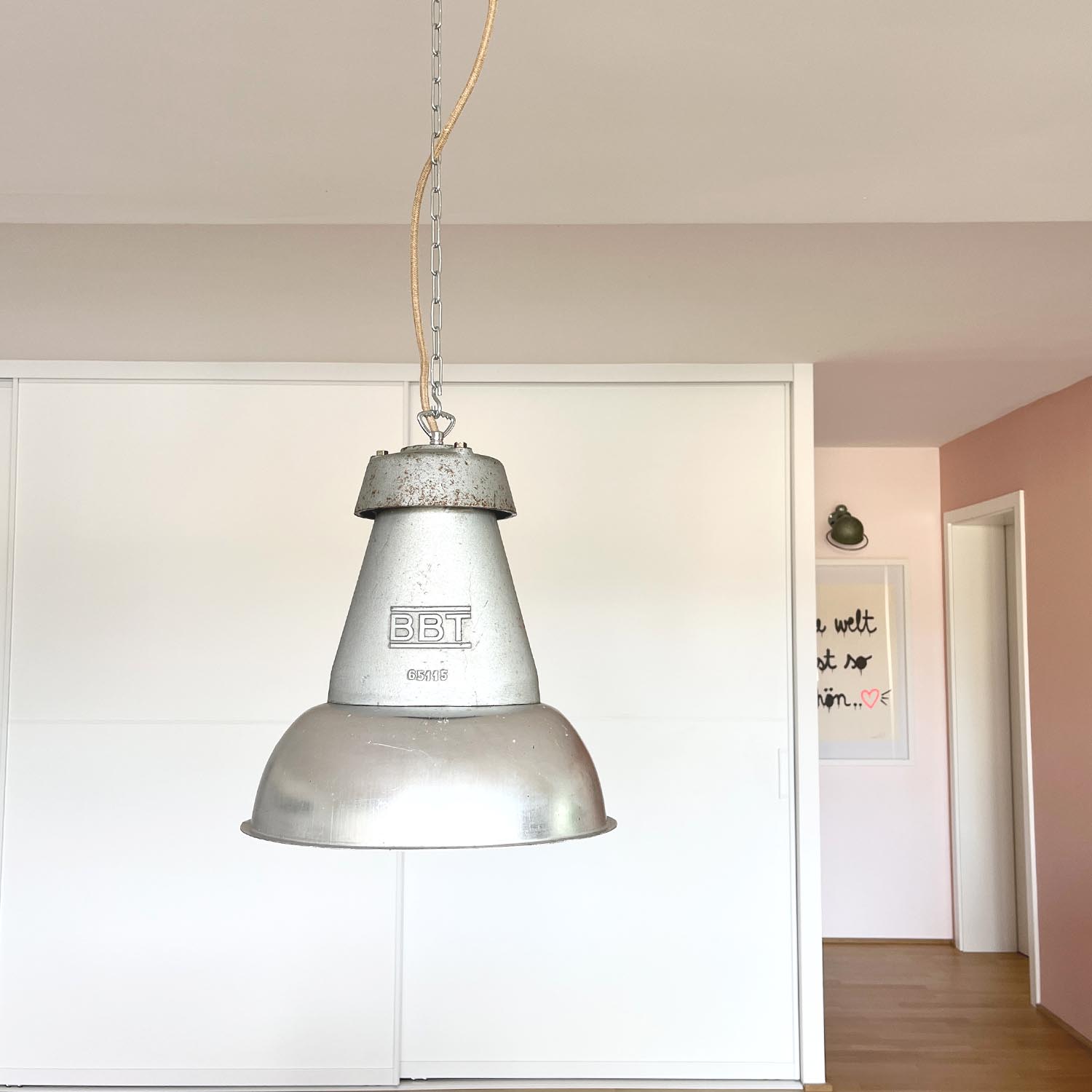 Diverse kleine Spuren der Zeit zieren diese antiken und gleichzeitig eleganten Leuchten. Genau das macht ihren unverwechselbaren Charme aus: Jede kleine Macke erzählt eine Geschichte. Verstaubt warten solche Vintage-Leuchten darauf, dass wir ihnen neues Leben einhauchen. Sorgfältig gereinigt, restauriert und mit einer neuen Fassung versehen sind unsere charakterstarken Industrielampen jetzt bereit für das nächste Kapitel ihrer Geschichte. Patina: Sichtbare Spuren der Zeit Material: Rohes gezogenes Alublech Farbe: Außen und Innen Silber/Alu Aufhängung: Direkt am Kabel Maße: Ø 26,5 cm, Höhe 24 cm zzgl. ca 2 cm Fassung Fassung: E27-Fassung** Textilkabel: Länge und Farbe nach deinen Wünschen. Im Grundpreis sind 1,2 Meter Textilkabel enthalten. Was haben wir mit deiner Lampe gemacht?Die Lampenschirme werden sorgfältig gereinigt, dabei wird die Patina so gut es geht erhalten. Anschließend werden die Leuchten komplett neu elektrifiziert, so dass sie den aktuellen Sicherheitsstandards entsprechen.Dein individuelles Licht mit GeschichteUm die Industrielampe zum individuellen Designstück zu machen, kannst du sie mit einem bunten Textilkabel nach deinen Vorstellungen gestalten. Wähle einfach ein Kabel aus und bestimme zusätzlich die ideale Länge des Kabels anhand deiner Gegebenheiten vor Ort. Im Grundpreis sind 1.2 m Kabel enthalten. Bei der Auswahl kannst du zwischen Längen bis 5 m wählen - auf direkte Nachfrage können wir auch ein deutlich längeres Kabel anbringen. Die Lampe richtig installierenUm die Elektroinstallation an der Decke zu verdecken kannst du entweder einen weißen oder schwarzen Baldachin aus Hartplastik (Ø 65 mm – Höhe 67 mm) wählen - dieser ist im Preis enthalten. Weitere Baldachine (z. B. Porzellan- oder Abzweig-Baldachine) sind im Shop verfügbar. In unserem Magazin findest du eine reihe hilfreicher Tipps, auch gerade dann wenn der Stromanschluss nicht an der Stelle ist, an dem die Lampe hängen soll.Wie kommt deine Lampe zu dir?Deine restaurierte JØLG Leuchte kommt fertig angeschlossen, nach deinen individuellen Vorgaben und inkl. einer Anleitung mit Tipps & Tricks, sicher und umweltfreundlich verpackt zu dir nach Hause. Wir versenden ausschließlich mit DHL GoGreen. Im Lieferumfang sind keine Leuchtmittel enthalten. Im Shop findest du aber eine passende Auswahl an LED-Leuchtmitteln. Achte hierbei auf die passende Größe des Lampensockels (E14 oder E27).Viel Freude und Inspiration beim Auswählen und Zusammenstellen deiner Lampe wünscht dir dein Team von JØLG.*Da es sich bei den Industrieleuchten um gebrauchte Antiquitäten handelt, unterliegen die Produkte gem. § 25a UStG der Differenzbesteuerung. Somit ist für diese Artikel kein gesonderter Umsatzsteuerausweis möglich.**Die Leuchte ist geeignet für Leuchtmittel aller Energieklassen. Glühlampen und Halogenlampen bis 60 Watt.
