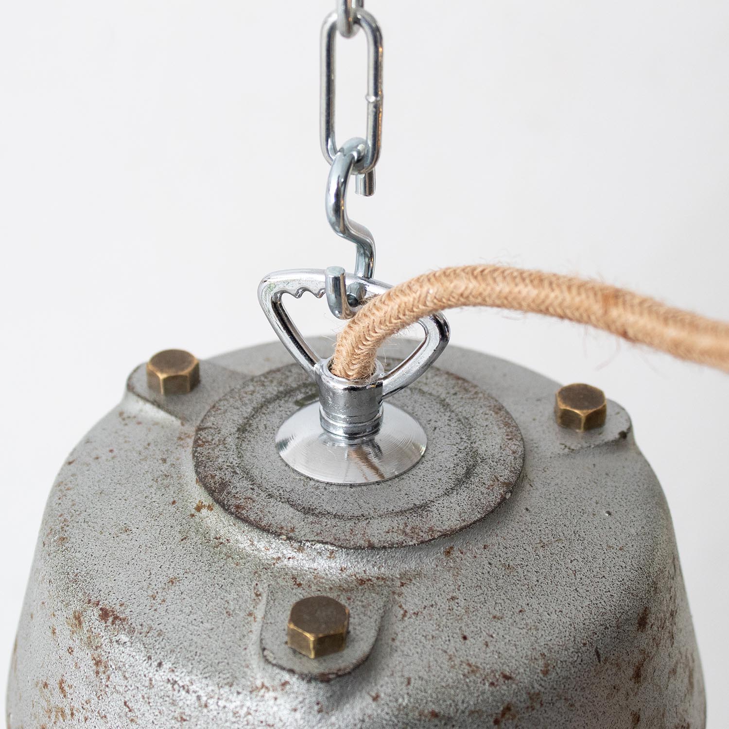 Diverse kleine Spuren der Zeit zieren dies alte und gleichzeitig elegante industrial Lampe. Genau das macht ihren unverwechselbaren Charme aus: Jede kleine Macke erzählt eine Story. Verstaubt warten solche Vintage-Leuchten darauf, dass wir ihnen neues Leben einhauchen. Patina: Sichtbare Spuren der Zeit Material: Metall Farbe: Grau Herkunft: Deutschland, ca. 1960 - 1980 Aufhängung: Direkt am Kabel Maße: Ø 12 cm, Höhe 15 cm zzgl. ca 2 cm Aufhängung Fassung: E27-Fassung** Textilkabel: Länge und Farbe nach deinen Wünschen. Im Grundpreis sind 1,2 Meter Textilkabel enthalten. Was haben wir mit deiner Lampe gemacht?Die Lampenschirme werden sorgfältig gereinigt, dabei wird die Patina so gut es geht erhalten. Anschließend werden die Leuchten komplett neu elektrifiziert, so dass sie den aktuellen Sicherheitsstandards entsprechen.Dein individuelles Licht mit GeschichteUm die Industrielampe zum individuellen Designstück zu machen, kannst du sie mit einem bunten Textilkabel nach deinen Vorstellungen gestalten. Wähle einfach ein Kabel aus und bestimme zusätzlich die ideale Länge des Kabels anhand deiner Gegebenheiten vor Ort. Im Grundpreis sind 1.2 m Kabel enthalten. Bei der Auswahl kannst du zwischen Längen bis 5 m wählen - auf direkte Nachfrage können wir auch ein deutlich längeres Kabel anbringen. Die Lampe richtig installierenUm die Elektroinstallation an der Decke zu verdecken kannst du entweder einen weißen oder schwarzen Baldachin aus Hartplastik (Ø 65 mm – Höhe 67 mm) wählen - dieser ist im Preis enthalten. Weitere Baldachine (z. B. Porzellan- oder Abzweig-Baldachine) sind im Shop verfügbar. In unserem Magazin findest du eine reihe hilfreicher Tipps, auch gerade dann wenn der Stromanschluss nicht an der Stelle ist, an dem die Lampe hängen soll.Wie kommt deine Lampe zu dir?Deine restaurierte JØLG Leuchte kommt fertig angeschlossen, nach deinen individuellen Vorgaben und inkl. einer Anleitung mit Tipps & Tricks, sicher und umweltfreundlich verpackt zu dir nach Hause. Wir versenden ausschließlich mit DHL GoGreen. Im Lieferumfang sind keine Leuchtmittel enthalten. Im Shop findest du aber eine passende Auswahl an LED-Leuchtmitteln. Achte hierbei auf die passende Größe des Lampensockels (E14 oder E27).Viel Freude und Inspiration beim Auswählen und Zusammenstellen deiner Lampe wünscht dir dein Team von JØLG.*Da es sich bei den Industrieleuchten um gebrauchte Antiquitäten handelt, unterliegen die Produkte gem. § 25a UStG der Differenzbesteuerung. Somit ist für diese Artikel kein gesonderter Umsatzsteuerausweis möglich.**Die Leuchte ist geeignet für Leuchtmittel aller Energieklassen. Glühlampen und Halogenlampen bis 60 Watt.