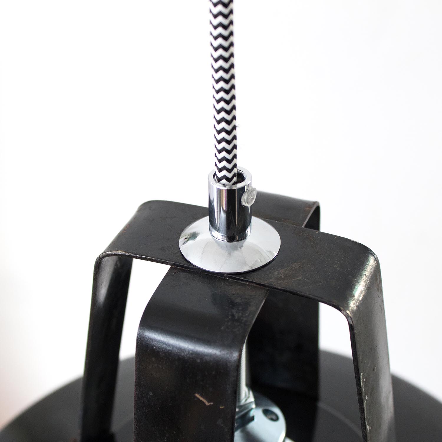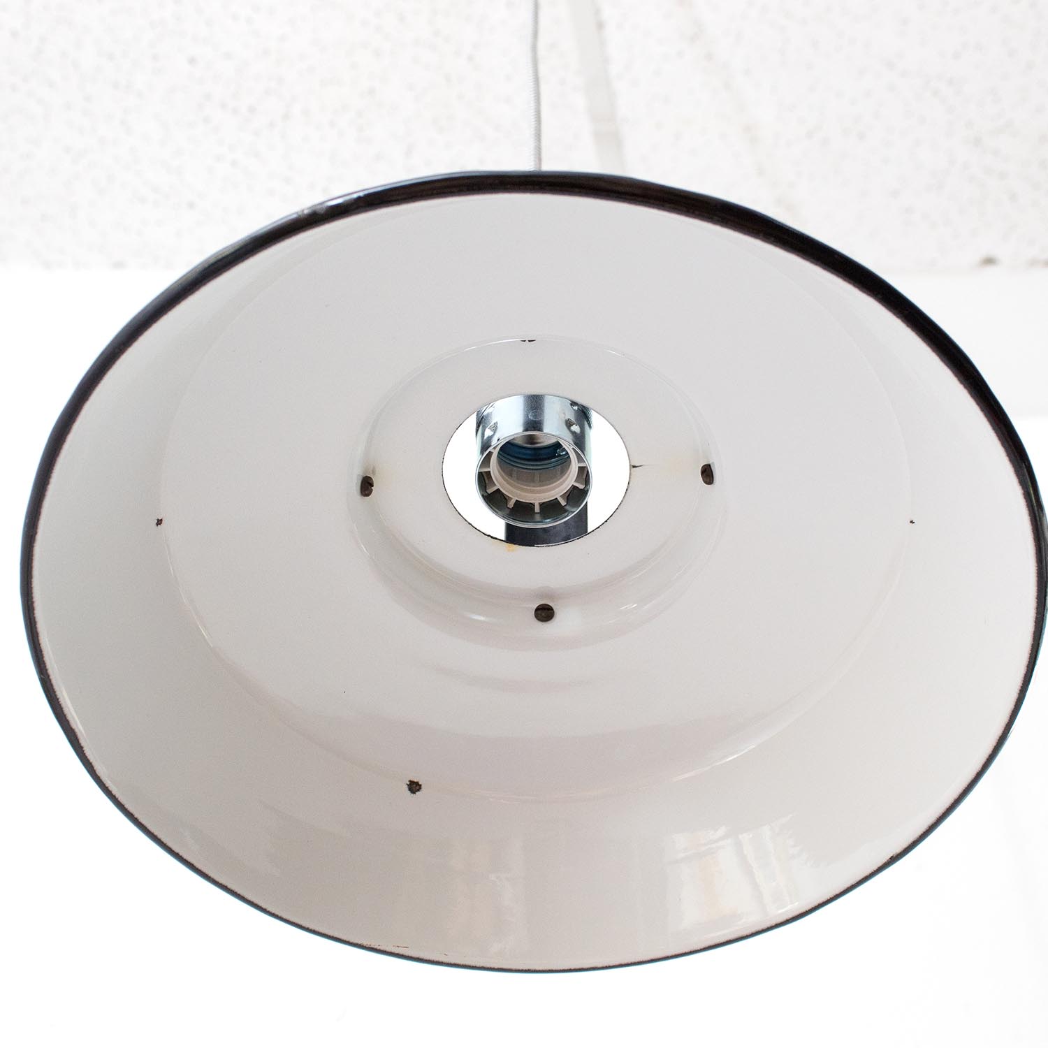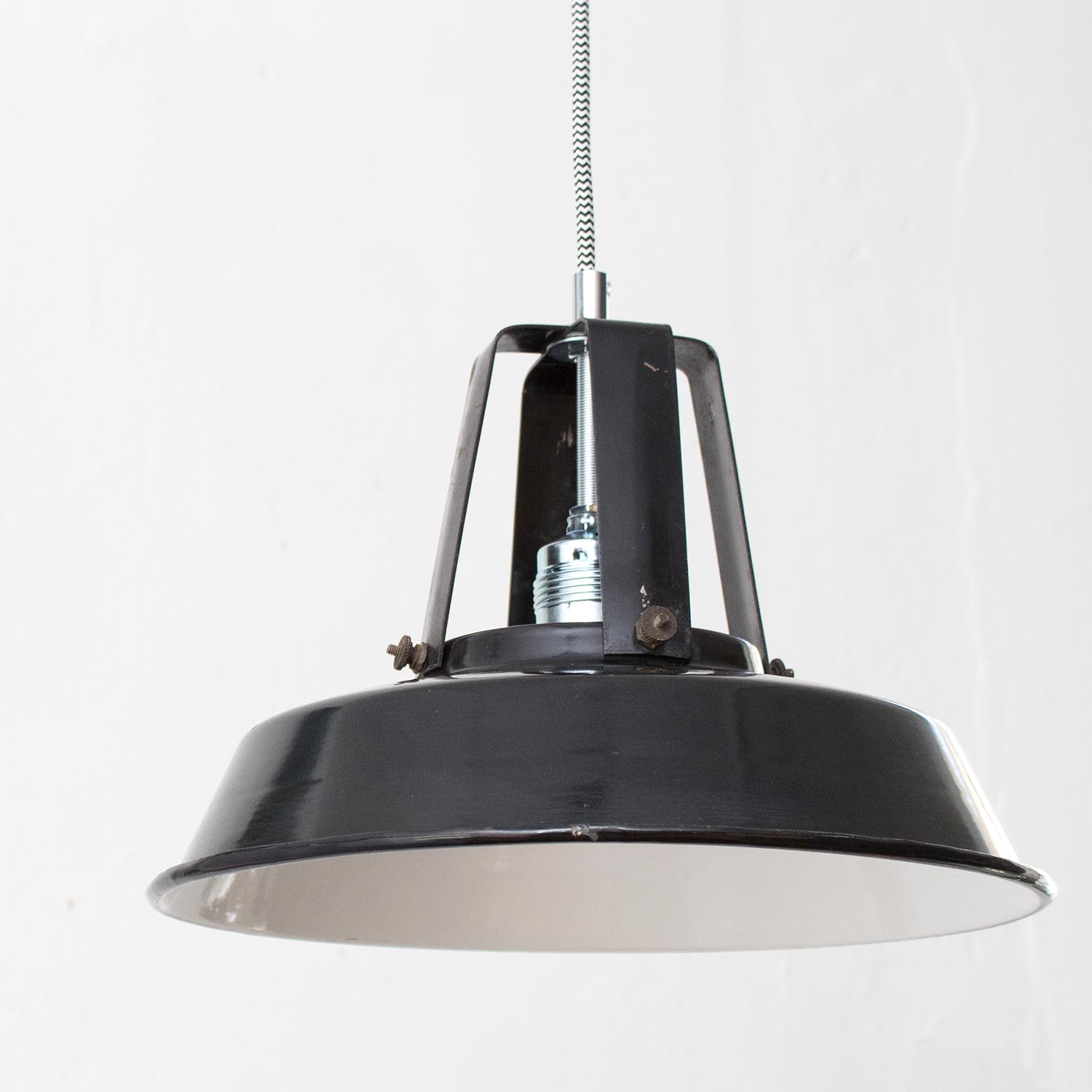 Diese Lampen wurden ursprünglich zur Beleuchtung von Montagehallen und Werkstätten konzipiert, so sorgten Sie ursprünglich für eine gleichmäßige Ausleuchtung von Arbeitsbereichen. Durch die weiße Emaillierung im inneren der Leuchte wird dieser Effekt nochmals verstärkt. Jeder Lampenschirm ist ein Unikat und weist eine unverwechselbare Patina auf.Patina: Sichtbare Spuren der ZeitMaterial: Emailliertes Metall Farbe: Außen Schwarz-Weiß gesprenkelt, Innen Weiß Herkunft/Alter: Frankreich, ca. 1930-1940Aufhängung: Direkt am KabelMaße: Ø 40 cm, Höhe 33 cm zzgl. ca. 2 cm Aufhängung Fassung: E27-Fassung** Textilkabel: Länge und Kabelfarbe nach deinen Wünschen. Im Grundpreis sind 1,2 Meter Textilkabel enthalten. Was haben wir mit deiner Lampe gemacht?Die Lampenschirme werden sorgfältig gereinigt, dabei wird die Patina so gut es geht erhalten. Anschließend werden die Leuchten komplett neu elektrifiziert, so dass sie den aktuellen Sicherheitsstandards entsprechen.Dein individuelles Licht mit GeschichteUm die Industrielampe zum individuellen Designstück zu machen, kannst du sie mit einem bunten Textilkabel nach deinen Vorstellungen gestalten. Wähle einfach ein Kabel aus und bestimme zusätzlich die ideale Länge des Kabels anhand deiner Gegebenheiten vor Ort. Im Grundpreis sind 1.2 m Kabel enthalten. Bei der Auswahl kannst du zwischen Längen bis 5 m wählen - auf direkte Nachfrage können wir auch ein deutlich längeres Kabel anbringen. Die Lampe richtig installierenUm die Elektroinstallation an der Decke zu verdecken kannst du entweder einen weißen oder schwarzen Baldachin aus Hartplastik (Ø 65 mm – Höhe 67 mm) wählen - dieser ist im Preis enthalten. Weitere Baldachine (z. B. Porzellan- oder Abzweig-Baldachine) sind im Shop verfügbar. In unserem Magazin findest du eine reihe hilfreicher Tipps, auch gerade dann wenn der Stromanschluss nicht an der Stelle ist, an dem die Lampe hängen soll.Wie kommt deine Lampe zu dir?Deine restaurierte JØLG Leuchte kommt fertig angeschlossen, nach deinen individuellen Vorgaben und inkl. einer Anleitung mit Tipps & Tricks, sicher und umweltfreundlich verpackt zu dir nach Hause. Wir versenden ausschließlich mit DHL GoGreen. Im Lieferumfang sind keine Leuchtmittel enthalten. Im Shop findest du aber eine passende Auswahl an LED-Leuchtmitteln. Achte hierbei auf die passende Größe des Lampensockels (E14 oder E27).Viel Freude und Inspiration beim Auswählen und Zusammenstellen deiner Lampe wünscht dir dein Team von JØLG.*Da es sich bei den Industrieleuchten um gebrauchte Antiquitäten handelt, unterliegen die Produkte gem. § 25a UStG der Differenzbesteuerung. Somit ist für diese Artikel kein gesonderter Umsatzsteuerausweis möglich.**Die Leuchte ist geeignet für Leuchtmittel aller Energieklassen. Glühlampen und Halogenlampen bis 60 Watt.