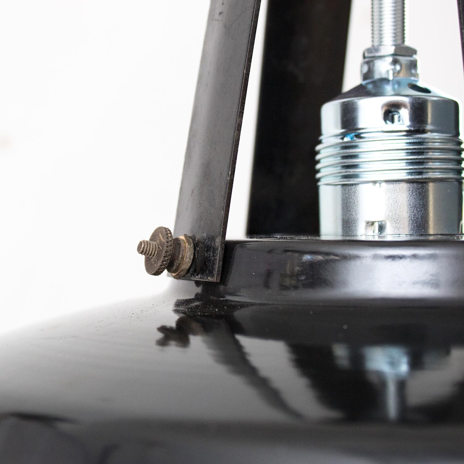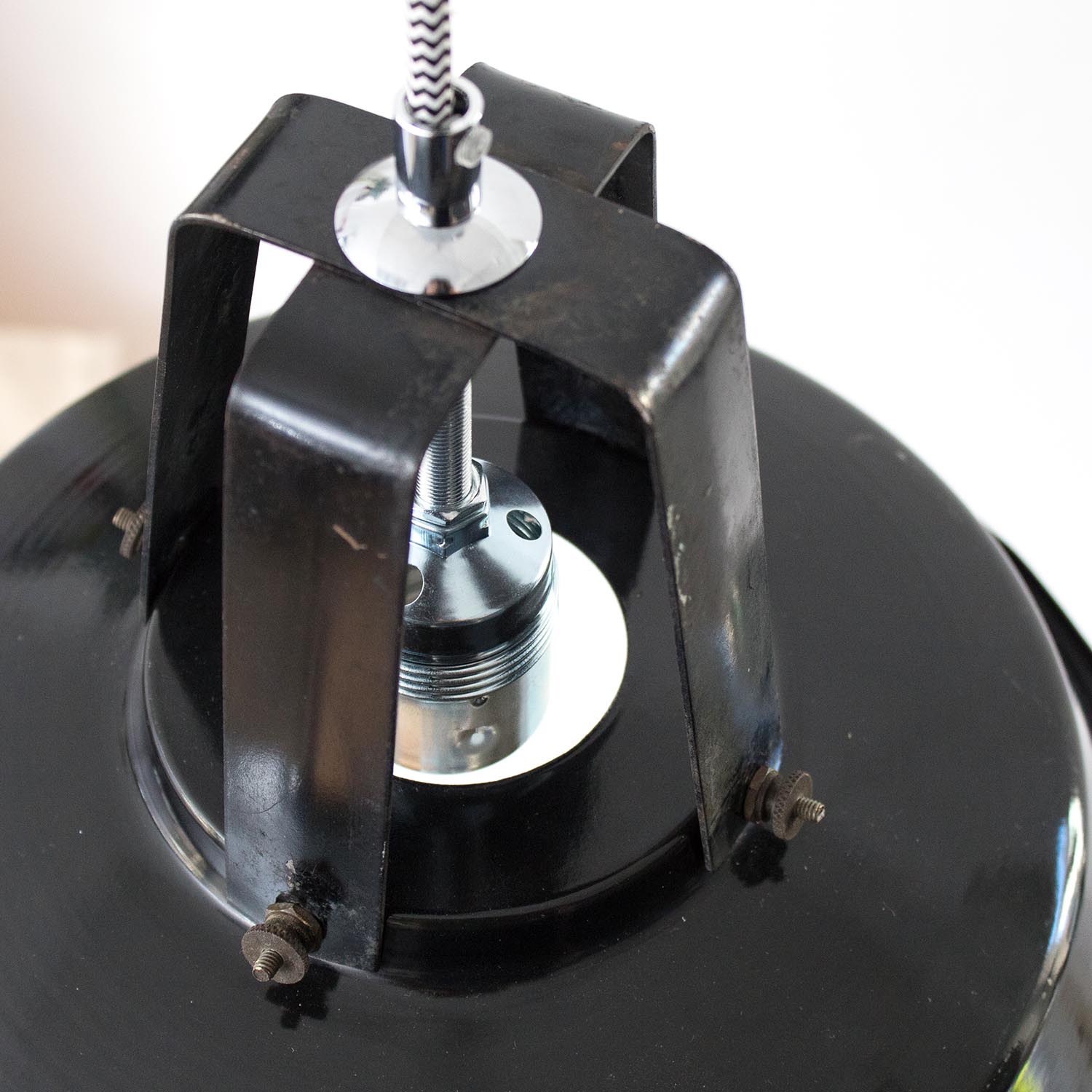 Diese Lampen wurden ursprünglich zur Beleuchtung von Montagehallen und Werkstätten konzipiert, so sorgten Sie ursprünglich für eine gleichmäßige Ausleuchtung von Arbeistbereichen. Durch die weiße Emaillierung im inneren der Leuchte wird dieser Effekt nochmals verstärkt. Jeder Lampenschirm ist ein Unikat und weist eine unverwechselbare Patina auf. Das Design der Leuchte orientierte sich einst eher an der Funktion, so überzeugen die Lampen von großer Sachlichkeit und zeitloser Ästhetik. Patina: Sichtbare Spuren der Zeit Material: Emailliertes Metall Farbe: Außen Schwarz, Innen Weiß Herkunft/Alter: Original Ebolicht (Erkennbar an dem kleinen Ring am Lampenschaft), Deutschland, ca. 1920 - 1940 Aufhängung: Direkt am Kabel Maße: Ø 40 cm, Höhe 32 cm zzgl. ca 3 cm Fassung Fassung: E27-Fassung**Textilkabel: Länge und Farbe nach deinen Wünschen. Im Grundpreis sind 1,2 Meter Textilkabel enthalten. Was haben wir mit deiner Lampe gemacht?Die Lampenschirme werden sorgfältig gereinigt, dabei wird die Patina so gut es geht erhalten. Anschließend werden die Leuchten komplett neu elektrifiziert, so dass sie den aktuellen Sicherheitsstandards entsprechen.Dein individuelles Licht mit GeschichteUm die Industrielampe zum individuellen Designstück zu machen, kannst du sie mit einem bunten Textilkabel nach deinen Vorstellungen gestalten. Wähle einfach ein Kabel aus und bestimme zusätzlich die ideale Länge des Kabels anhand deiner Gegebenheiten vor Ort. Im Grundpreis sind 1.2 m Kabel enthalten. Bei der Auswahl kannst du zwischen Längen bis 5 m wählen - auf direkte Nachfrage können wir auch ein deutlich längeres Kabel anbringen. Die Lampe richtig installierenUm die Elektroinstallation an der Decke zu verdecken kannst du entweder einen weißen oder schwarzen Baldachin aus Hartplastik (Ø 65 mm – Höhe 67 mm) wählen - dieser ist im Preis enthalten. Weitere Baldachine (z. B. Porzellan- oder Abzweig-Baldachine) sind im Shop verfügbar. In unserem Magazin findest du eine reihe hilfreicher Tipps, auch gerade dann wenn der Stromanschluss nicht an der Stelle ist, an dem die Lampe hängen soll.Wie kommt deine Lampe zu dir?Deine restaurierte JØLG Leuchte kommt fertig angeschlossen, nach deinen individuellen Vorgaben und inkl. einer Anleitung mit Tipps & Tricks, sicher und umweltfreundlich verpackt zu dir nach Hause. Wir versenden ausschließlich mit DHL GoGreen. Im Lieferumfang sind keine Leuchtmittel enthalten. Im Shop findest du aber eine passende Auswahl an LED-Leuchtmitteln. Achte hierbei auf die passende Größe des Lampensockels (E14 oder E27).Viel Freude und Inspiration beim Auswählen und Zusammenstellen deiner Lampe wünscht dir dein Team von JØLG.*Da es sich bei den Industrieleuchten um gebrauchte Antiquitäten handelt, unterliegen die Produkte gem. § 25a UStG der Differenzbesteuerung. Somit ist für diese Artikel kein gesonderter Umsatzsteuerausweis möglich.**Die Leuchte ist geeignet für Leuchtmittel aller Energieklassen. Glühlampen und Halogenlampen bis 60 Watt.