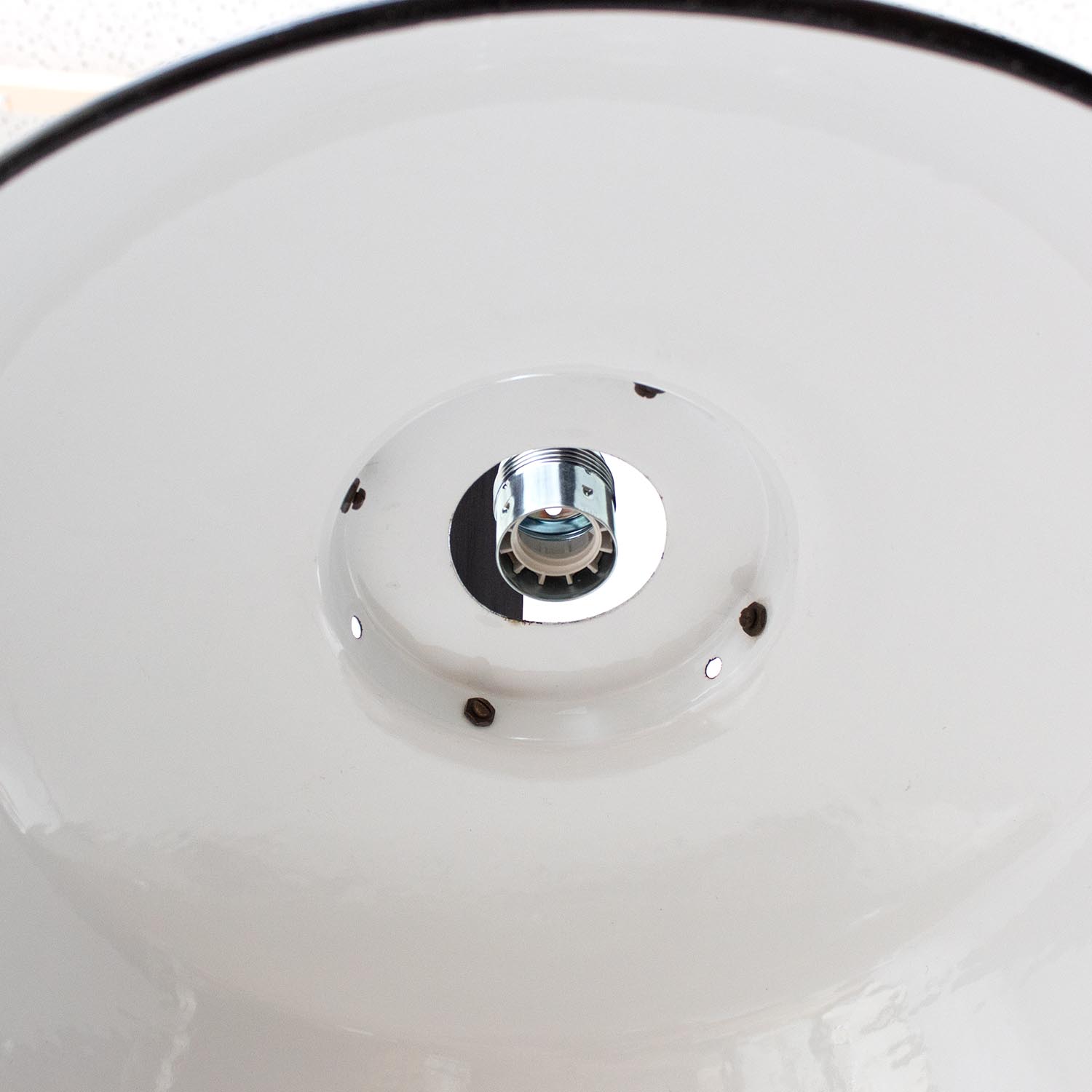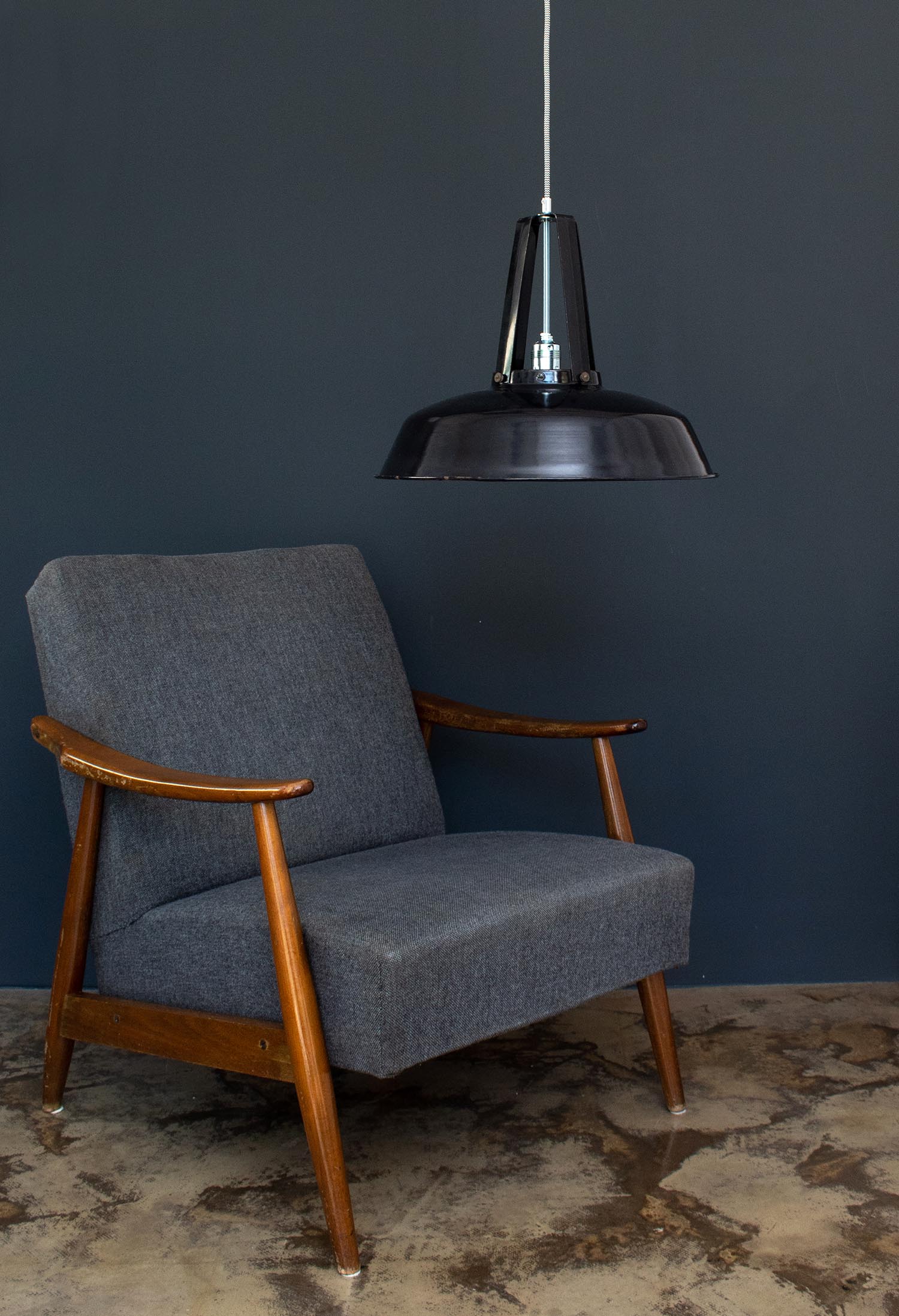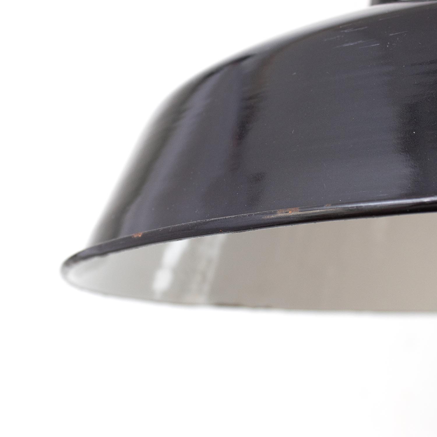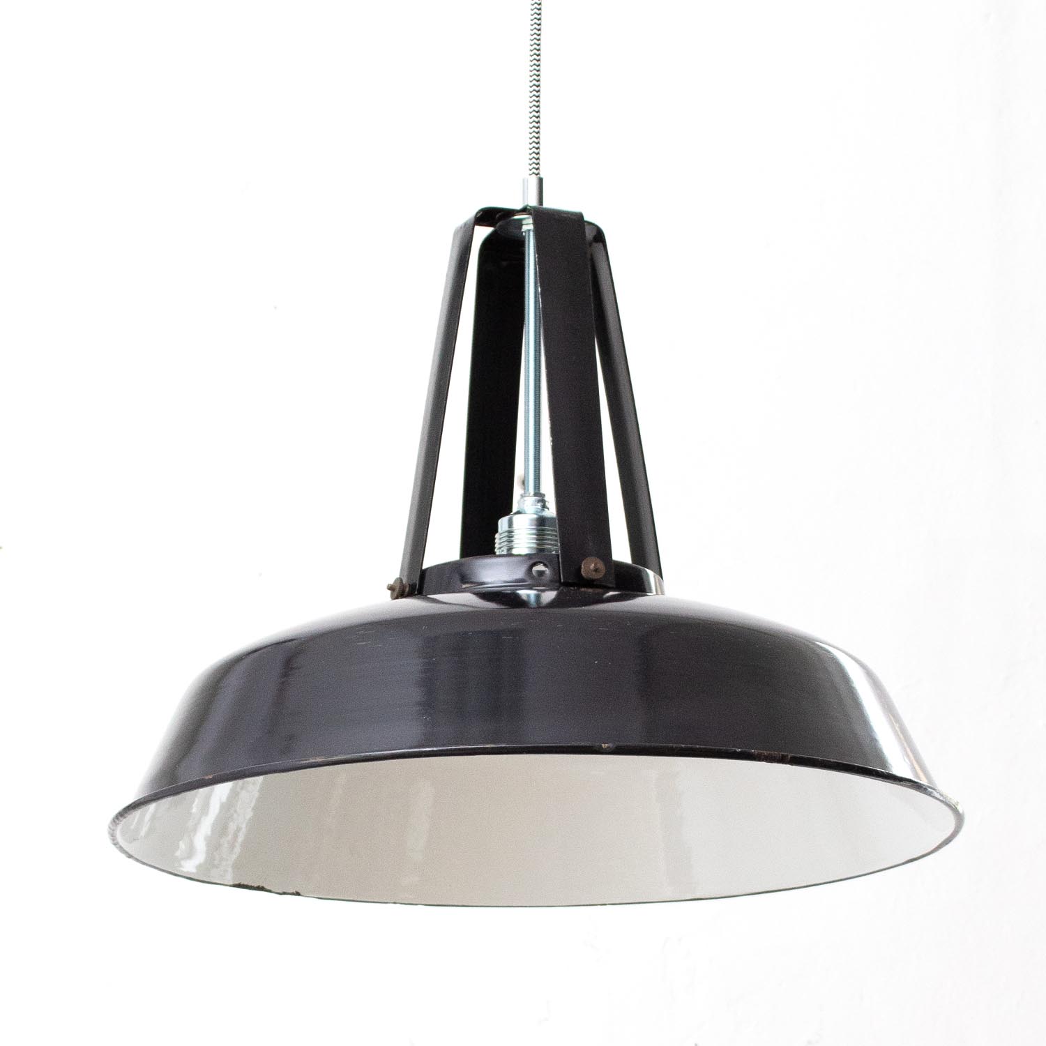 Diese Lampen wurden ursprünglich zur Beleuchtung von Montagehallen und Werkstätten konzipiert, so sorgten Sie ursprünglich für eine gleichmäßige Ausleuchtung von Arbeistbereichen. Durch die weiße Emaillierung im inneren der Leuchte wird dieser Effekt nochmals verstärkt. Jeder Lampenschirm ist ein Unikat und weist eine unverwechselbare Patina auf. Das Design der Leuchte orientierte sich an seiner Funktion, so überzeugen die Lampen von großer Sachlichkeit und zeitloser Ästhetik. Patina: Sichtbare Spuren der Zeit Material: Emailliertes Metall Farbe: Außen Schwarz, Innen Weiß Herkunft/Alter: Güterhalle in Brest/Bretagne, ca. 1930 - 1945 (Das Bild auf dem Rasen zeigt die Lampen nach dem Abbau und VOR der Aufarbeitung.) Aufhängung: An einer Kette Maße: Ø 45 cm, Höhe 33 cm zzgl. ca 5 cm Aufhängung Fassung: E27-Fassung** Textilkabel | Kette: Länge und Kabelfarbe nach deinen Wünschen. Im Grundpreis sind 1,0 Meter Rundstahlkette und 1,2 Meter Textilkabel enthalten. Was haben wir mit deiner Lampe gemacht?Die Lampenschirme werden sorgfältig gereinigt, dabei wird die Patina so gut es geht erhalten. Anschließend werden die Leuchten komplett neu elektrifiziert, so dass sie den aktuellen Sicherheitsstandards entsprechen.Dein individuelles Licht mit GeschichteUm die Industrielampe zum individuellen Designstück zu machen, kannst du sie mit einem bunten Textilkabel nach deinen Vorstellungen gestalten. Wähle einfach ein Kabel aus und bestimme zusätzlich die ideale Länge des Kabels anhand deiner Gegebenheiten vor Ort. Im Grundpreis sind 1.2 m Kabel und 1 m Rundstahlkette enthalten. Damit auf dem Stromkabel kein Zug ist, muss die Kette immer etwas kürzer sein als das Textilkabel. Bei der Auswahl kannst du zwischen Längen bis 5 m wählen - auf direkte Nachfrage können wir auch ein deutlich längeres Kabel/Kette anbringen. Die Lampe richtig installierenUm die Elektroinstallation an der Decke zu verdecken kannst du entweder einen weißen oder schwarzen Baldachin aus Hartplastik (Ø 65 mm – Höhe 67 mm) wählen - dieser ist im Preis enthalten. Weitere Baldachine (z. B. Porzellan- oder Abzweig-Baldachine) sind im Shop verfügbar. In unserem Magazin findest du eine reihe hilfreicher Tipps, auch gerade dann wenn der Stromanschluss nicht an der Stelle ist, an dem die Lampe hängen soll.Wie kommt deine Lampe zu dir?Deine restaurierte JØLG Leuchte kommt fertig angeschlossen, nach deinen individuellen Vorgaben und inkl. einer Anleitung mit Tipps & Tricks, sicher und umweltfreundlich verpackt zu dir nach Hause. Wir versenden ausschließlich mit DHL. Im Lieferumfang sind keine Leuchtmittel enthalten. Im Shop findest du aber eine passende Auswahl an LED-Leuchtmitteln. Achte hierbei auf die passende Größe des Lampensockels (E14 oder E27).Viel Freude und Inspiration beim Auswählen und Zusammenstellen deiner Lampe wünscht dir dein Team von JØLG.*Da es sich bei den Industrieleuchten um gebrauchte Antiquitäten handelt, unterliegen die Produkte gem. § 25a UStG der Differenzbesteuerung. Somit ist für diese Artikel kein gesonderter Umsatzsteuerausweis möglich.**Die Leuchte ist geeignet für Leuchtmittel aller Energieklassen. Glühlampen und Halogenlampen bis 60 Watt.
