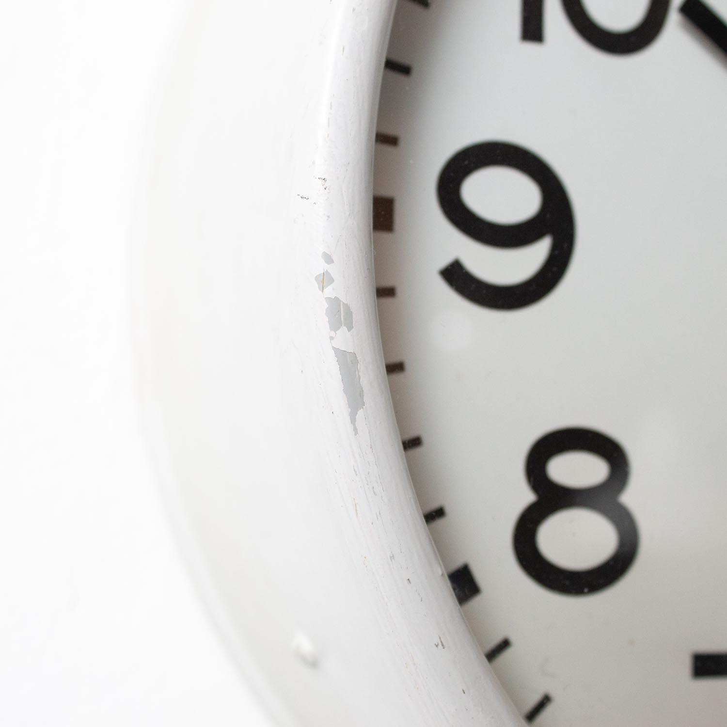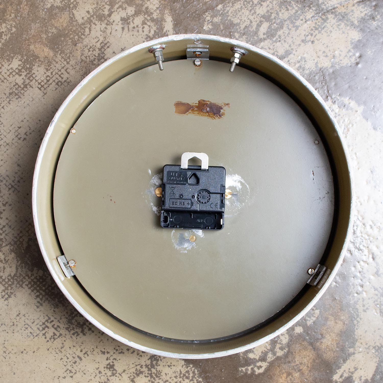 Diese alte Wanduhr war einst eine so genannte Nebenuhr und leistete ihren exakt getakteten Dienst in Fabriken, Industriebetrieben und Bahnhofshallen. Ursprünglich konnte diese Uhr (auch Slave Clock genannt) nur elektronisch mit einer Mutteruhr betrieben werden. Dies hatte den Zweck, dass wirklich jede Uhr in einer Fabrik auf die Sekunde genau gleich lief. Die vintage Wanduhr könnte deshalb in ihrem urspünglichen Zustand nicht mehr betrieben werden. Wir von JØLG haben sie deshalb mit einem Quarz-Uhrwerk umgebaut; dadurch erhält sie ein zweites Leben und kann nun mit einer normalen AA-Batterie betrieben werden. Ähnlich unserem Motto beim Restaurieren alter Industrielampen, heißt es auch hier: Alte Uhr – neue Technik!