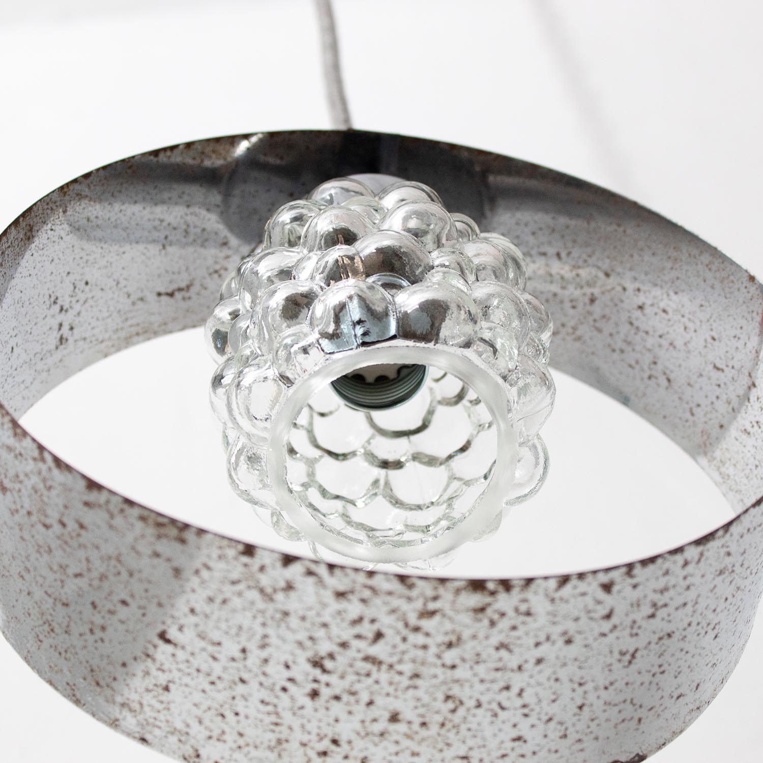 Angesagtes Spritzdekor mit schöner Patina aus den 1950er Jahren. Liebevoll restauriert schmücken diese Vintage-Lampen jetzt Küchen und Esszimmer, Flure und Wohnzimmer, Kinder- und Arbeitszimmer. So eine kleine Glasleuchte macht sich besonders gut als Spot oder Akzentlicht. Patina: Sichtbare Spuren der Zeit Material: Glas Aufhängung: Direkt am Kabel Maße: Ø 14 cm, Höhe 18 cm zzgl. ca 2 cm Fassung Fassung: E27-Fassung** Textilkabel: Länge und Farbe nach deinen Wünschen. Im Grundpreis sind 1,2 Meter Textilkabel enthalten. Was haben wir mit deiner Lampe gemacht?Die Lampenschirme werden sorgfältig gereinigt, dabei wird die Patina so gut es geht erhalten. Anschließend werden die Leuchten komplett neu elektrifiziert, so dass sie den aktuellen Sicherheitsstandards entsprechen.Dein individuelles Licht mit GeschichteUm die Industrielampe zum individuellen Designstück zu machen, kannst du sie mit einem bunten Textilkabel nach deinen Vorstellungen gestalten. Wähle einfach ein Kabel aus und bestimme zusätzlich die ideale Länge des Kabels anhand deiner Gegebenheiten vor Ort. Im Grundpreis sind 1.2 m Kabel enthalten. Bei der Auswahl kannst du zwischen Längen bis 5 m wählen - auf direkte Nachfrage können wir auch ein deutlich längeres Kabel anbringen. Die Lampe richtig installierenUm die Elektroinstallation an der Decke zu verdecken kannst du entweder einen weißen oder schwarzen Baldachin aus Hartplastik (Ø 65 mm – Höhe 67 mm) wählen - dieser ist im Preis enthalten. Weitere Baldachine (z. B. Porzellan- oder Abzweig-Baldachine) sind im Shop verfügbar. In unserem Magazin findest du eine reihe hilfreicher Tipps, auch gerade dann wenn der Stromanschluss nicht an der Stelle ist, an dem die Lampe hängen soll.Wie kommt deine Lampe zu dir?Deine restaurierte JØLG Leuchte kommt fertig angeschlossen, nach deinen individuellen Vorgaben und inkl. einer Anleitung mit Tipps & Tricks, sicher und umweltfreundlich verpackt zu dir nach Hause. Wir versenden ausschließlich mit DHL GoGreen. Im Lieferumfang sind keine Leuchtmittel enthalten. Im Shop findest du aber eine passende Auswahl an LED-Leuchtmitteln. Achte hierbei auf die passende Größe des Lampensockels (E14 oder E27).Viel Freude und Inspiration beim Auswählen und Zusammenstellen deiner Lampe wünscht dir dein Team von JØLG.*Da es sich bei den Industrieleuchten um gebrauchte Antiquitäten handelt, unterliegen die Produkte gem. § 25a UStG der Differenzbesteuerung. Somit ist für diese Artikel kein gesonderter Umsatzsteuerausweis möglich.**Die Leuchte ist geeignet für Leuchtmittel aller Energieklassen. Glühlampen und Halogenlampen bis 60 Watt.