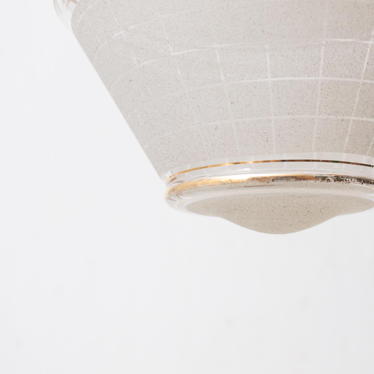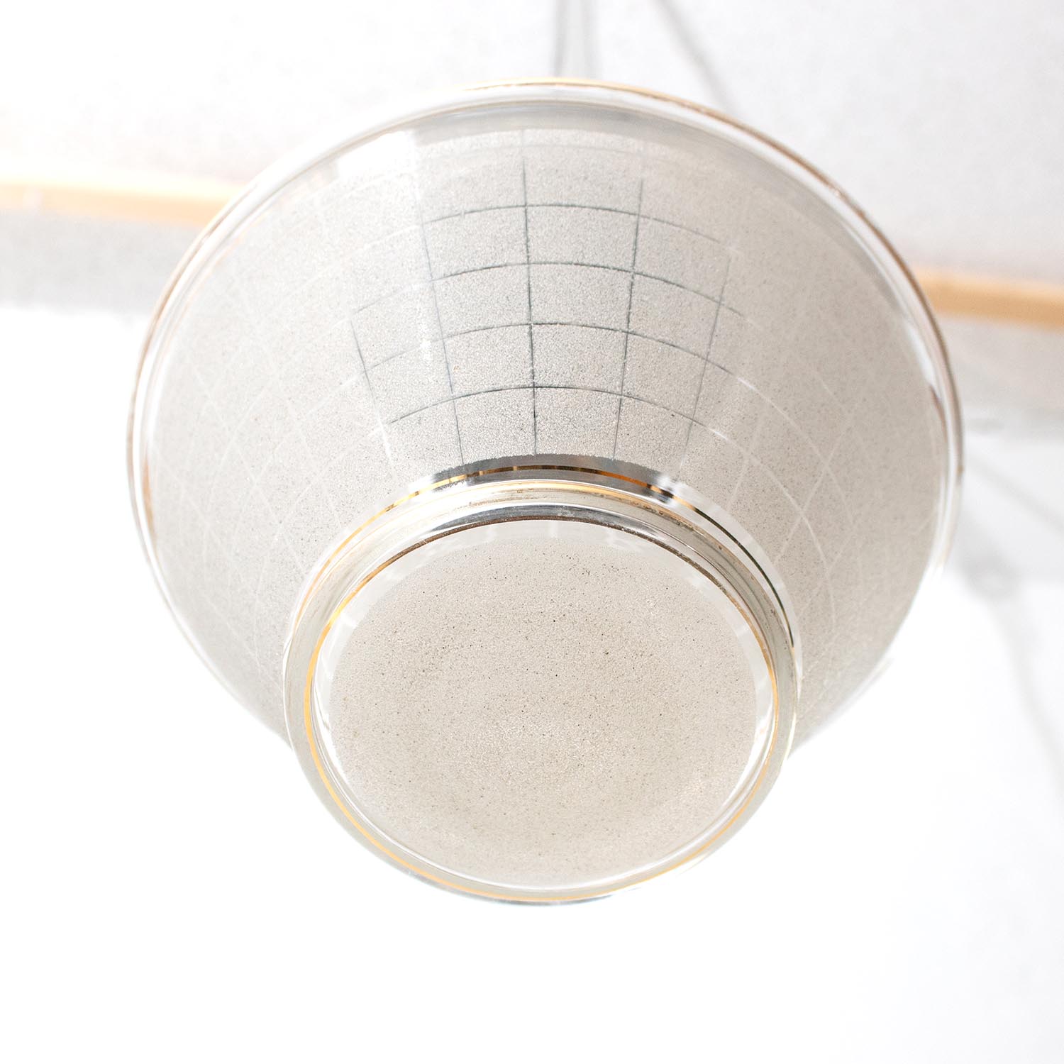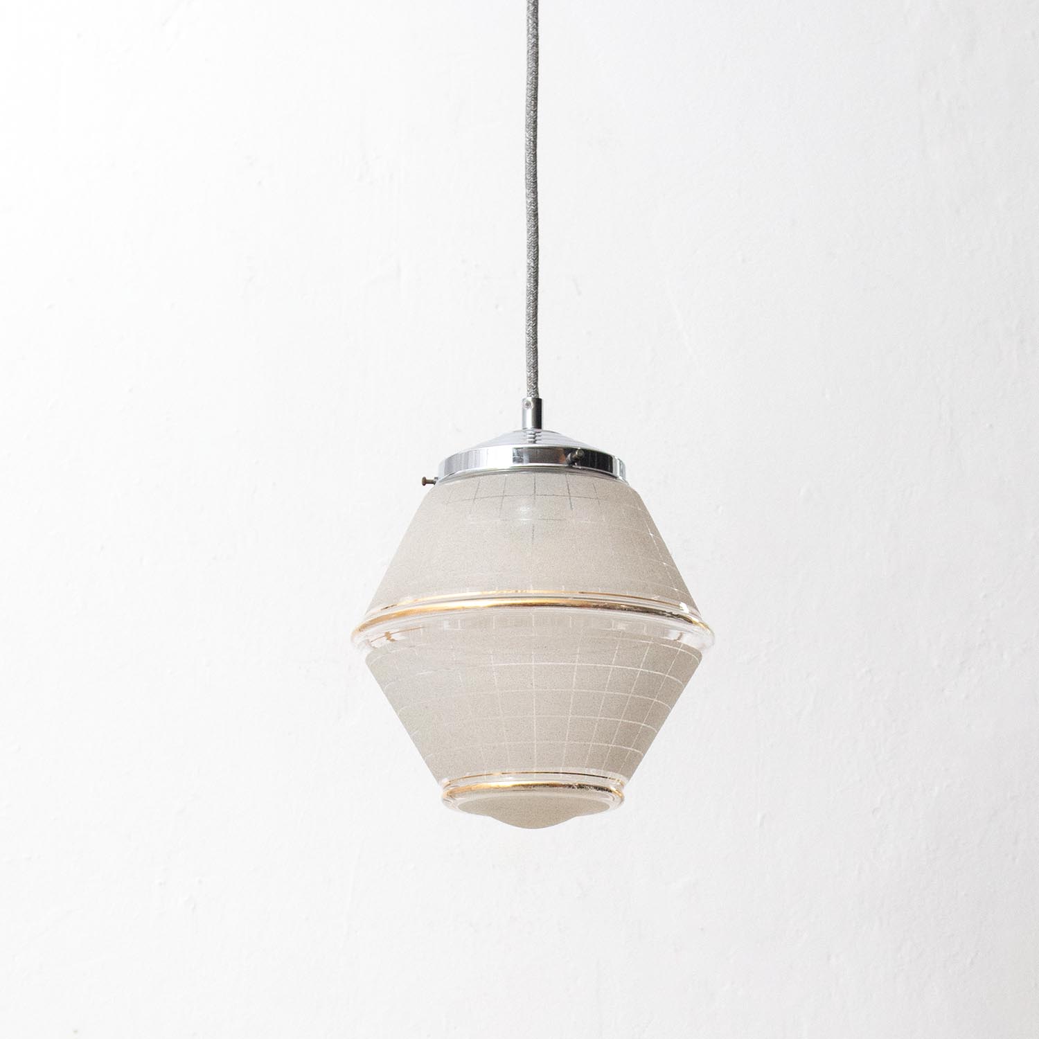 Deine einzigartige vintage Glas-Hängelampe: Uns erinnert die hübsche und elegante Leuchte an einen geschliffenen Diamanten - ein tolles Stück Zeitgeschichte aus Frankreich - gerade der Wechsel von satiniertem und klarem Glas machen die Leuchte zu einem raffinierten Unikat. Patina: Wenige Spuren der Zeit Material: Glas Aufhängung: Direkt am Kabel Maße: Ø 14 cm, Höhe mit Kappe 21 cm zzgl. ca 2 cm Fassung Fassung: E27-Fassung** Textilkabel: Länge und Farbe nach deinen Wünschen. Im Grundpreis sind 1,2 Meter Textilkabel enthalten. Was haben wir mit deiner Lampe gemacht?Die Lampenschirme werden sorgfältig gereinigt, dabei wird die Patina so gut es geht erhalten. Anschließend werden die Leuchten komplett neu elektrifiziert, so dass sie den aktuellen Sicherheitsstandards entsprechen.Dein individuelles Licht mit GeschichteUm die Industrielampe zum individuellen Designstück zu machen, kannst du sie mit einem bunten Textilkabel nach deinen Vorstellungen gestalten. Wähle einfach ein Kabel aus und bestimme zusätzlich die ideale Länge des Kabels anhand deiner Gegebenheiten vor Ort. Im Grundpreis sind 1.2 m Kabel enthalten. Bei der Auswahl kannst du zwischen Längen bis 5 m wählen - auf direkte Nachfrage können wir auch ein deutlich längeres Kabel anbringen. Die Lampe richtig installierenUm die Elektroinstallation an der Decke zu verdecken kannst du entweder einen weißen oder schwarzen Baldachin aus Hartplastik (Ø 65 mm – Höhe 67 mm) wählen - dieser ist im Preis enthalten. Weitere Baldachine (z. B. Porzellan- oder Abzweig-Baldachine) sind im Shop verfügbar. In unserem Magazin findest du eine reihe hilfreicher Tipps, auch gerade dann wenn der Stromanschluss nicht an der Stelle ist, an dem die Lampe hängen soll.Wie kommt deine Lampe zu dir?Deine restaurierte JØLG Leuchte kommt fertig angeschlossen, nach deinen individuellen Vorgaben und inkl. einer Anleitung mit Tipps & Tricks, sicher und umweltfreundlich verpackt zu dir nach Hause. Wir versenden ausschließlich mit DHL GoGreen. Im Lieferumfang sind keine Leuchtmittel enthalten. Im Shop findest du aber eine passende Auswahl an LED-Leuchtmitteln. Achte hierbei auf die passende Größe des Lampensockels (E14 oder E27).Viel Freude und Inspiration beim Auswählen und Zusammenstellen deiner Lampe wünscht dir dein Team von JØLG.*Da es sich bei den Industrieleuchten um gebrauchte Antiquitäten handelt, unterliegen die Produkte gem. § 25a UStG der Differenzbesteuerung. Somit ist für diese Artikel kein gesonderter Umsatzsteuerausweis möglich.**Die Leuchte ist geeignet für Leuchtmittel aller Energieklassen. Glühlampen und Halogenlampen bis 60 Watt.