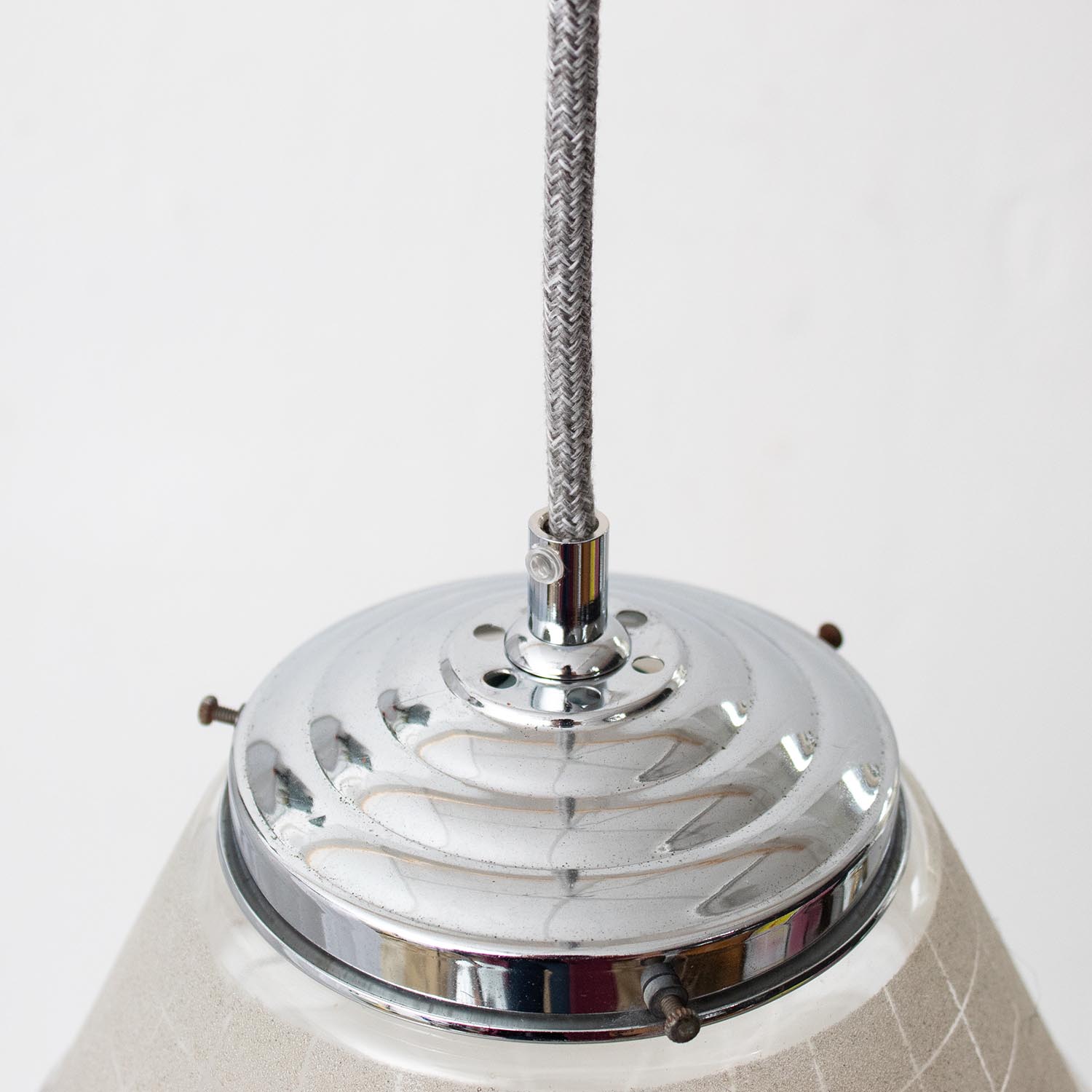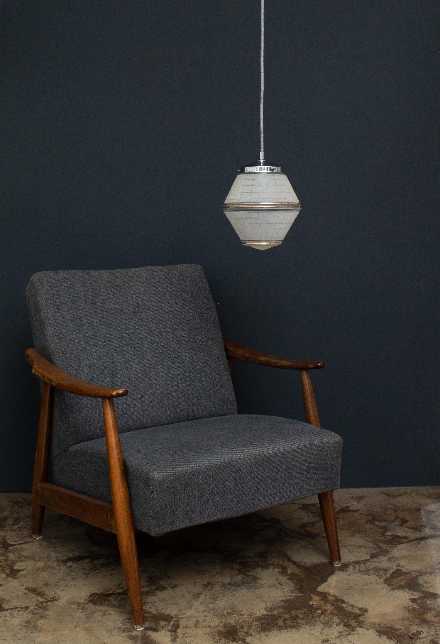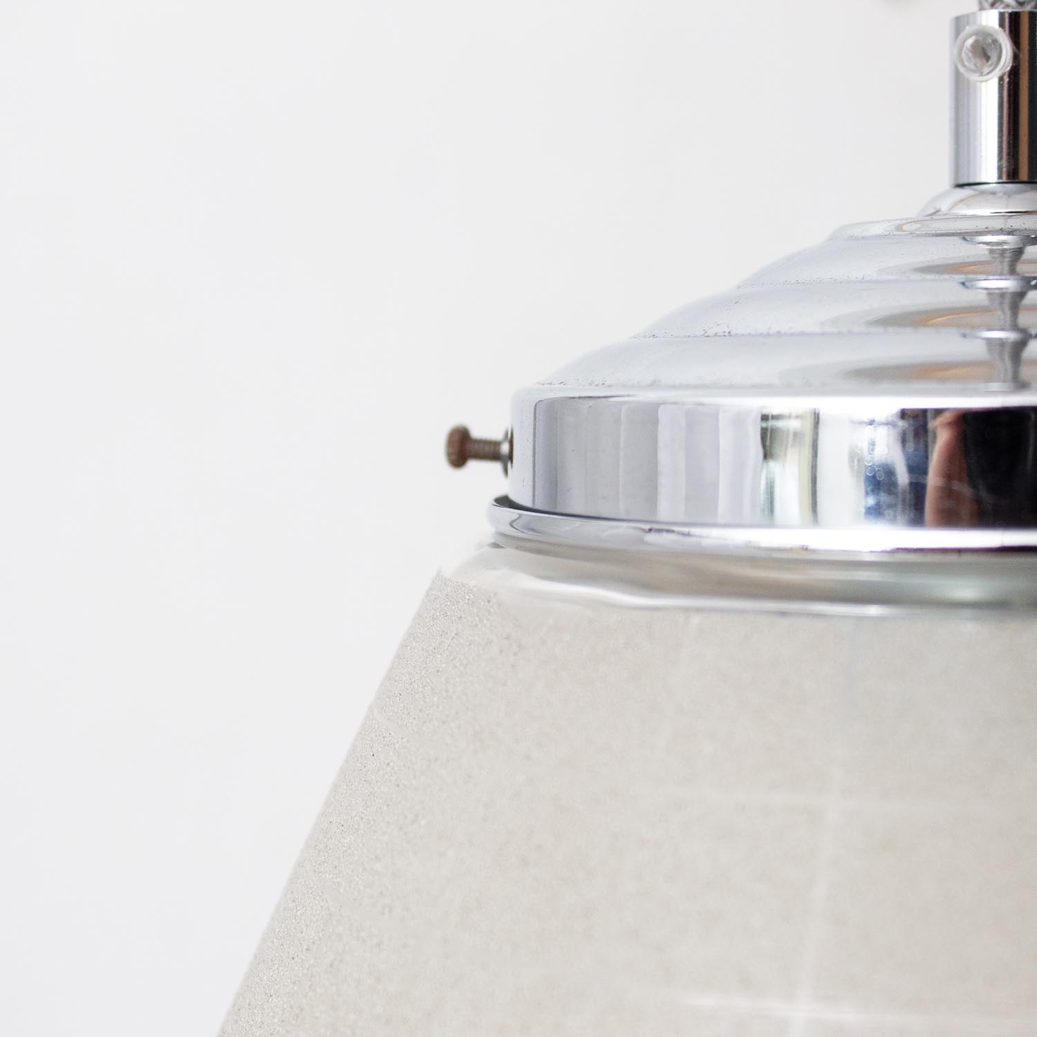 Diese raffinierte Schönheit stammt, wie all unsere JØLG-Industrieleuchten, aus Fabriken, Häusern und Werkstätten in ganz Europa. Frisch restauriert schmücken diese Vintage-Lampen jetzt Küchen und Esszimmer, Flure und Wohnzimmer, Kinder- und Arbeitszimmer. Raffinierte Kristallglasoptik und eine ansprechende Form machen diese Leuchte aus den 1960er Jahren zu einem authentischen Blickfang. Schönes Akzentlicht. Patina: Leichte Spuren der Zeit Material: Glas, Metall/Chrom Farbe: Silber/Chrom/Glas Alter/Herkunft: 1960, stammt aus dem Wohnzimmer einer alten Jugendstilvilla Aufhängung: Direkt am Kabel Maße: Ø 10 cm (unten), Höhe gesamt mit Pendelstab 28 cm Fassung: E27-Fassung** Textilkabel: Länge und Farbe nach deinen Wünschen. Im Grundpreis sind 1,2 Meter Textilkabel enthalten. Was haben wir mit deiner Lampe gemacht?Die Lampenschirme werden sorgfältig gereinigt, dabei wird die Patina so gut es geht erhalten. Anschließend werden die Leuchten komplett neu elektrifiziert, so dass sie den aktuellen Sicherheitsstandards entsprechen.Dein individuelles Licht mit GeschichteUm die Industrielampe zum individuellen Designstück zu machen, kannst du sie mit einem bunten Textilkabel nach deinen Vorstellungen gestalten. Wähle einfach ein Kabel aus und bestimme zusätzlich die ideale Länge des Kabels anhand deiner Gegebenheiten vor Ort. Im Grundpreis sind 1.2 m Kabel enthalten. Bei der Auswahl kannst du zwischen Längen bis 5 m wählen - auf direkte Nachfrage können wir auch ein deutlich längeres Kabel anbringen. Die Lampe richtig installierenUm die Elektroinstallation an der Decke zu verdecken kannst du entweder einen weißen oder schwarzen Baldachin aus Hartplastik (Ø 65 mm – Höhe 67 mm) wählen - dieser ist im Preis enthalten. Weitere Baldachine (z. B. Porzellan- oder Abzweig-Baldachine) sind im Shop verfügbar. In unserem Magazin findest du eine reihe hilfreicher Tipps, auch gerade dann wenn der Stromanschluss nicht an der Stelle ist, an dem die Lampe hängen soll.Wie kommt deine Lampe zu dir?Deine restaurierte JØLG Leuchte kommt fertig angeschlossen, nach deinen individuellen Vorgaben und inkl. einer Anleitung mit Tipps & Tricks, sicher und umweltfreundlich verpackt zu dir nach Hause. Wir versenden ausschließlich mit DHL GoGreen. Im Lieferumfang sind keine Leuchtmittel enthalten. Im Shop findest du aber eine passende Auswahl an LED-Leuchtmitteln. Achte hierbei auf die passende Größe des Lampensockels (E14 oder E27).Viel Freude und Inspiration beim Auswählen und Zusammenstellen deiner Lampe wünscht dir dein Team von JØLG.*Da es sich bei den Industrieleuchten um gebrauchte Antiquitäten handelt, unterliegen die Produkte gem. § 25a UStG der Differenzbesteuerung. Somit ist für diese Artikel kein gesonderter Umsatzsteuerausweis möglich.**Die Leuchte ist geeignet für Leuchtmittel aller Energieklassen. Glühlampen und Halogenlampen bis 60 Watt.