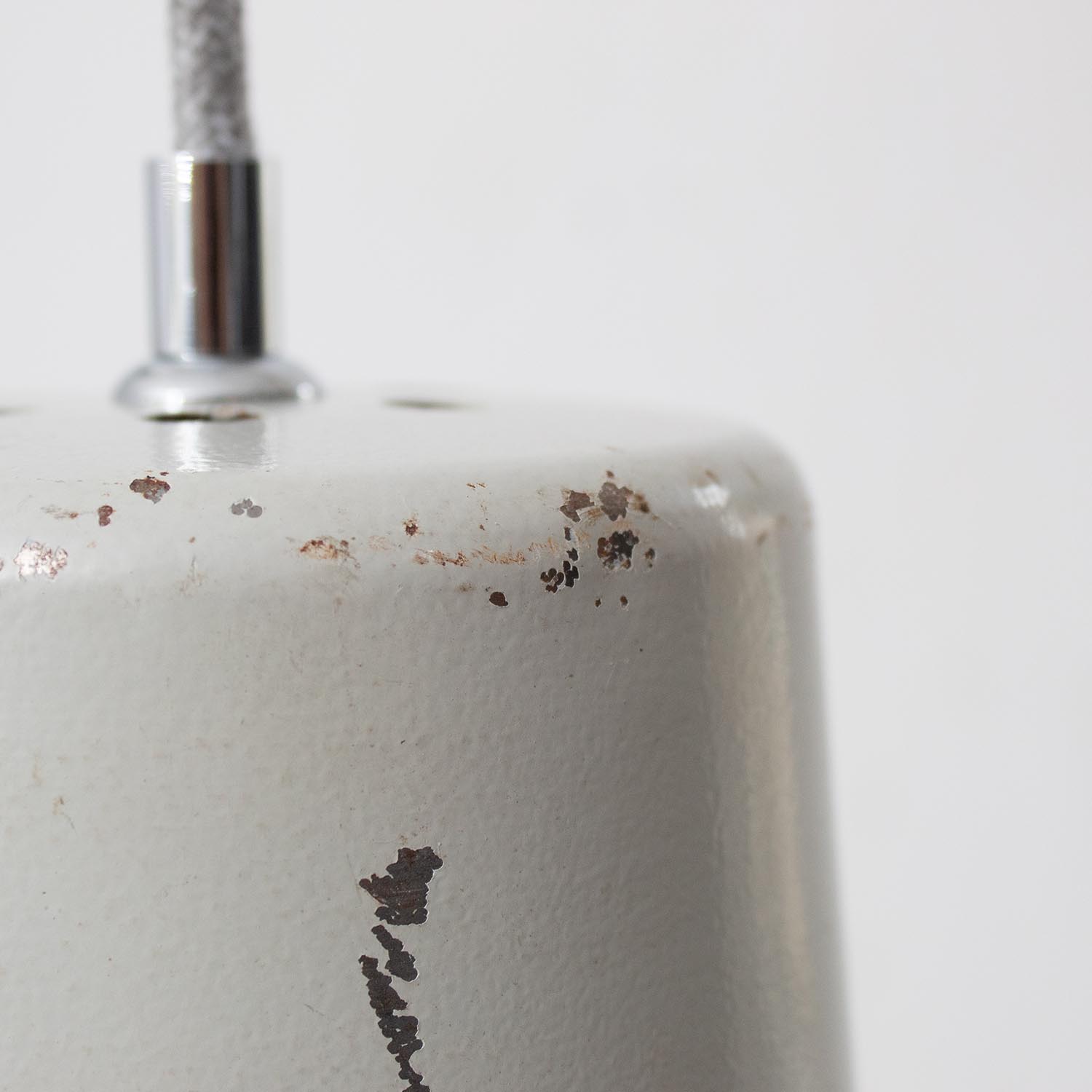 Aus alten Fabriken, Werkstätten und Scheunen in Frankreich und ganz Europa geborgen, bringt jede JØLG-Industrieleuchte ihre eigene Geschichte mit in deine vier Wände. Jeder Lampenschirm ist ein Unikat und weist eine unverwechselbare Patina auf. Patina: Sichtbare Spuren der Zeit Material: Emailliertes Metall Farbe: Außen kühles Hellgrau, Innen Weiß Herkunft/Alter: ZAOS Polen, ca. 1950 - 1960 Aufhängung: Direkt am Kabel Maße: Ø 32 cm, Höhe 21 cm zzgl. ca 3 cm Aufhängung Fassung: E27-Fassung** Textilkabel: Länge und Farbe nach deinen Wünschen. Im Grundpreis sind 1,2 Meter Textilkabel enthalten. Was haben wir mit deiner Lampe gemacht?Die Lampenschirme werden sorgfältig gereinigt, dabei wird die Patina so gut es geht erhalten. Anschließend werden die Leuchten komplett neu elektrifiziert, so dass sie den aktuellen Sicherheitsstandards entsprechen.Dein individuelles Licht mit GeschichteUm die Industrielampe zum individuellen Designstück zu machen, kannst du sie mit einem bunten Textilkabel nach deinen Vorstellungen gestalten. Wähle einfach ein Kabel aus und bestimme zusätzlich die ideale Länge des Kabels anhand deiner Gegebenheiten vor Ort. Im Grundpreis sind 1.2 m Kabel enthalten. Bei der Auswahl kannst du zwischen Längen bis 5 m wählen - auf direkte Nachfrage können wir auch ein deutlich längeres Kabel anbringen. Die Lampe richtig installierenUm die Elektroinstallation an der Decke zu verdecken kannst du entweder einen weißen oder schwarzen Baldachin aus Hartplastik (Ø 65 mm – Höhe 67 mm) wählen - dieser ist im Preis enthalten. Weitere Baldachine (z. B. Porzellan- oder Abzweig-Baldachine) sind im Shop verfügbar. In unserem Magazin findest du eine reihe hilfreicher Tipps, auch gerade dann wenn der Stromanschluss nicht an der Stelle ist, an dem die Lampe hängen soll.Wie kommt deine Lampe zu dir?Deine restaurierte JØLG Leuchte kommt fertig angeschlossen, nach deinen individuellen Vorgaben und inkl. einer Anleitung mit Tipps & Tricks, sicher und umweltfreundlich verpackt zu dir nach Hause. Wir versenden ausschließlich mit DHL GoGreen. Im Lieferumfang sind keine Leuchtmittel enthalten. Im Shop findest du aber eine passende Auswahl an LED-Leuchtmitteln. Achte hierbei auf die passende Größe des Lampensockels (E14 oder E27).Viel Freude und Inspiration beim Auswählen und Zusammenstellen deiner Lampe wünscht dir dein Team von JØLG.*Da es sich bei den Industrieleuchten um gebrauchte Antiquitäten handelt, unterliegen die Produkte gem. § 25a UStG der Differenzbesteuerung. Somit ist für diese Artikel kein gesonderter Umsatzsteuerausweis möglich.**Die Leuchte ist geeignet für Leuchtmittel aller Energieklassen. Glühlampen und Halogenlampen bis 60 Watt.