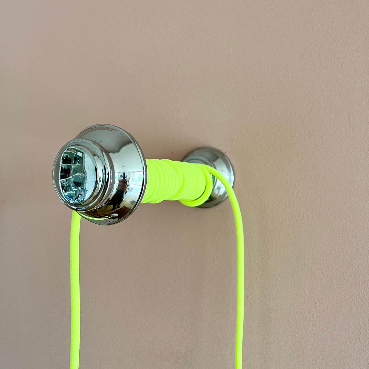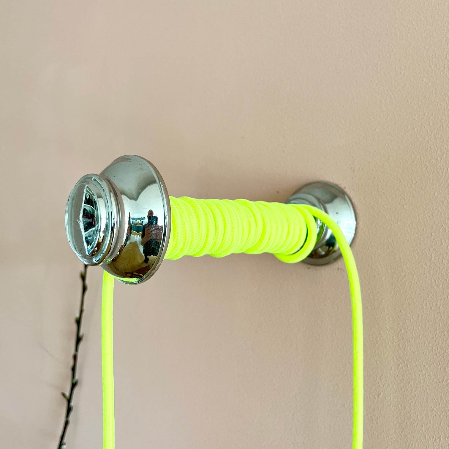 Deine DIY vintage Wandleuchte stammt aus der Mitte des letzten Jahrtausends. Wir vermuten die Halterungen waren einst mal Regalhalter - wir finden sie aber genial als DIY Wandleuchte. Durch das aufgerollte Kabel kann die Pendelleuchte durch zug auch in der Höhe verstellt werden. Für das aufgerollte Kabel sollte ca. 1 Meter gerechnet werden.